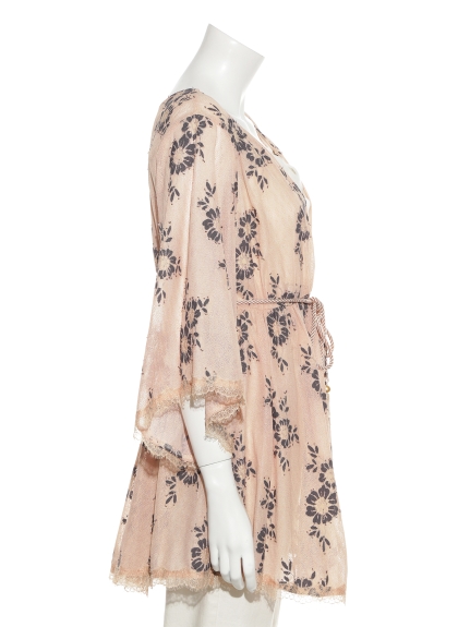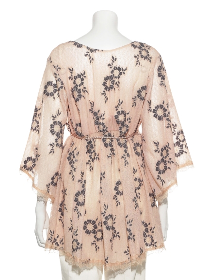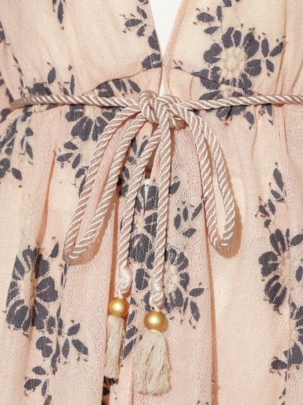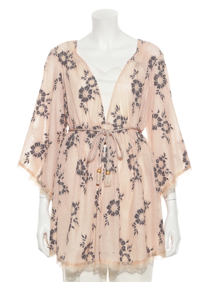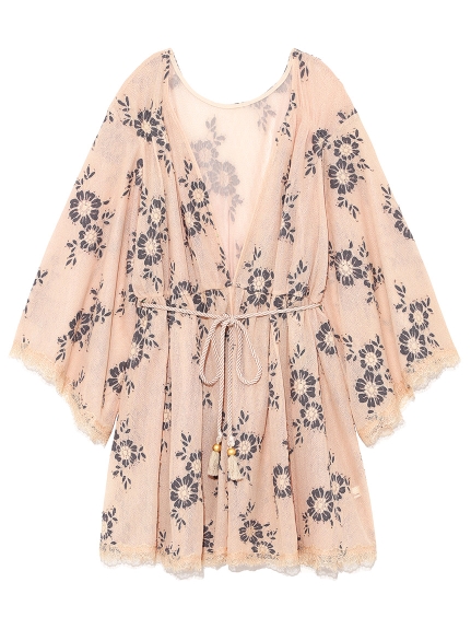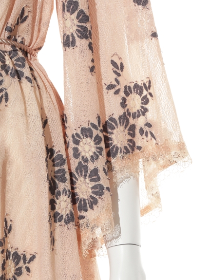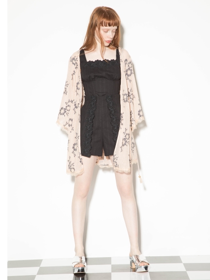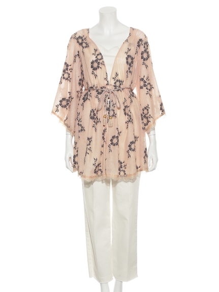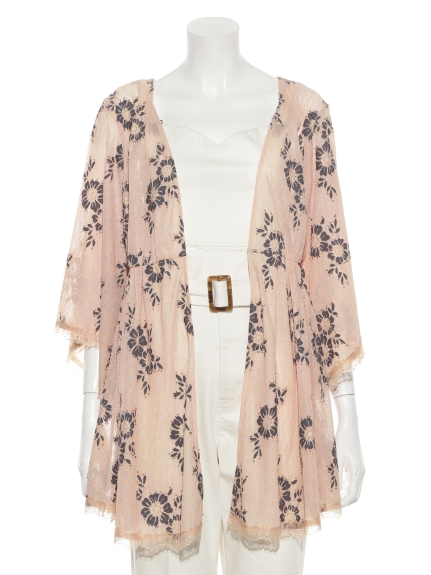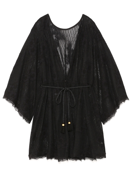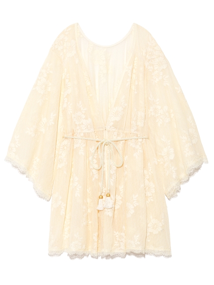レースをふんだんに使った贅沢なガウンは、ロマンティクな雰囲気満載。袖口と裾にはさらに繊細なヒゲレースをあしらうことで、さらに可憐な雰囲気に仕上げました。フリンジの付いた紐ベルトでしばっても、縛らずに垂らしてきれいな落ち感を楽しんでも。キャミソール×デニムはもちろん、夏ならショートパンンツに合わせるのも。リゾートに持っていき、水着の上に羽織っても美しく決まるはず。