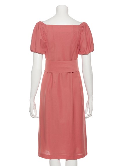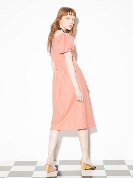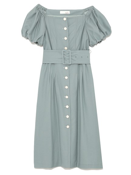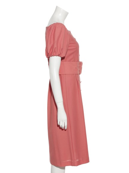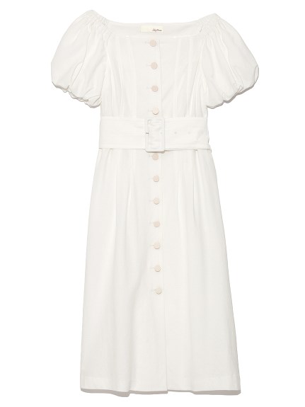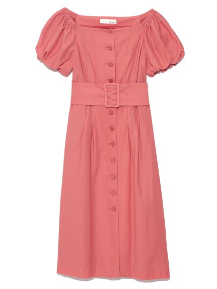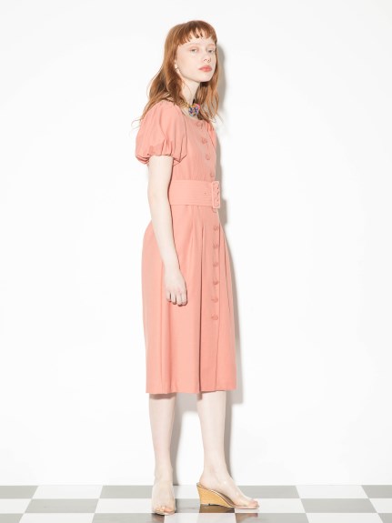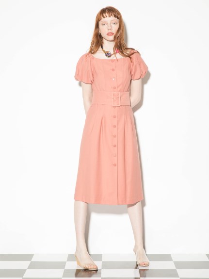前面にボタンを配し、さらに共布の太ベルトでポイントを加えたデザインワンピース。大胆に肩を出しても大人っぽいし、あえて出さずに袖のパフスリーブを強調しても。