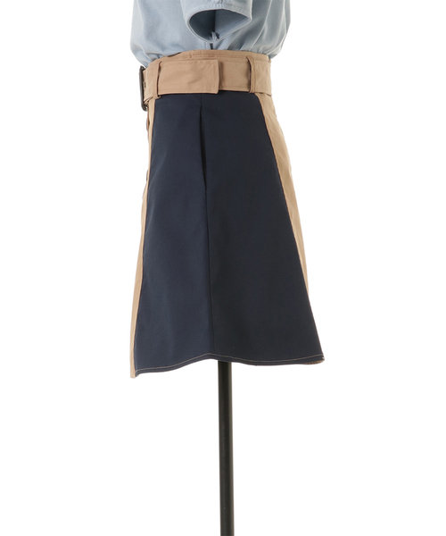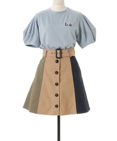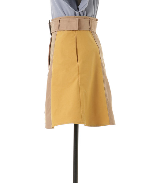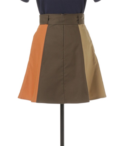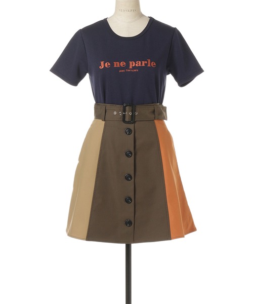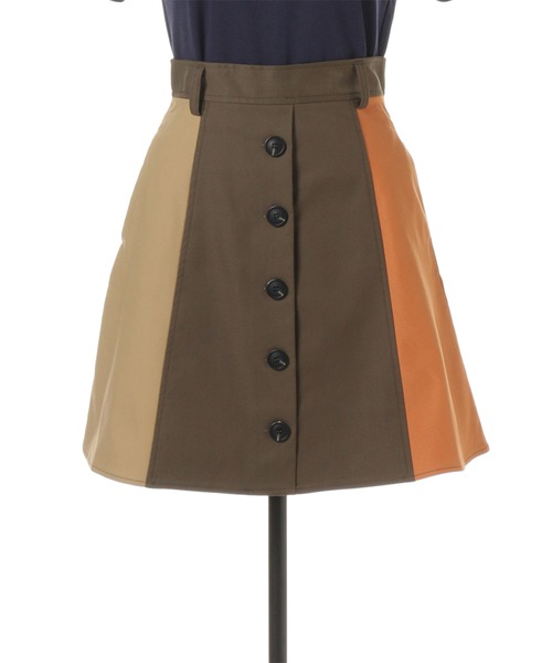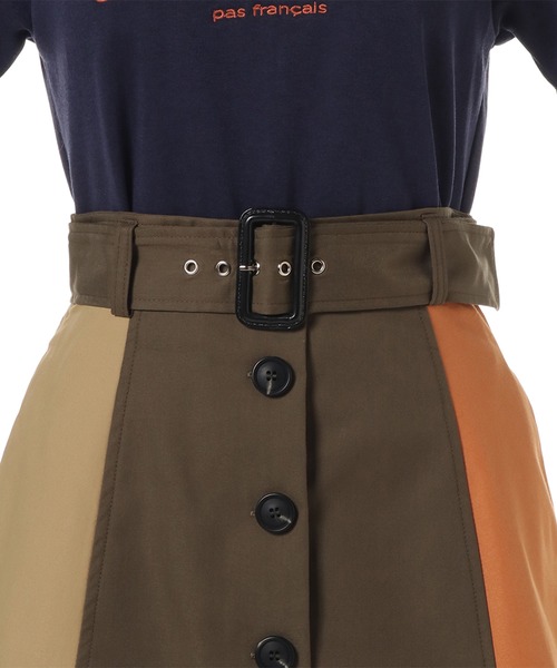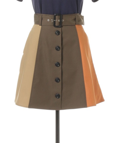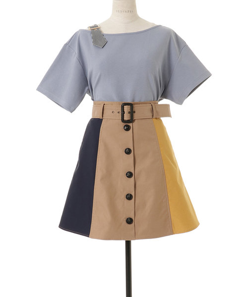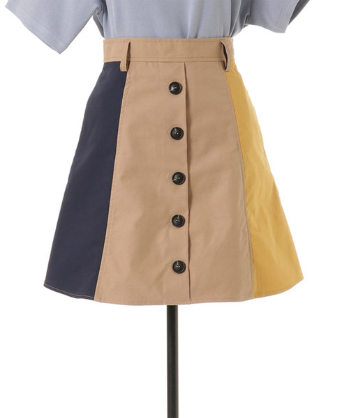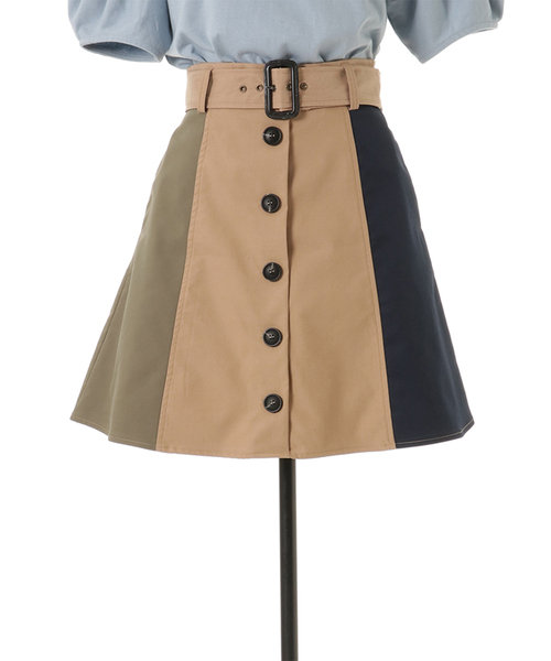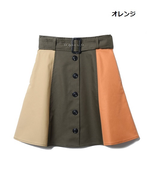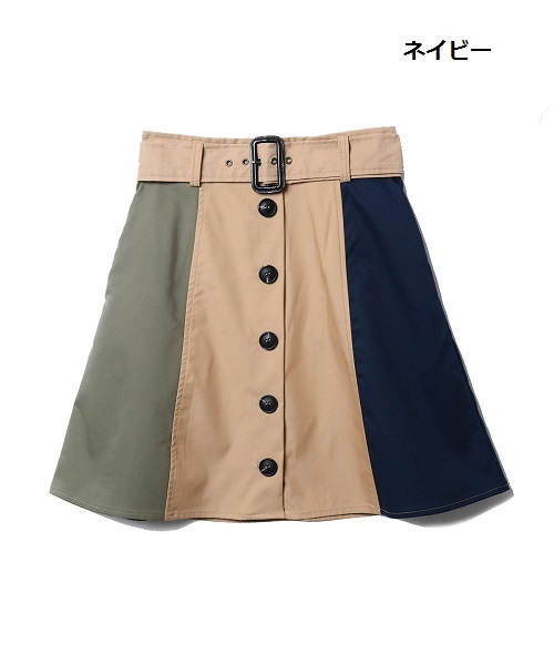 REDYAZELらしい3配色のブロッキングスカート。フロントボタンでトレンチ風なデザインです。ウエストベルト付きのAラインで腰回りをすっきり見せてくれます。ロゴTシャツと合わせてカジュアルに、ブラウスと合わせてきれいめに。今すぐから秋まで長く使えるアイテムです。