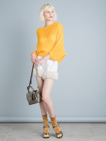 ざっくりと編んだ手編み風のカジュアルな編地で、ドルマンスリーブのエレガントなニットをつくりました。後ろはレースアップ仕様になっているので、女性らしいバックスタイルに。上半身はニットの中で泳がせつつ、ボトムスはスティックパンツやタイトシルエットのスカートを合わせると、甘辛バランスの取れた旬のコーディネートに。