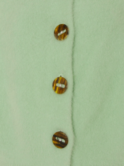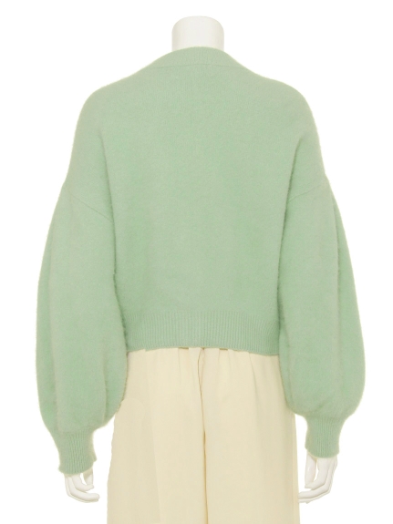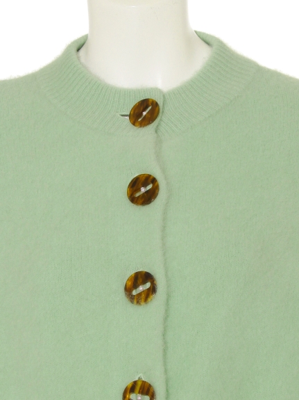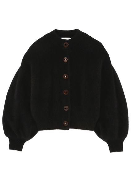 タックをあしらったボリューミーな袖が女性らしいカーディガンの登場。べっ甲カラーとパールを合わせたオリジナルデザインのボタンがレトロなアクセントになっています。