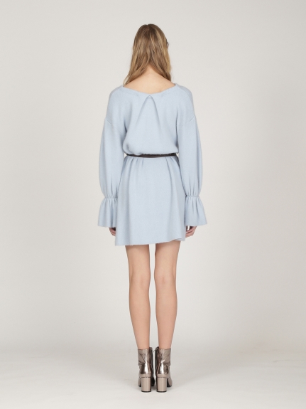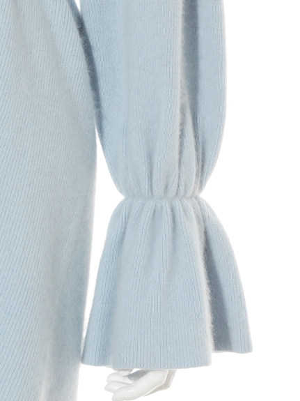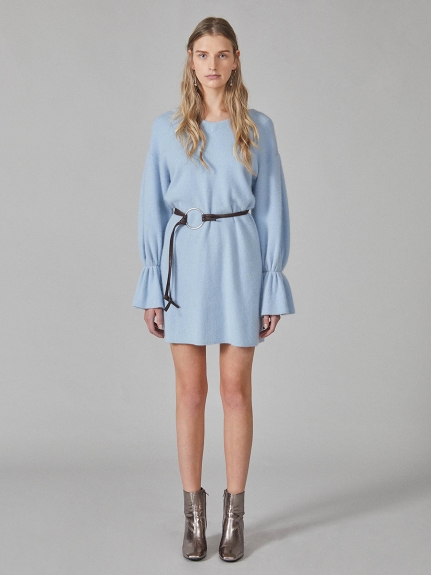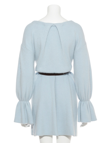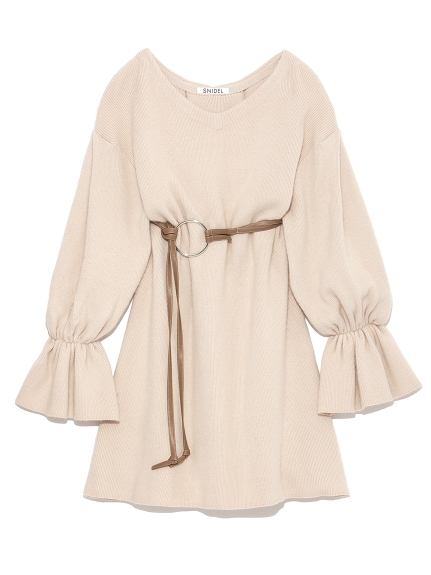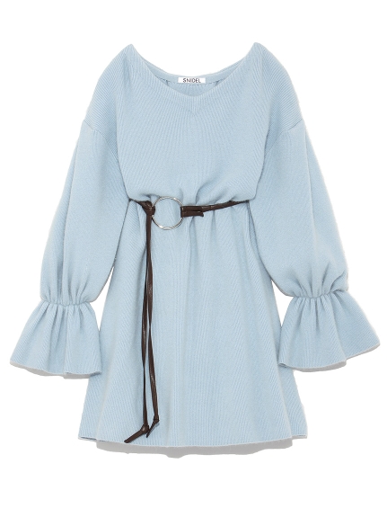 ゆったりとしたパフスリーブから、袖口をキュッと絞ったデザインが可愛らしいニットワンピース。デコルテラインを美しく魅せる、広めのVネックが女性らしく、リングバックルの付いたウエストの細ベルトでメリハリのあるシルエットに。一枚でさらりと着こなしたいフェミニンワンピースです。