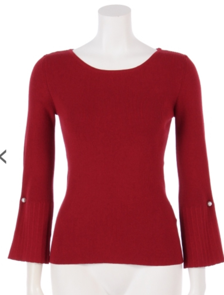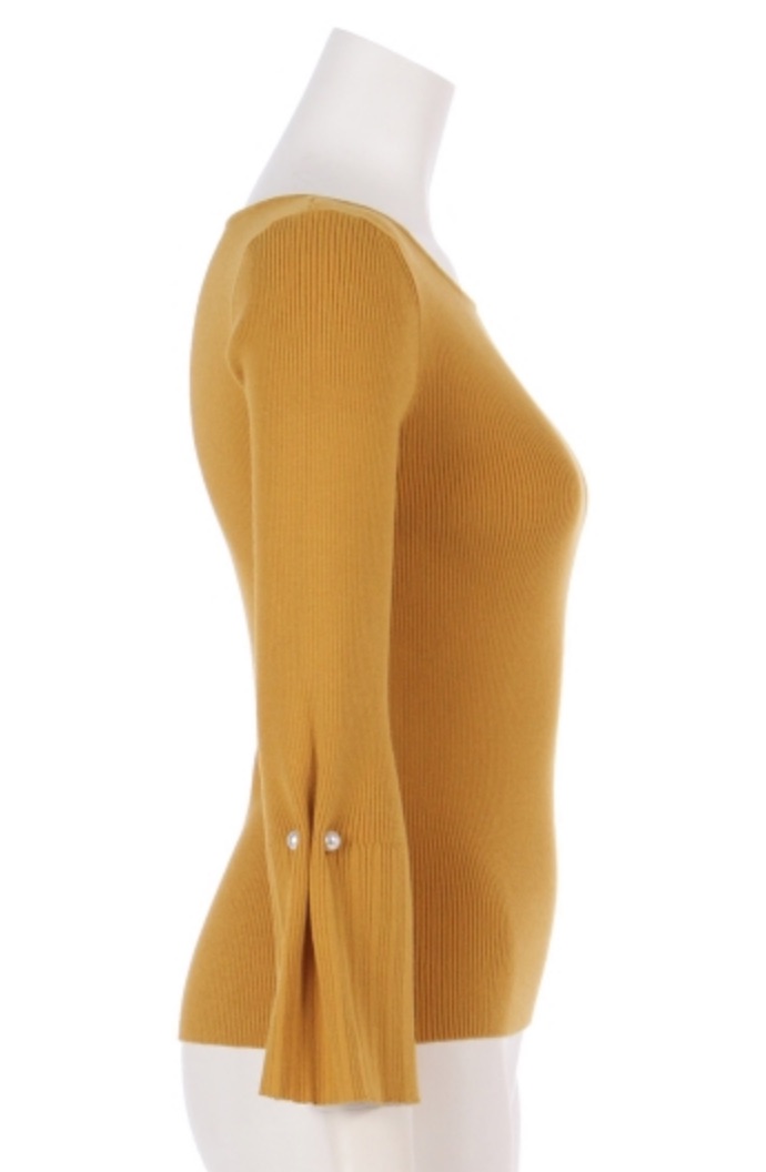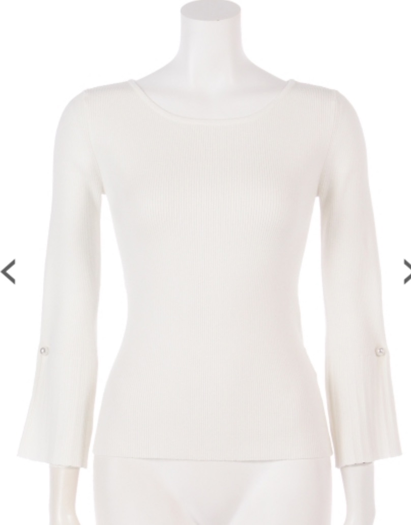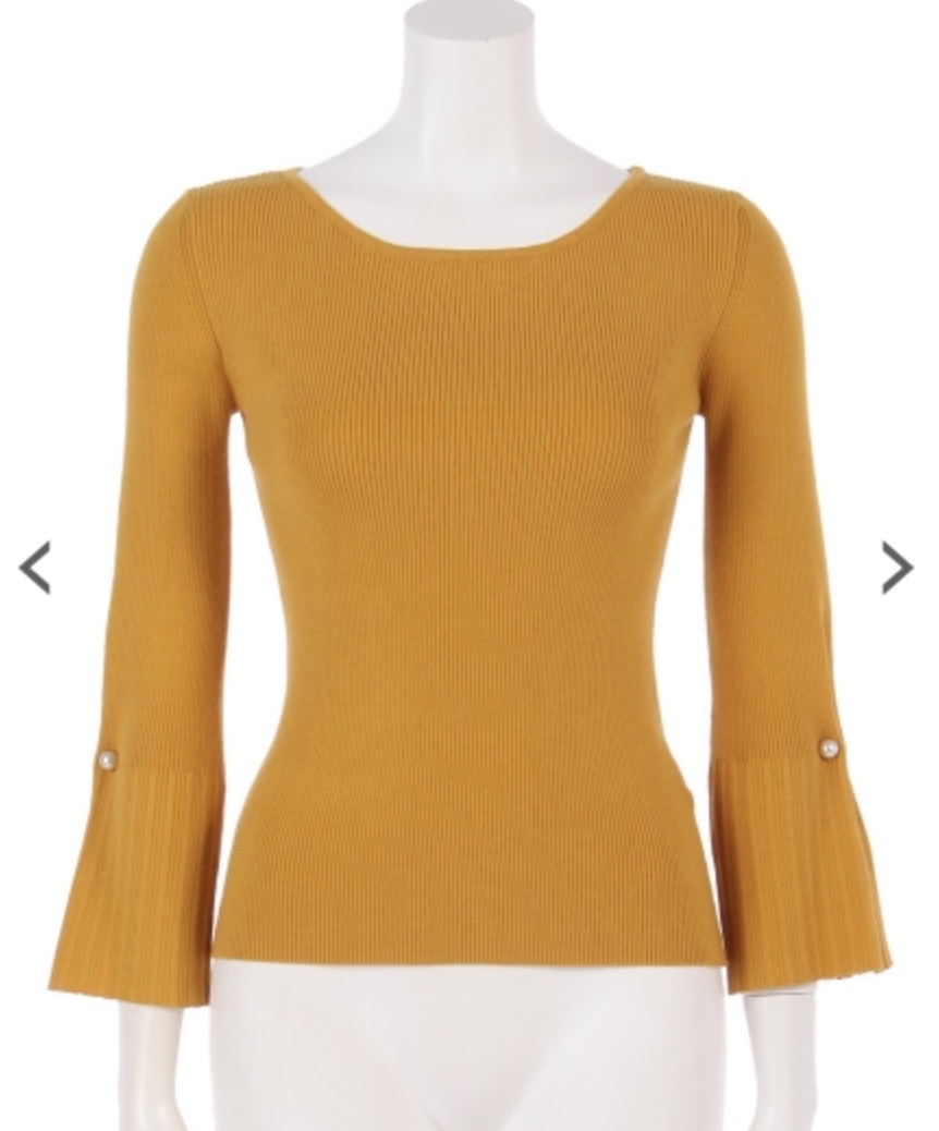 ほど良いフィット感が嬉しい、リブ仕立てのニットトップス。パールモチーフと、そこから広がるフレア袖が視線を集めます。上品なスカートと合わせて、フェミニンムードを盛り上げて。 素材 レーヨン66%、ポリエステル34% サイズ表記 総丈 肩幅 袖丈 袖ぐり バスト F 55cm 34cm 49cm 35cm 68cm