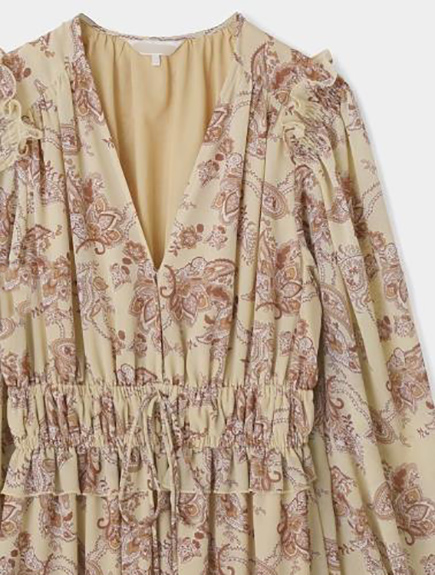 柔らかく落ち感のあるシフォン素材に、インパクトのあるオリジナルのペイズリー柄をプリントしました。全体的に細やかなギャザーを寄せ、ドレープ感を出し、女性らしい印象に仕上げました。