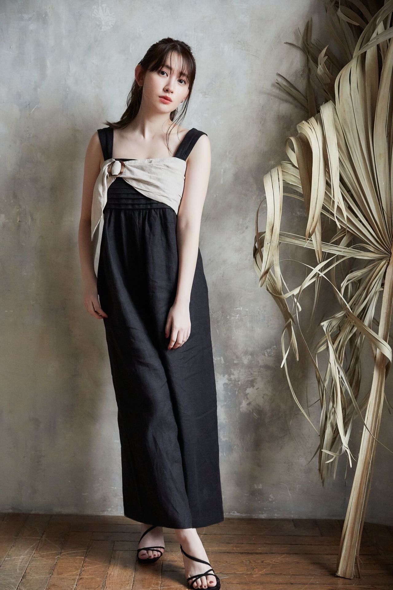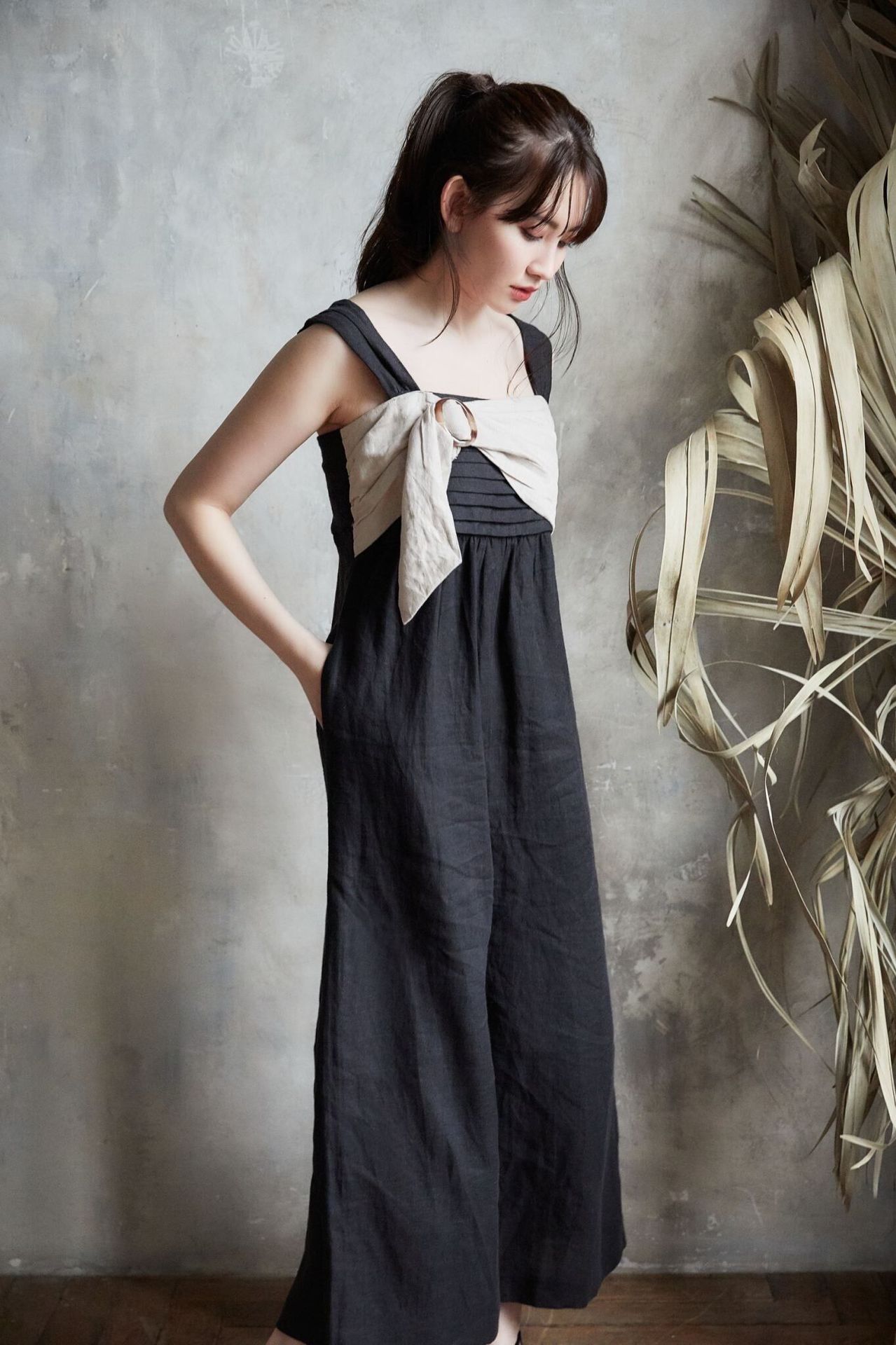 これからの季節にぴったりな涼しいりねん混の素材で仕上げました。2トーンにすることにより目線が上がるのでスタイルアップを演出。ワイドシルエットのパンツデザインなのでドレス見えし体型を気にせず着ていただけるリラックスシルエットです。