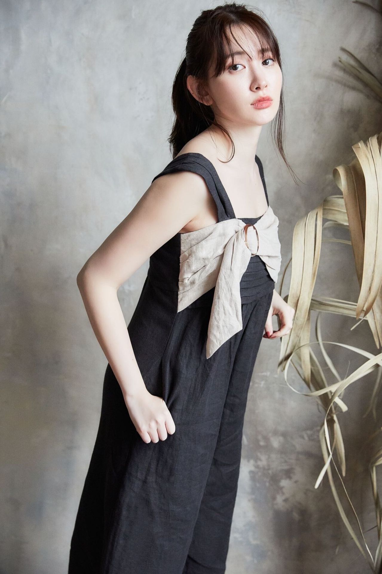 胸元に配したベッコウ風のバックルがアクセントのジャンプスーツ。