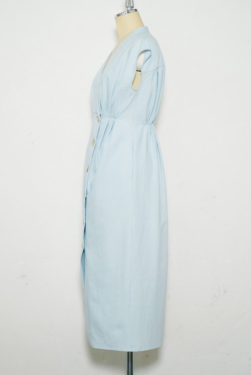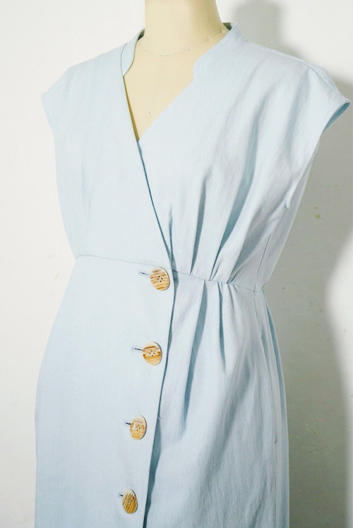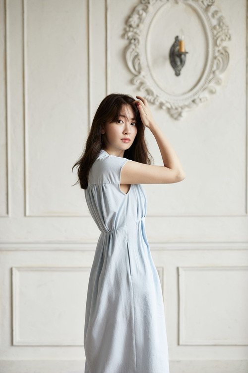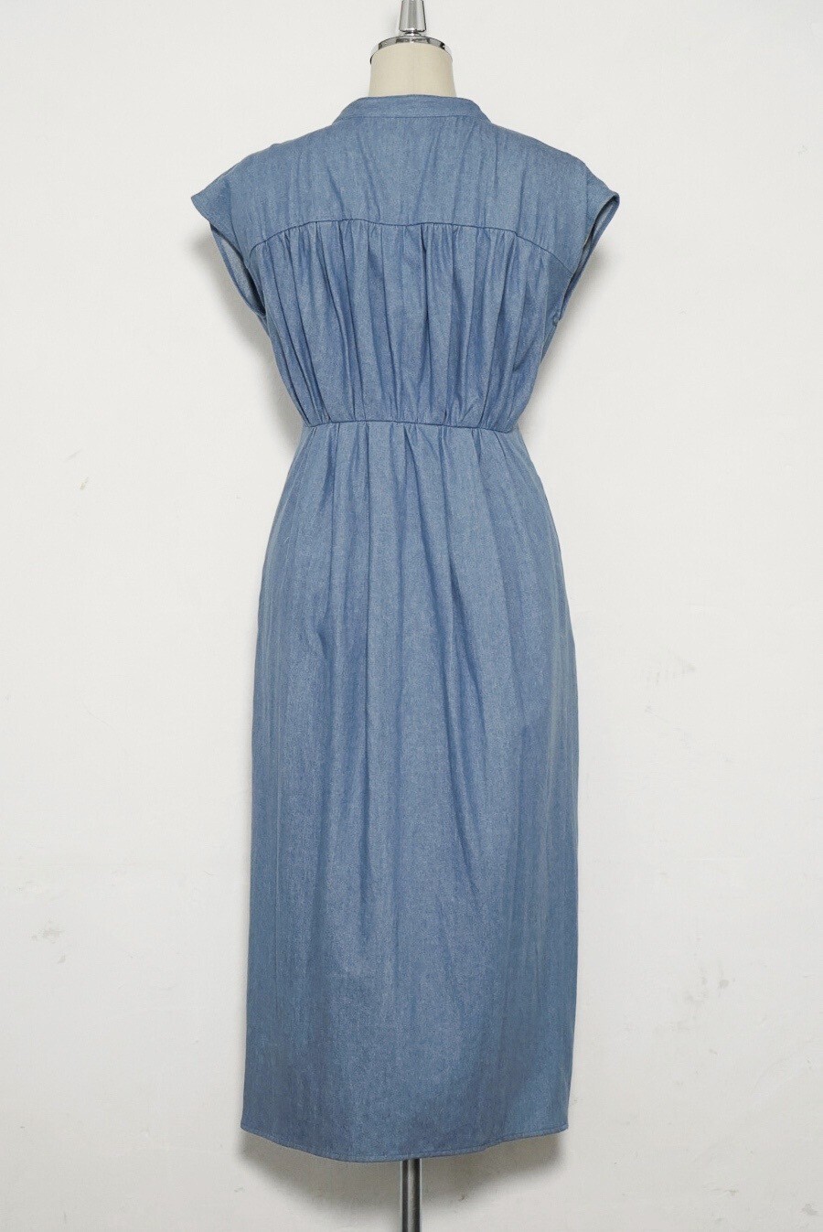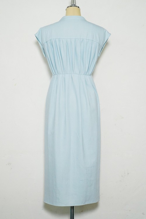 胸元の流れるようなギャザーから繋がったフレンチスリーブは肩周りと二の腕を細く見せてくれます。背面に施されたギャザーがバックシルエットを印象的でエレガントに。