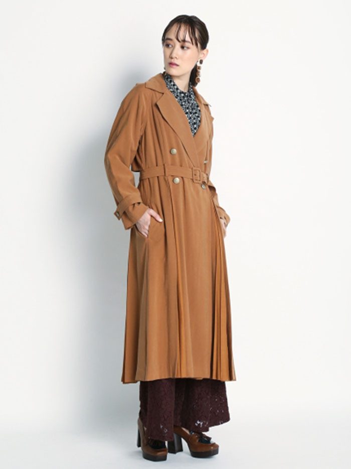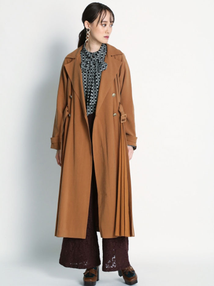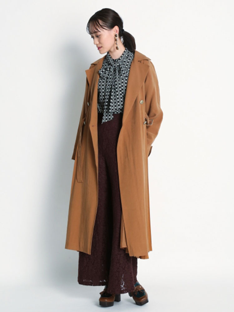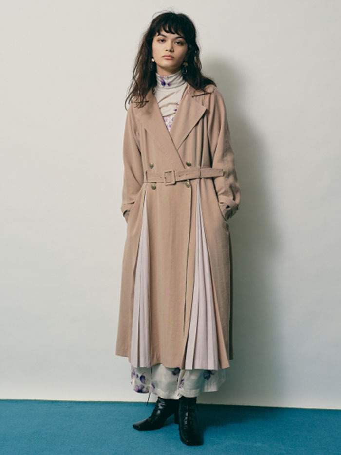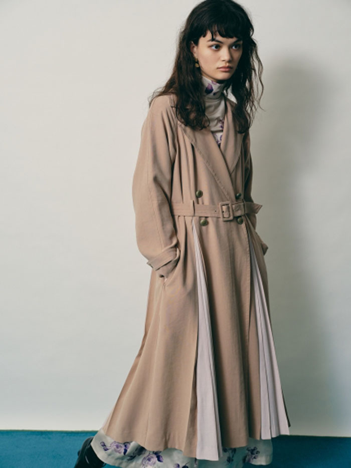 肌馴染みの良い落ち感のある生地を使用し、異素材ミックスで表現したスウィッチングトレンチコート。前後のタックの中からエアリーなシフォン生地を覗かせ、「Lily Brown」らしい“味わい深い一癖”を演出しました。切り替えデザインが主役となるよう、全体のデザインはシンプルに引き算。歩く度に揺れる躍動感が女性らしく、ラフに纏うだけでサマになる一枚です。