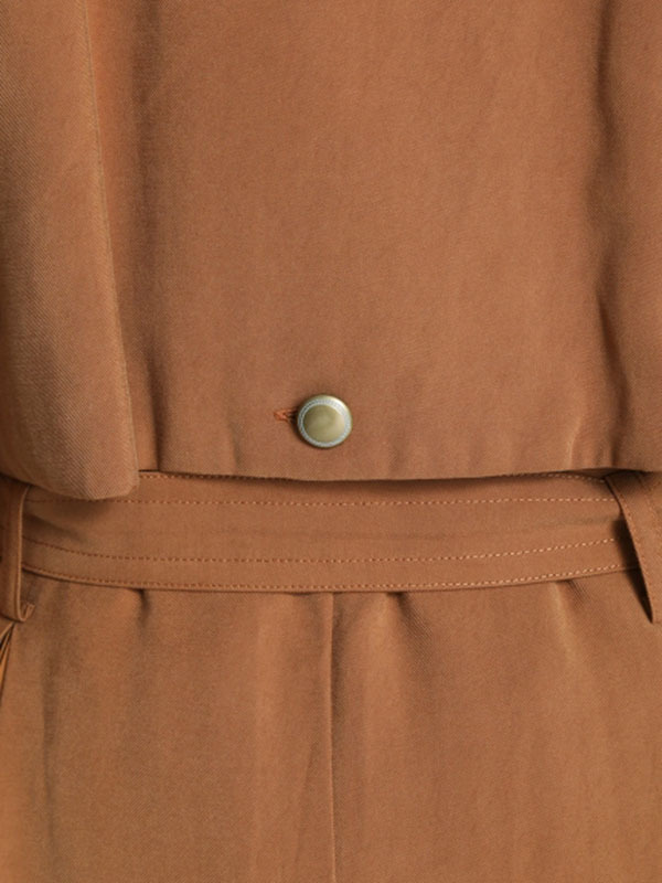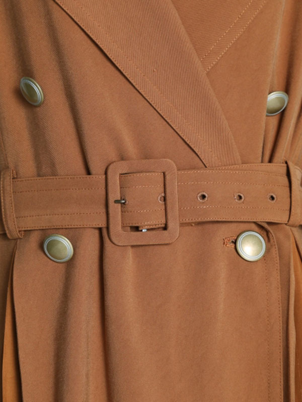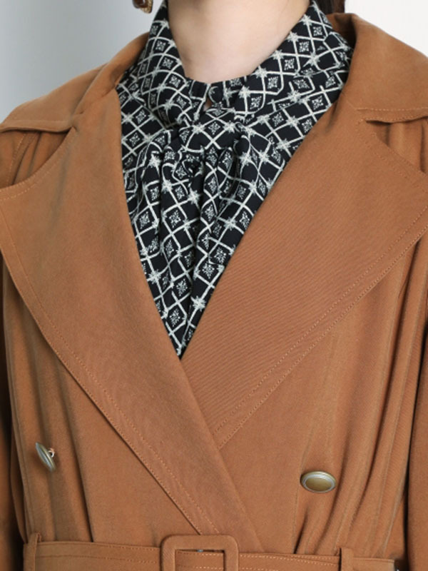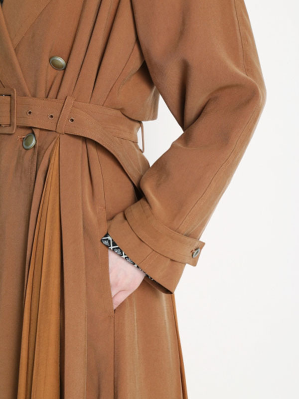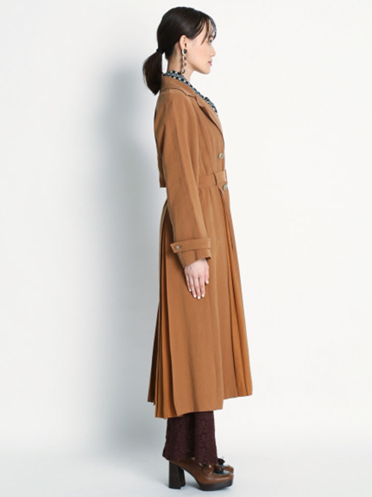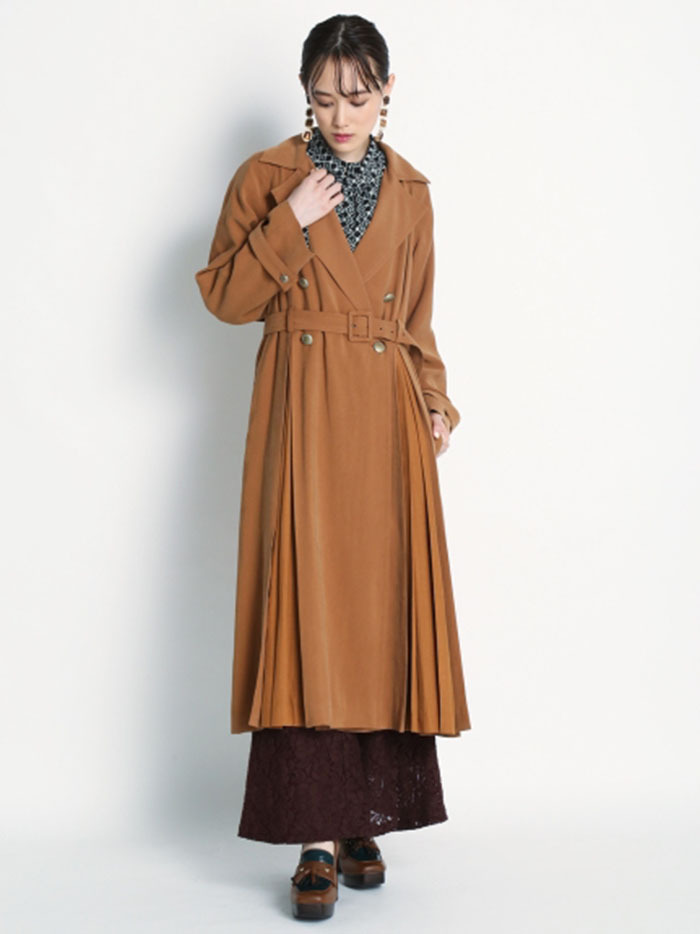 肌馴染みの良い落ち感のある生地を使用し、異素材ミックスで表現したスウィッチングトレンチコート。前後のタックの中からエアリーなシフォン生地を覗かせ、「Lily Brown」らしい“味わい深い一癖”を演出しました。切り替えデザインが主役となるよう、全体のデザインはシンプルに引き算。歩く度に揺れる躍動感が女性らしく、ラフに纏うだけでサマになる一枚です。