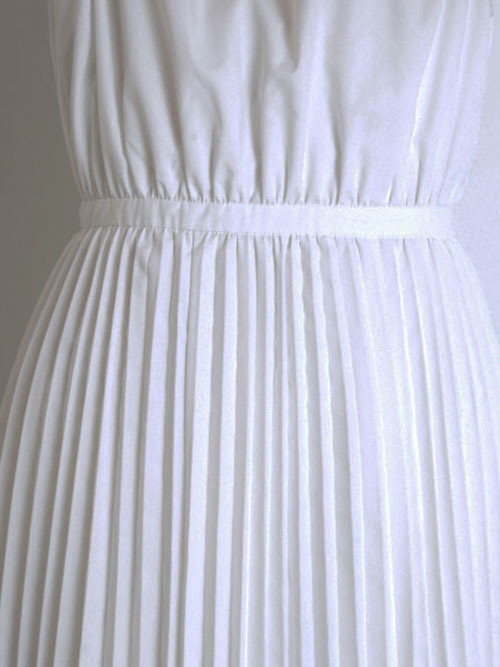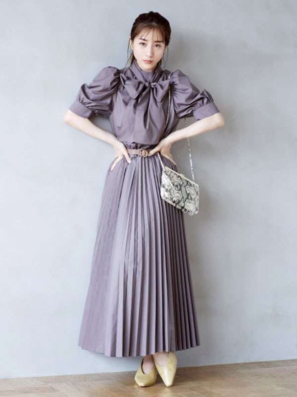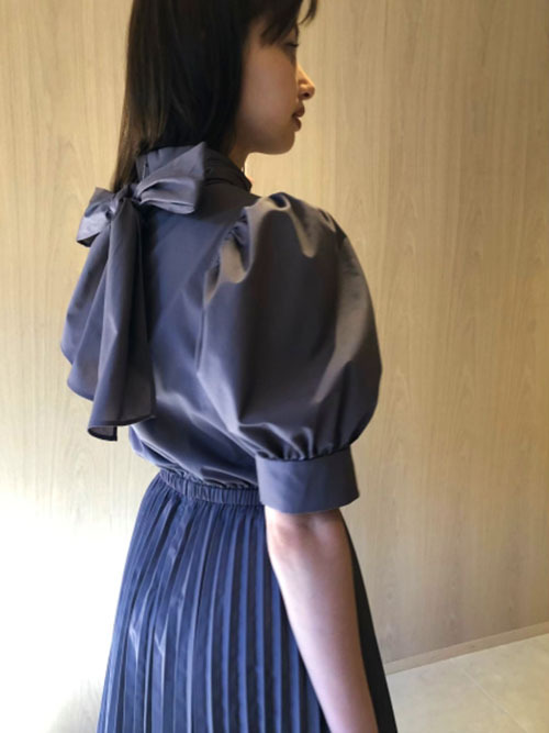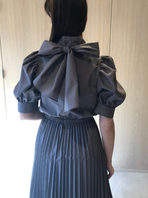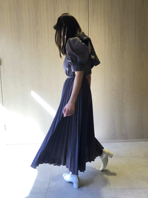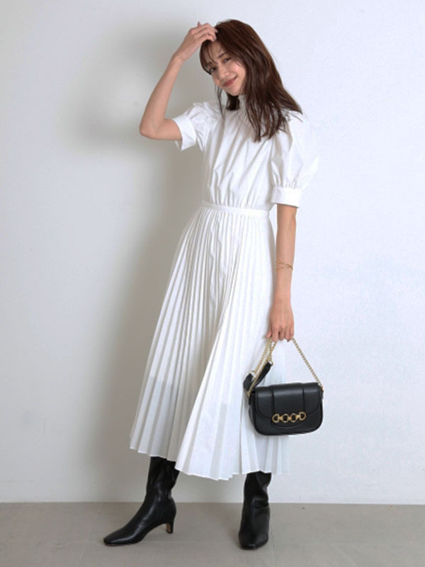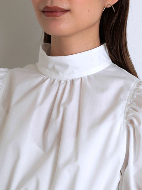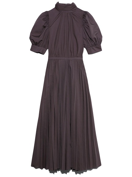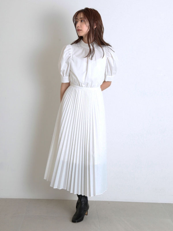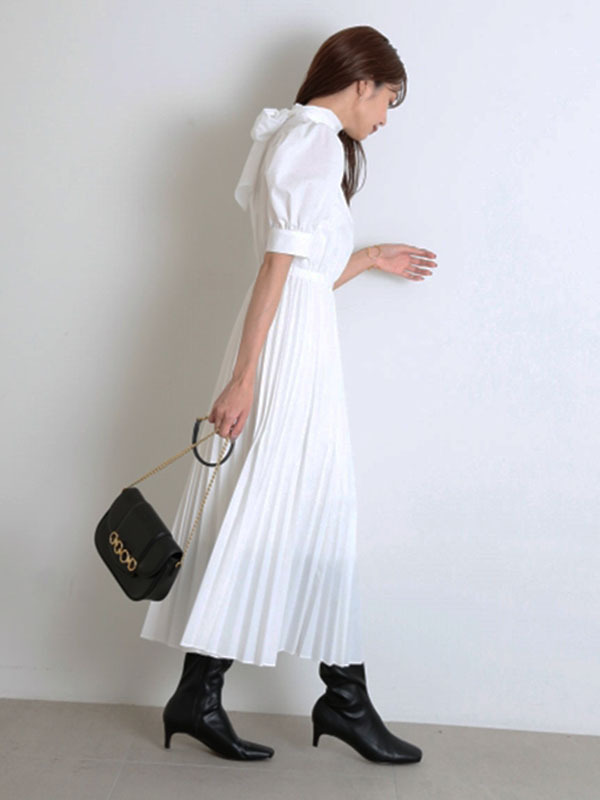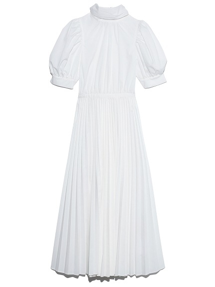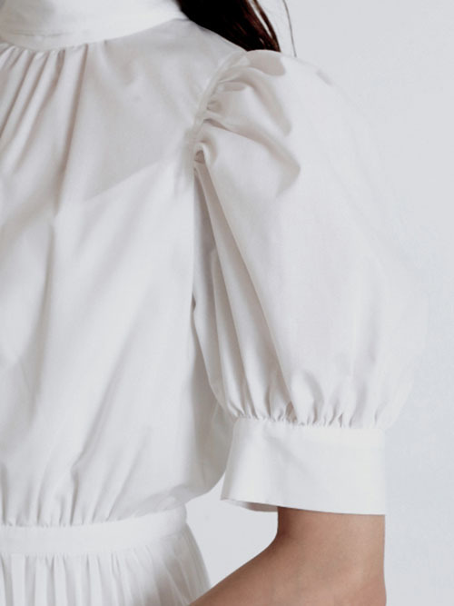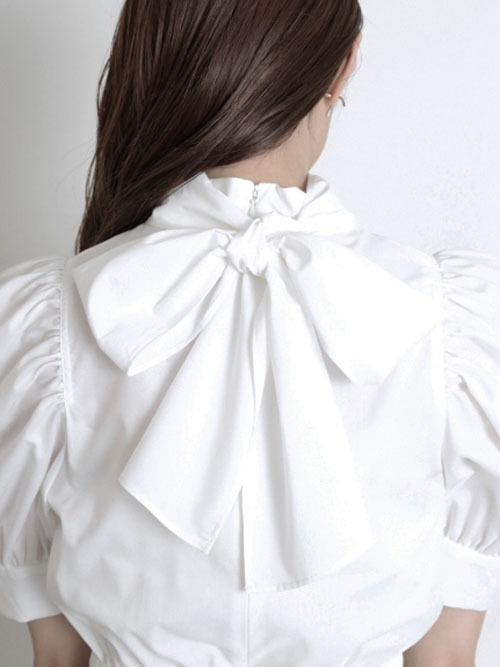 ハリのあるシャツ地で仕立てたクラシカルなワンピースは、前後どちらでもアレンジ可能な共生地リボンがポイント。フロントでボウタイにしても、後ろでリボン結びにしても、エレガントな雰囲気で存在感を発揮します。スタンドネックがモードな印象を加え、ギャザーを寄せてふっくらと仕上げたパフスリーブで女性らしさを演出。裾にかけて広がる立体的なプリーツは、華やかなボリュームで優美なフレアを描きます。ハリのある生地がディテールの美しさをキープし、程良いカジュアルさでデイリーからオケージョンまで幅広く活躍する一枚です。