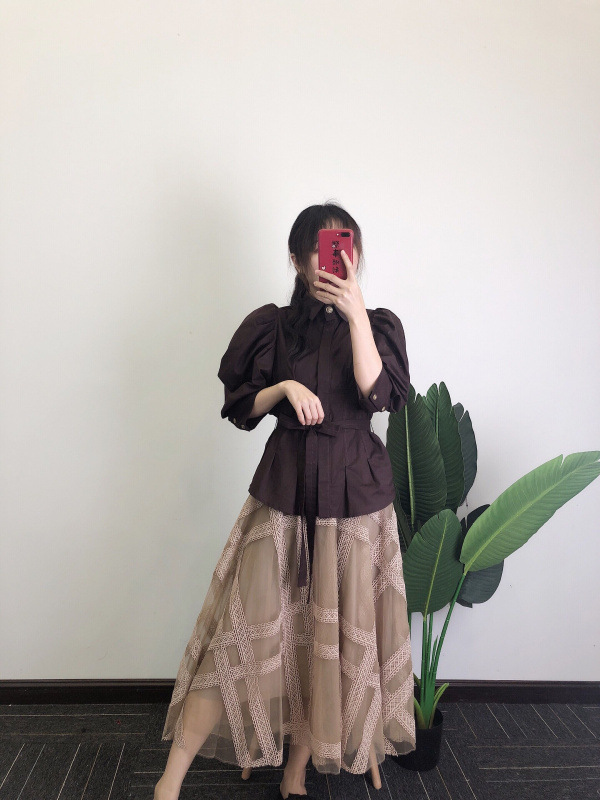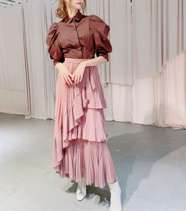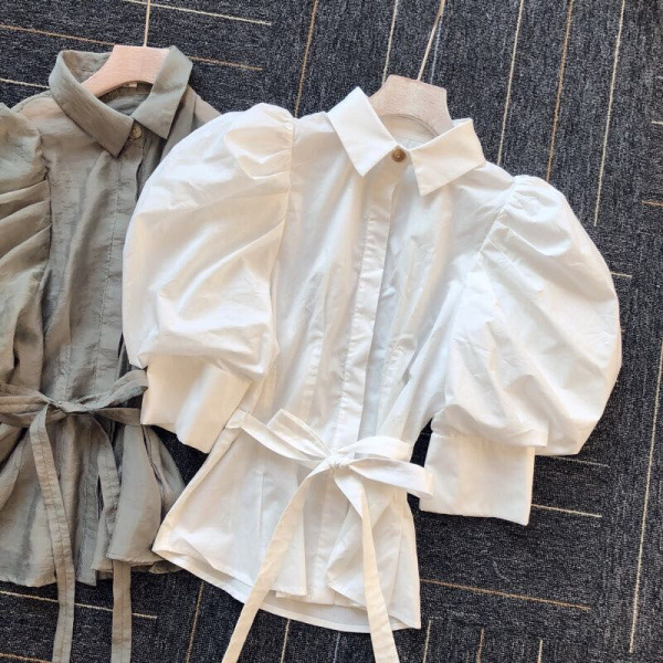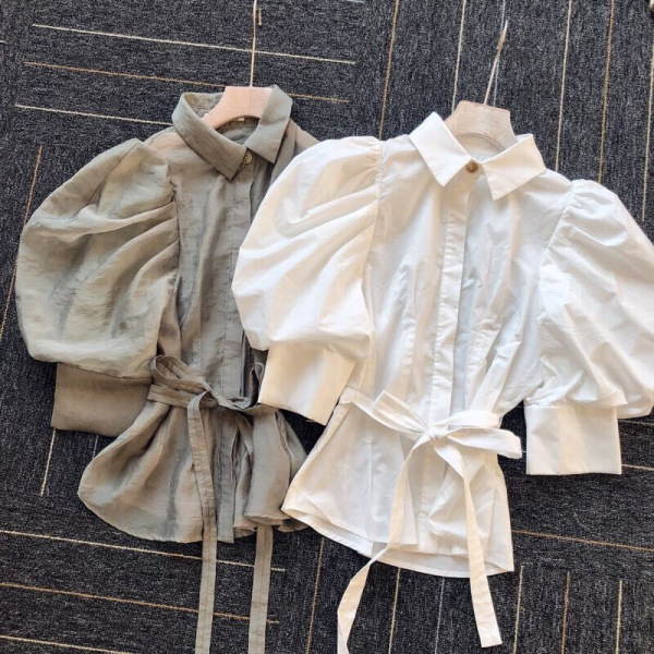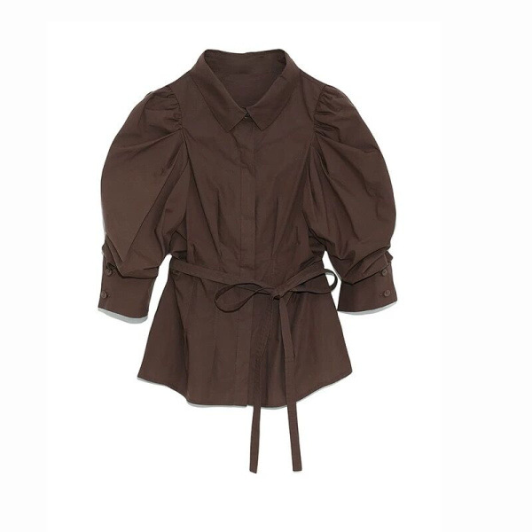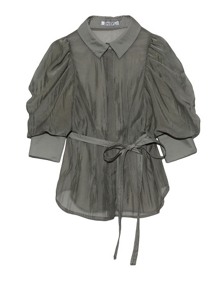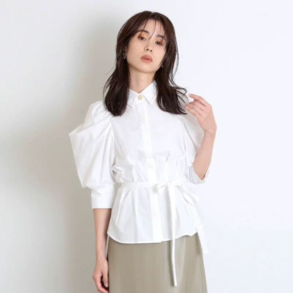 タックとギャザーで立体感を表現し、女性らしく落とし込んだパワーショルダーブラウス。ふんわりとした袖のボリュームとシンプルな身頃のデザインがバランス良く、存在感がありつつもデイリーで着回しやすい一枚が完成しました。ウエストのタックがメリハリあるシルエットをつくり、共布リボンでさらにスタイルアップを強調。IN/OUTどちらも似合う丈感で、着回し力も抜群です。