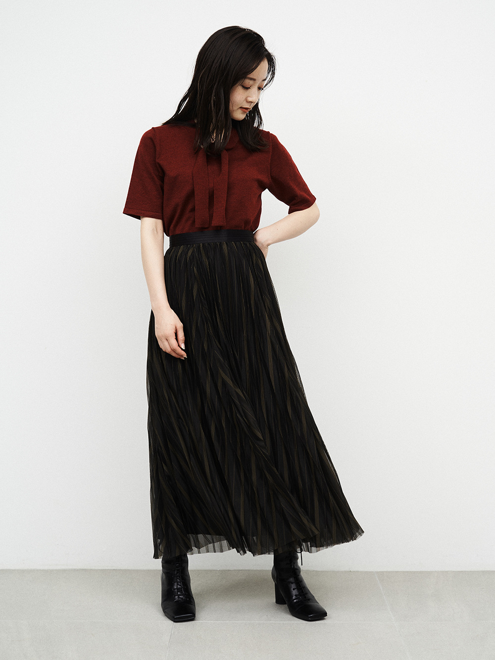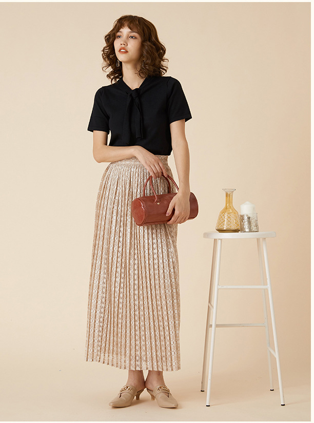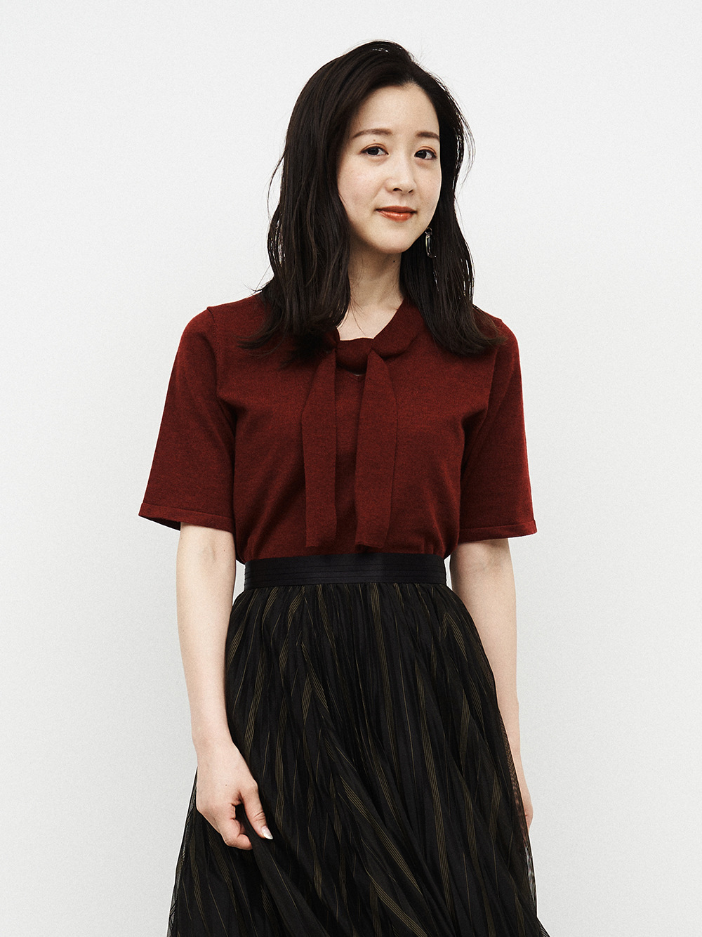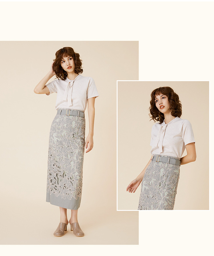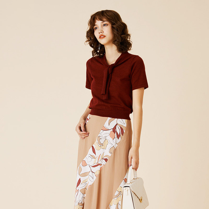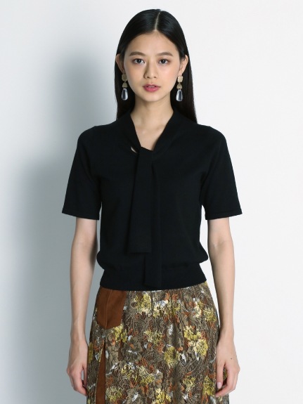 ボウタイデザインが品の良いアクセントを放つコンパクトニット。身頃と袖は天竺編みでシンプルに、ボウタイを長くすることで大人な雰囲気を目指しました。定番のニットを旬な表情にシフトし、いつものコーディネートをクラスアップ。トップスイン、アウトどちらも合わせやすく、季節の変わり目に重宝する一枚です。