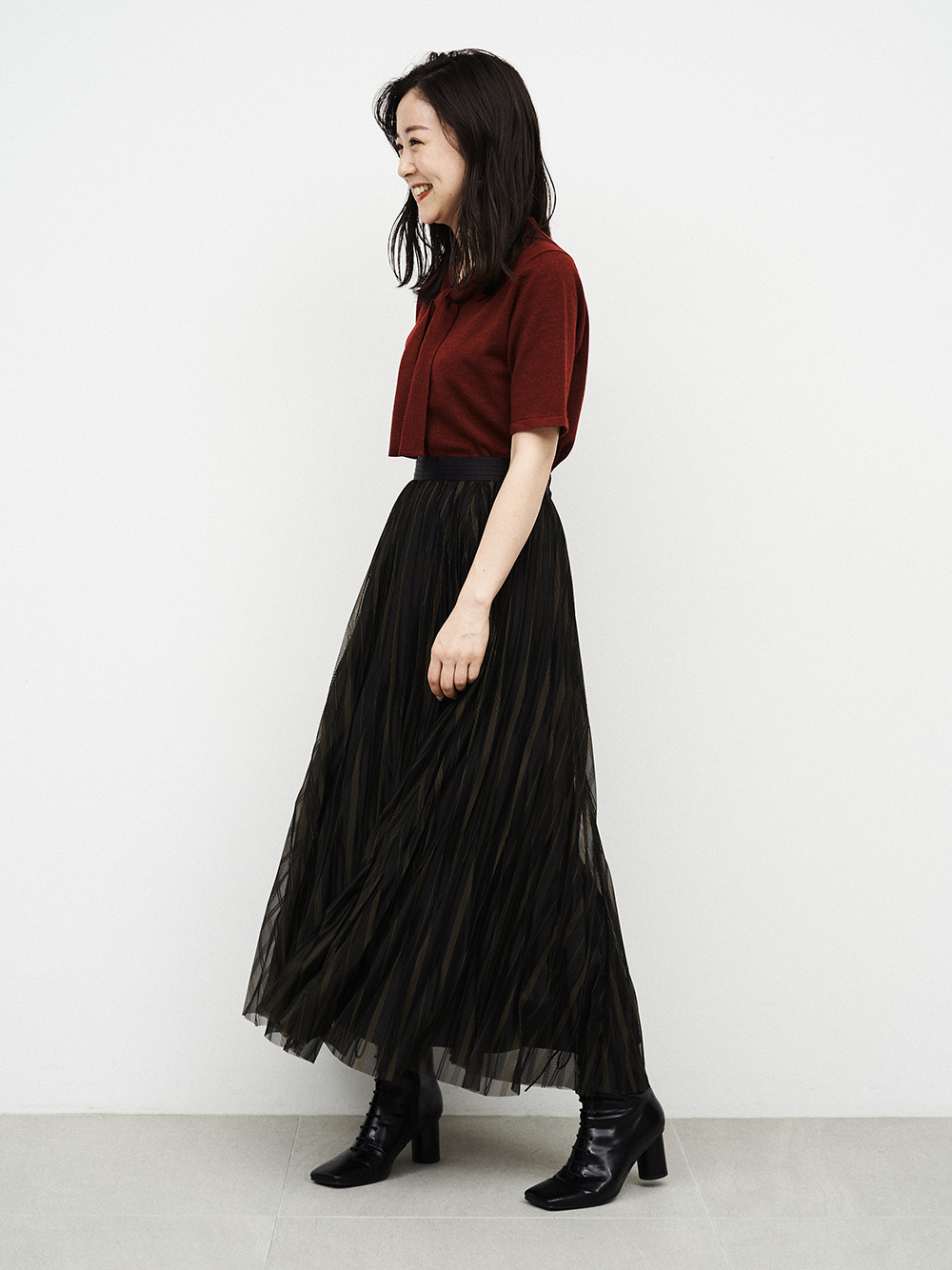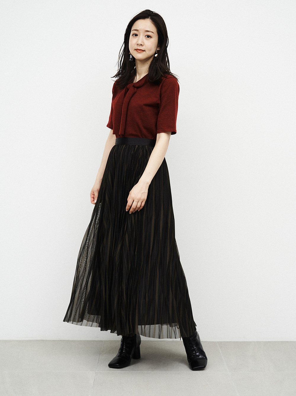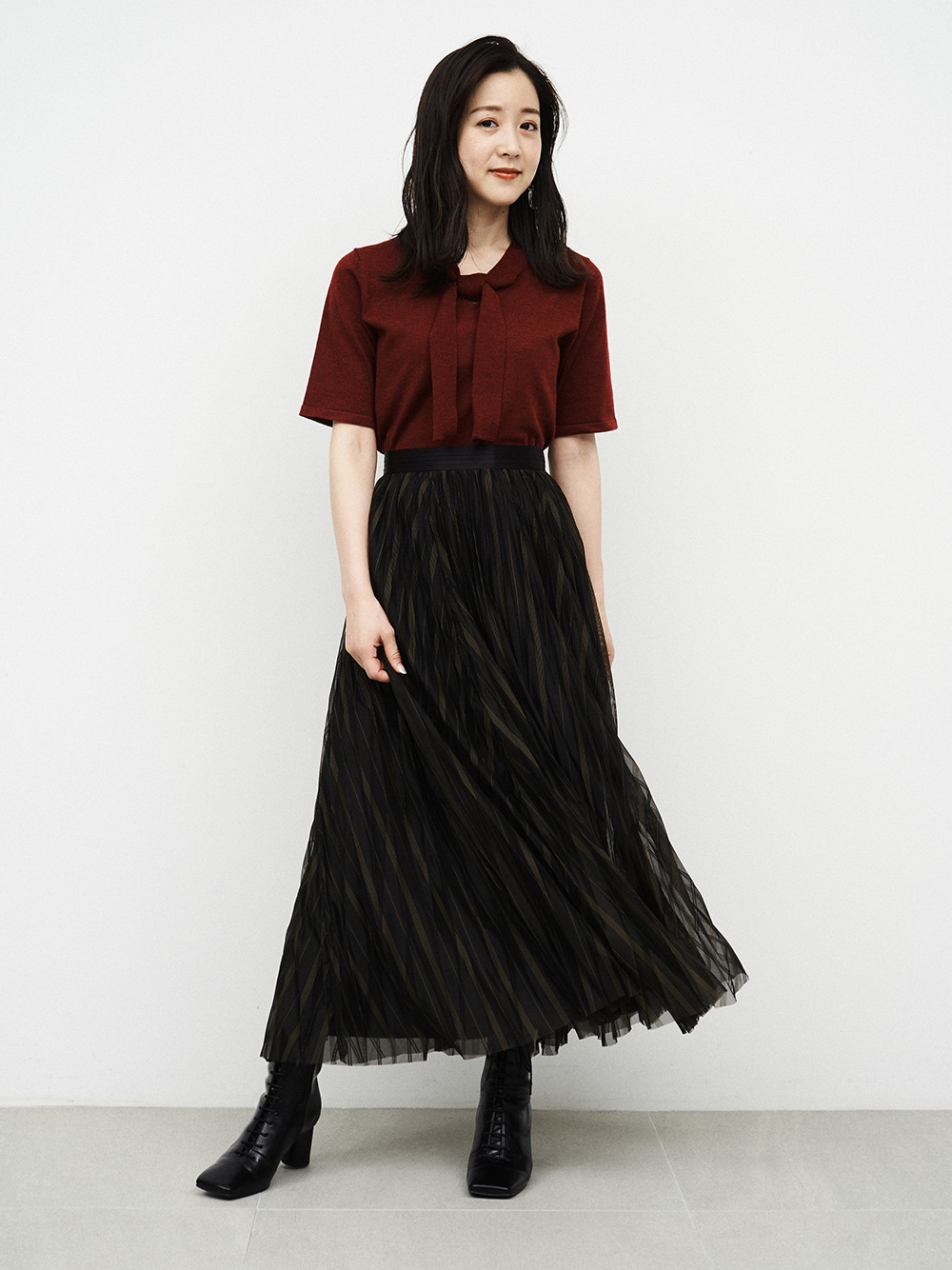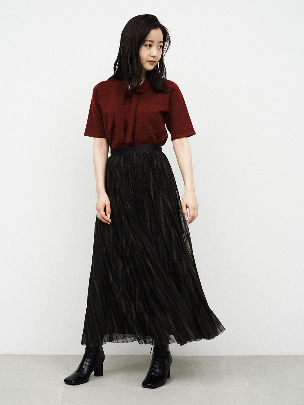 ボウタイデザインが品の良いアクセントを放つコンパクトニット。身頃と袖は天竺編みでシンプルに、ボウタイを長くすることで大人な雰囲気を目指しました。定番のニットを旬な表情にシフトし、いつものコーディネートをクラスアップ。トップスイン、アウトどちらも合わせやすく、季節の変わり目に重宝する一枚です。