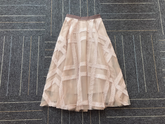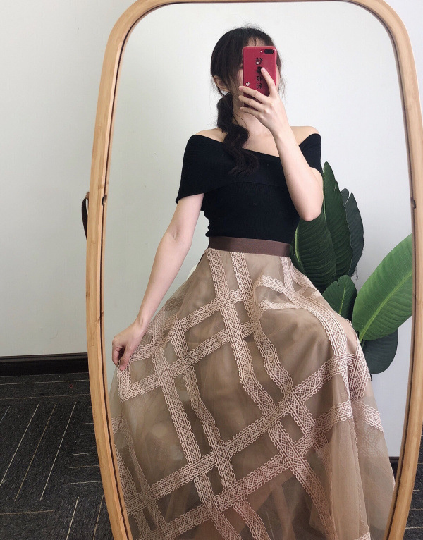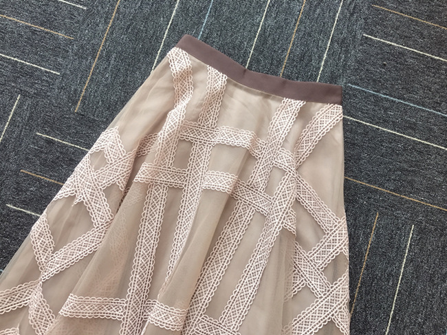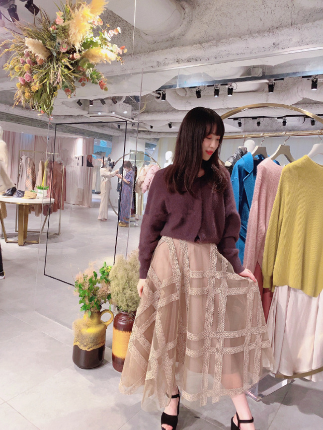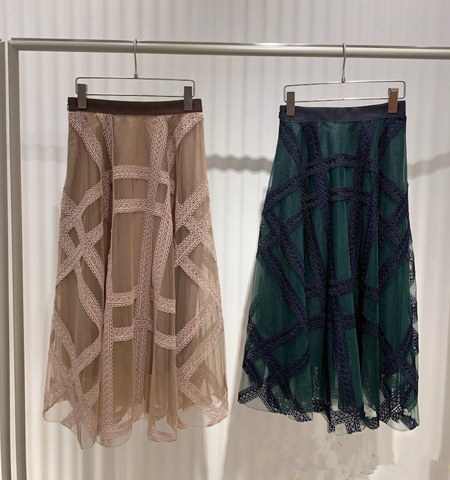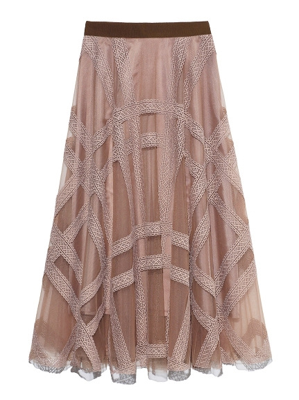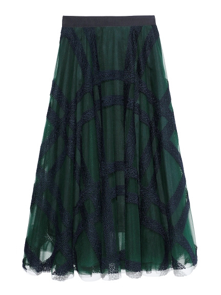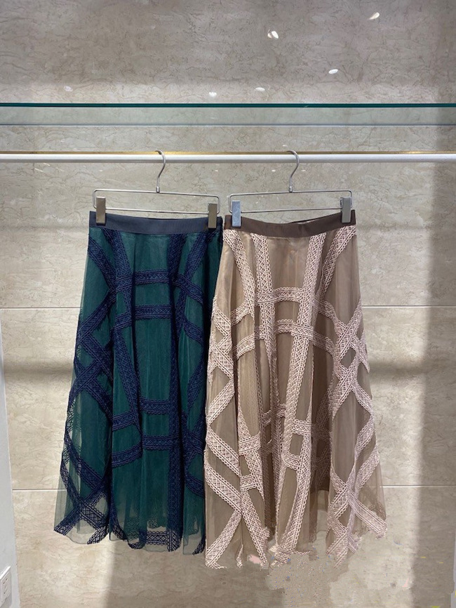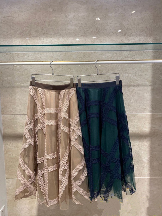 レーステープ調の刺繍で格子状にチェックを描き、クラシカルな雰囲気に落とし込んだ大人のチュールスカート。たっぷりのフレアでボリュームを出し、ブーツと合わせやすいミドル丈にデザインしました。ウエストにはグログランテープでアクセントをプラス。チュールと刺繍のカラーやファブリックのコントラストが美しく、シアーな透け感とチェックの存在感を絶妙なバランスで表現した一枚です。