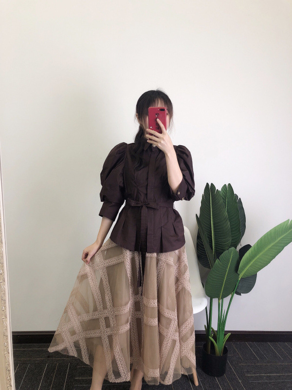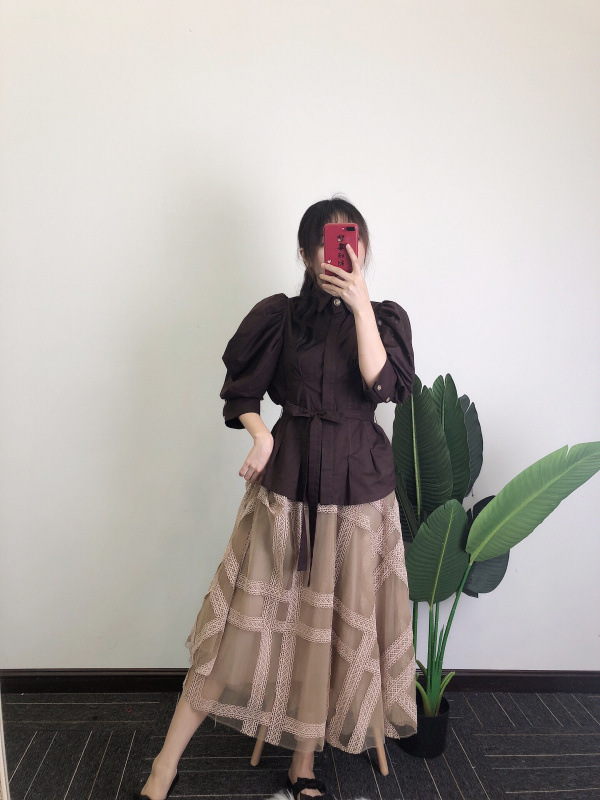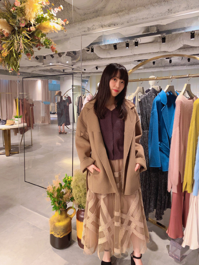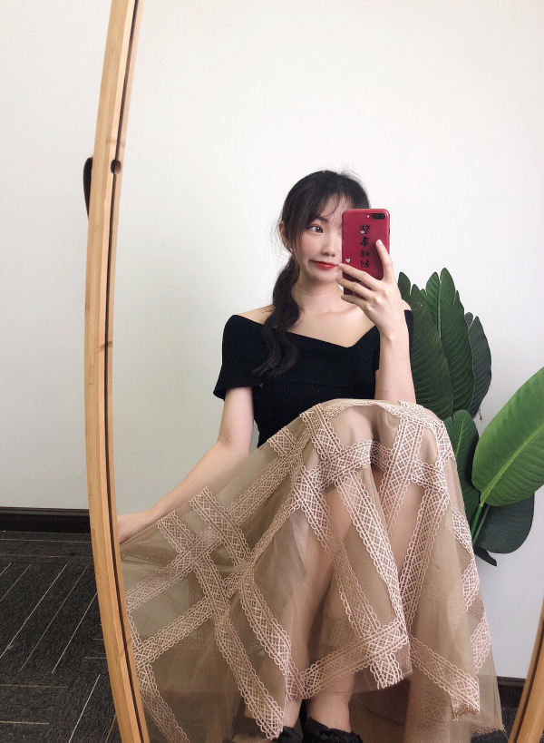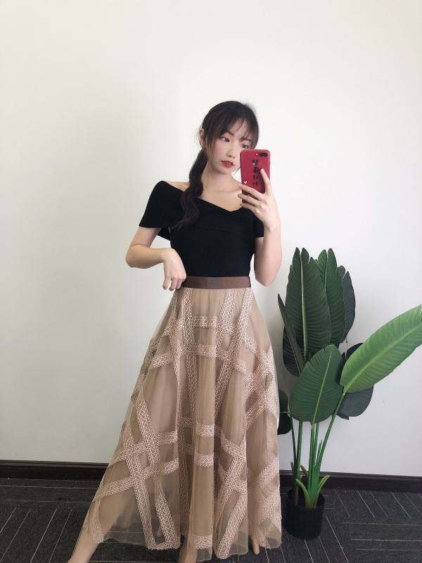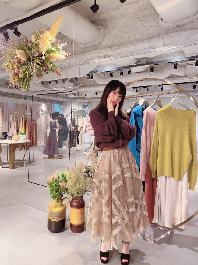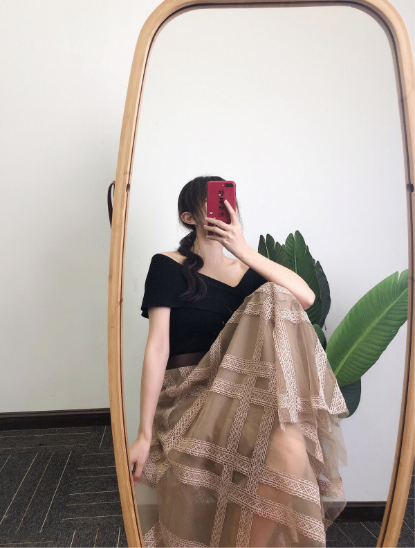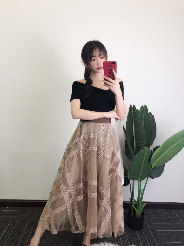 レーステープ調の刺繍で格子状にチェックを描き、クラシカルな雰囲気に落とし込んだ大人のチュールスカート。たっぷりのフレアでボリュームを出し、ブーツと合わせやすいミドル丈にデザインしました。ウエストにはグログランテープでアクセントをプラス。チュールと刺繍のカラーやファブリックのコントラストが美しく、シアーな透け感とチェックの存在感を絶妙なバランスで表現した一枚です。