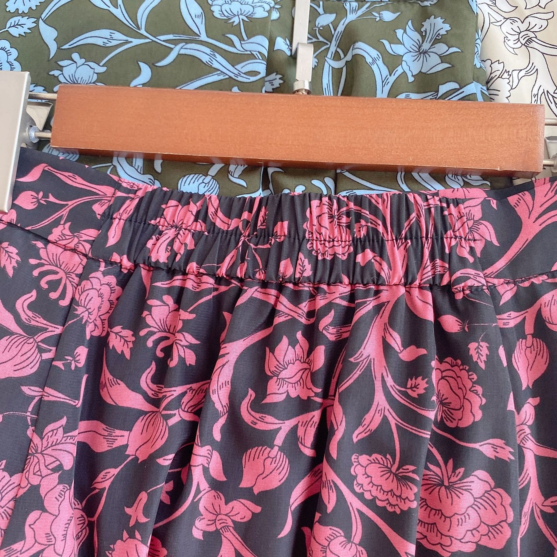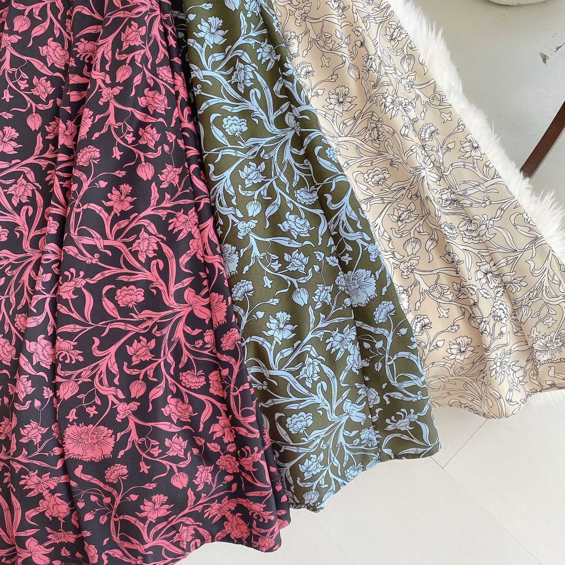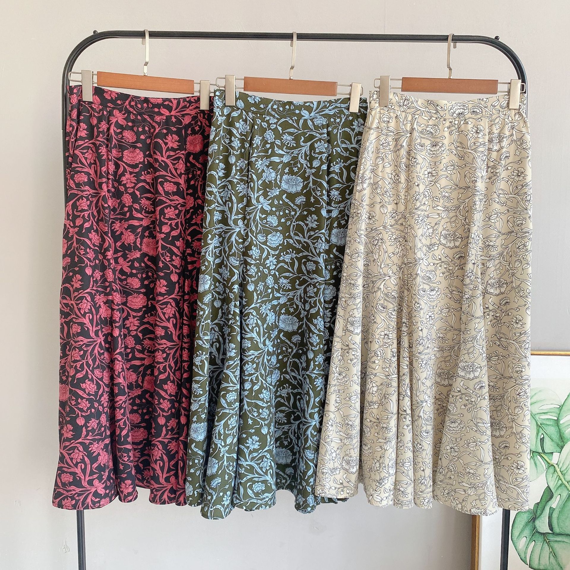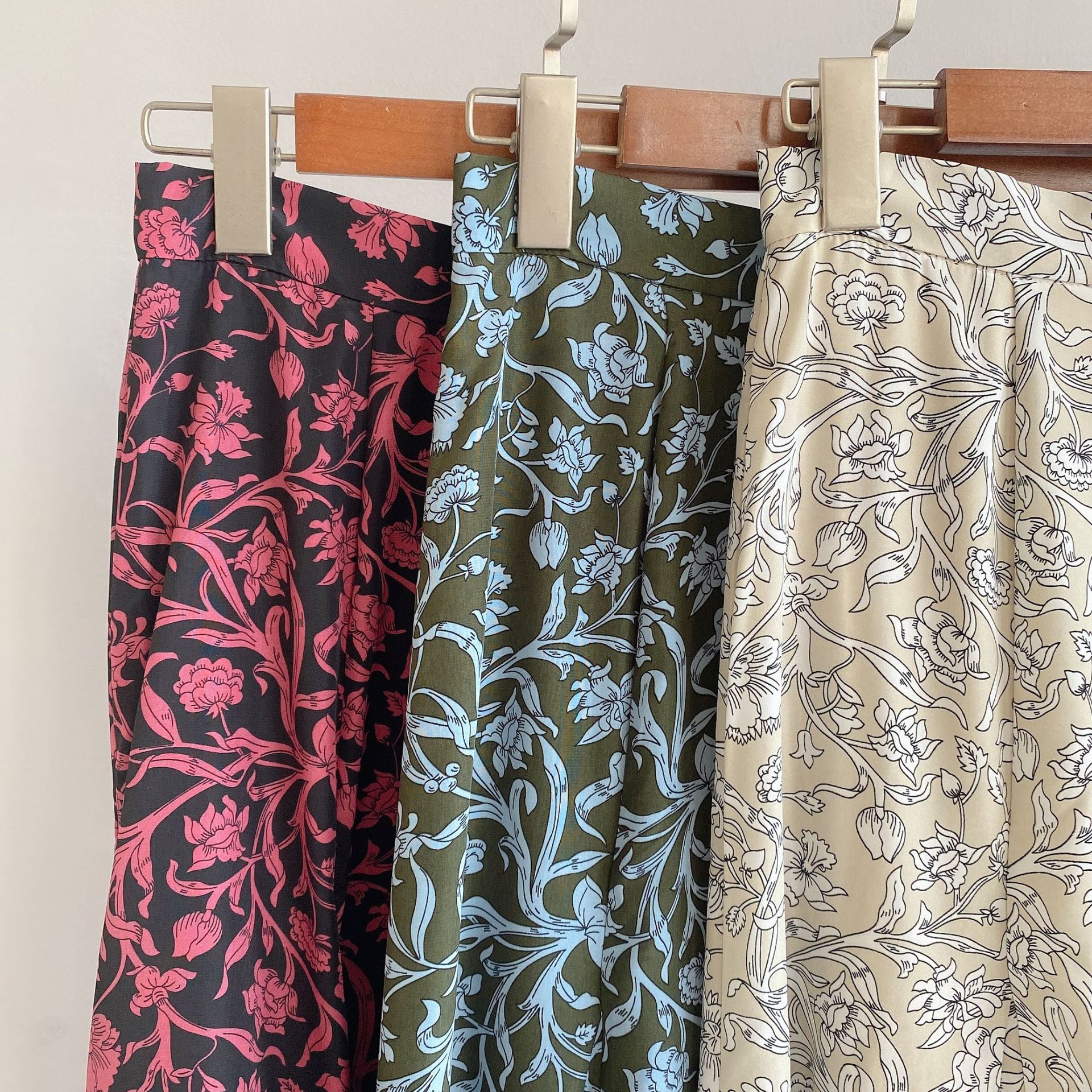 大人のロマンティックを叶えてくれる「リバティ」と「SNIDEL」とのコラボレーションライン。クラシカルな花柄が大人ムードを引き立てるロングスカートは、身体のラインを美しく魅せるナローシルエット。腰周りはすっきりと、裾にかけて可憐なフレアを描き、歩く度に揺れるドラマティックな表情で柔らかさを表現しました。後ろウエストゴムで穿き心地も良く、軽やかなルックスは様々なトップスと好相性です