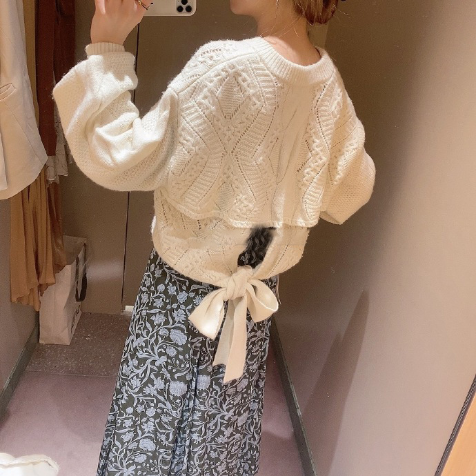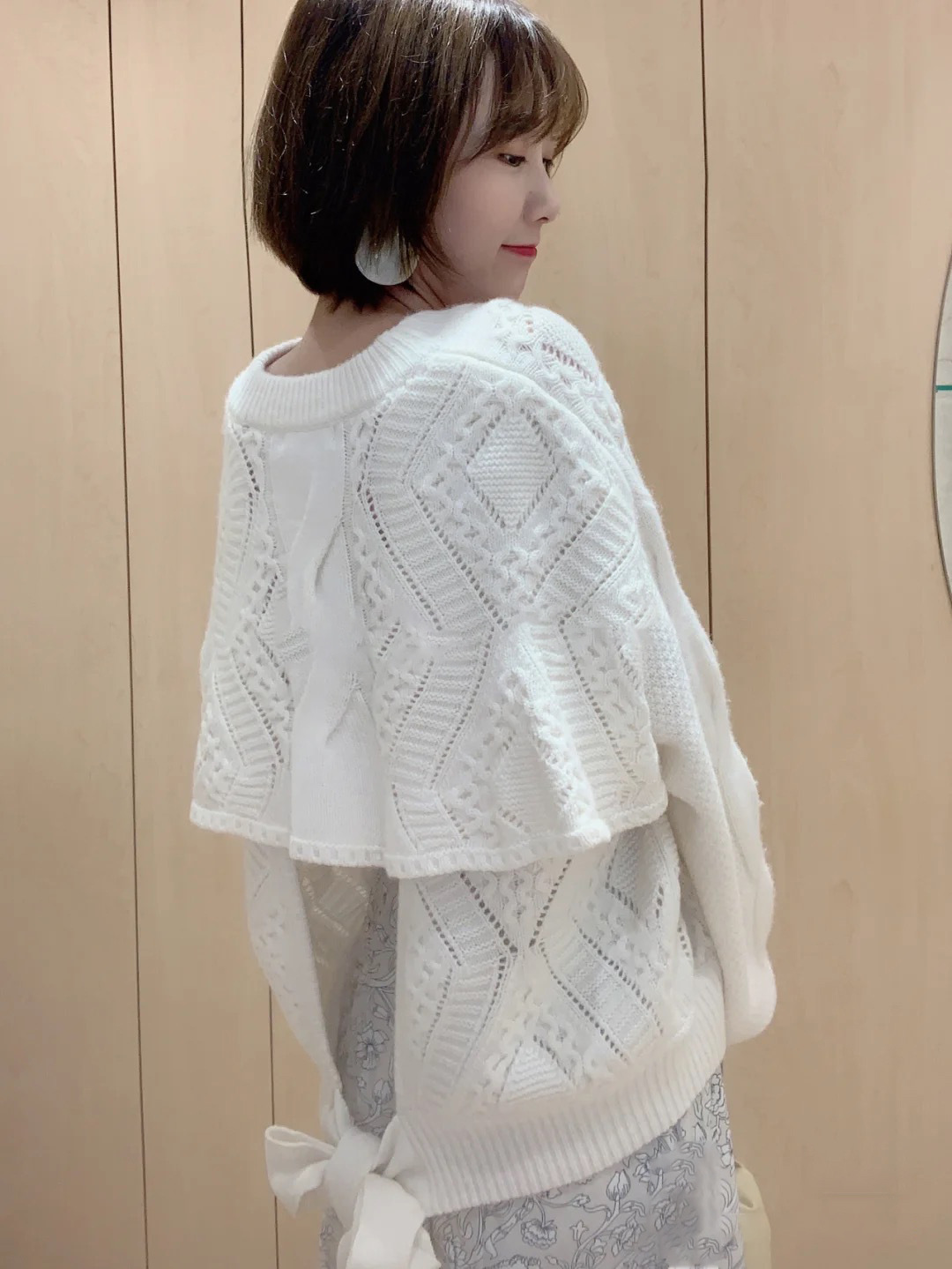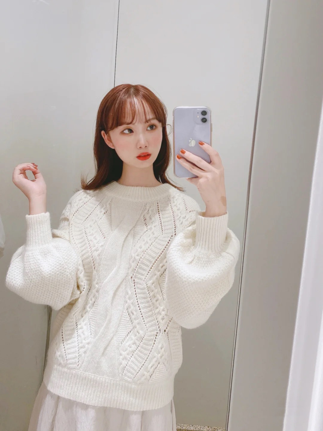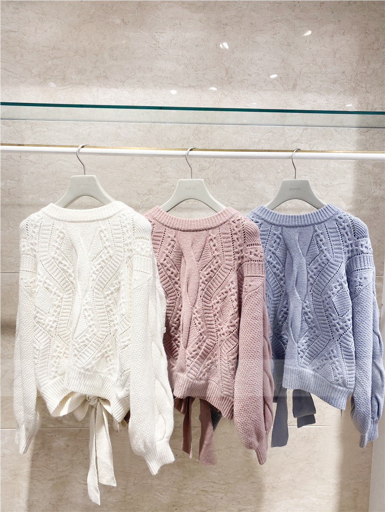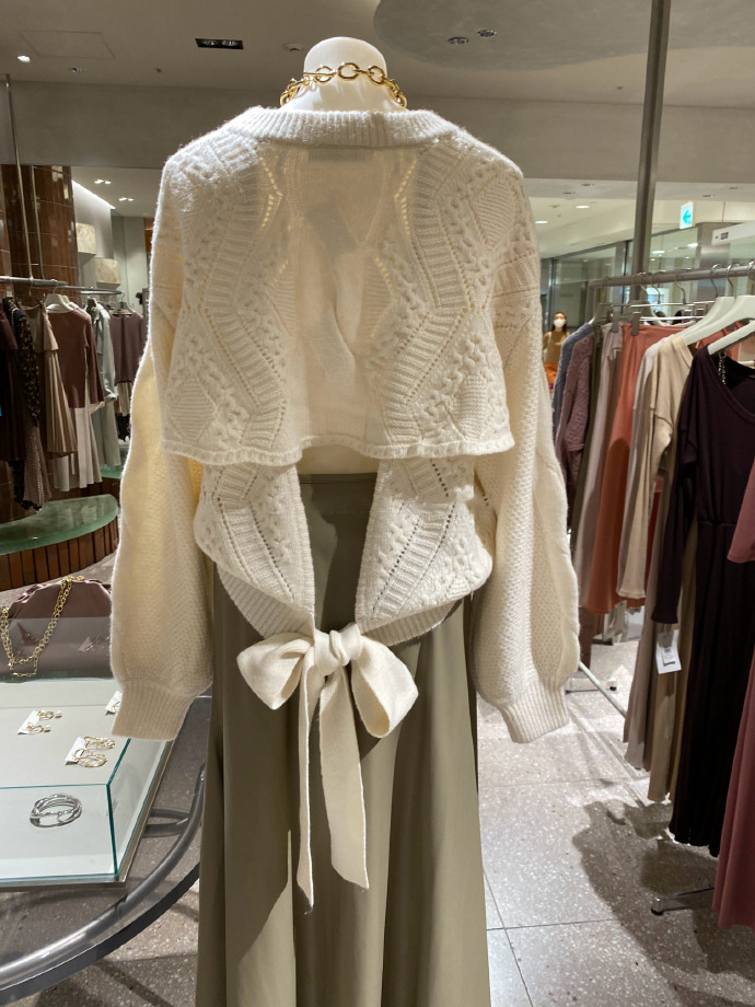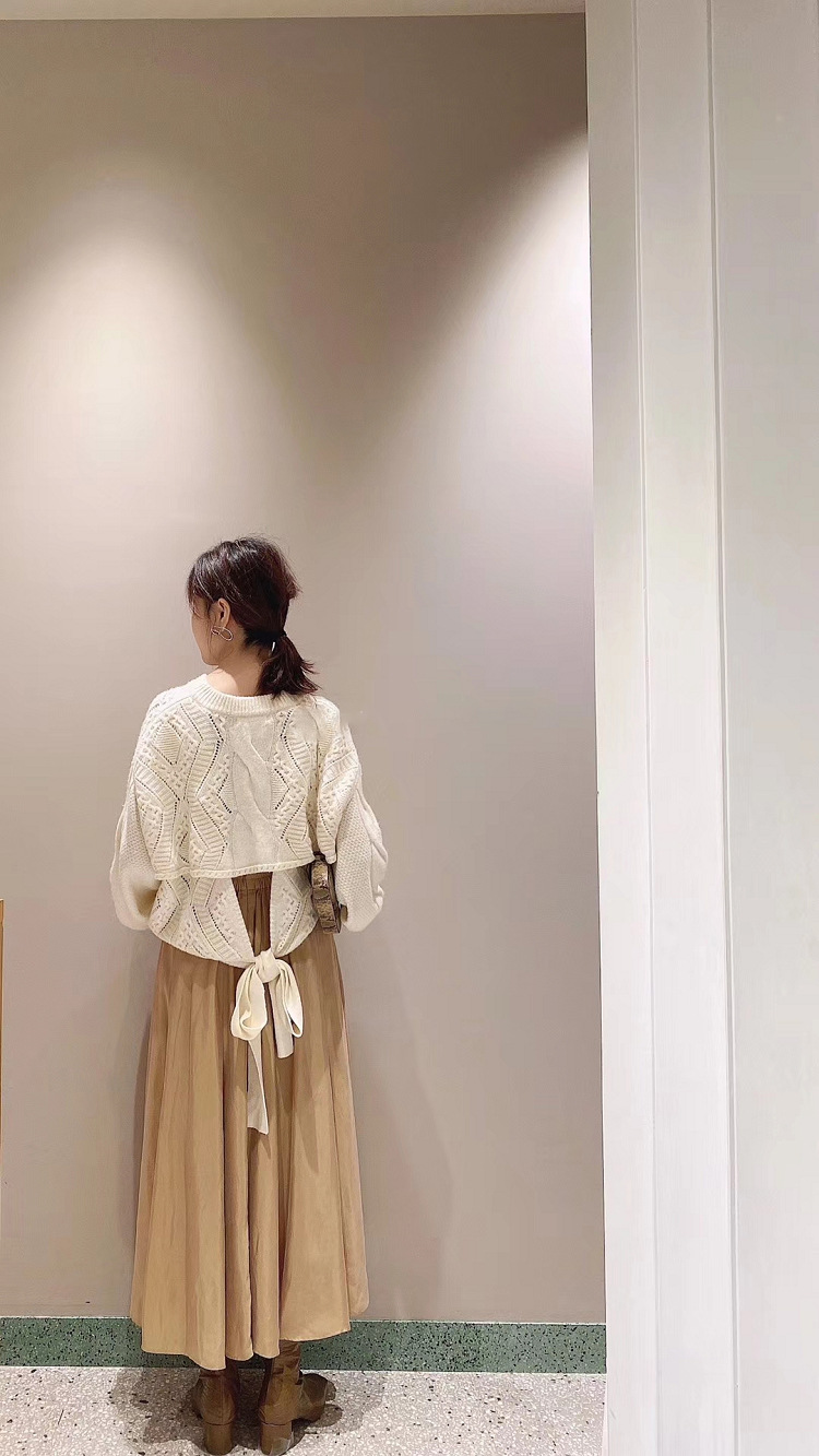 バックスタイルがポイントのケーブルニット。少し長めにボリュームを持たせた袖が女性らしく、柔らかな印象に。 素肌を見せてヘルシーに着こなしても、インナーにレースやシャツを重ねたレイヤードスタイルや、ハイウエストボトムとの合わせもおすすめです。 バックスタイルも含めアレンジが楽しめる遊び心ある一着です。