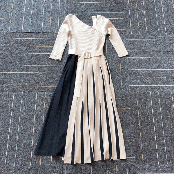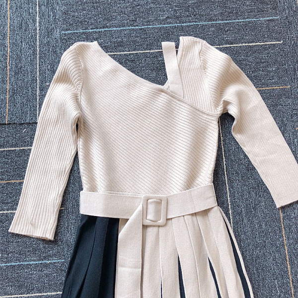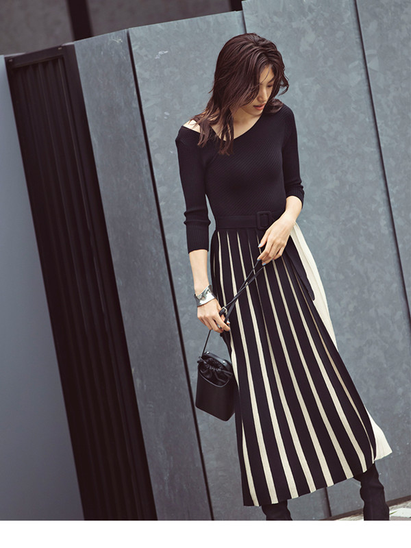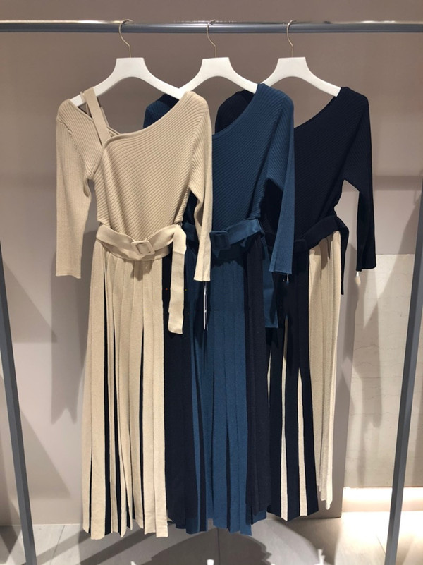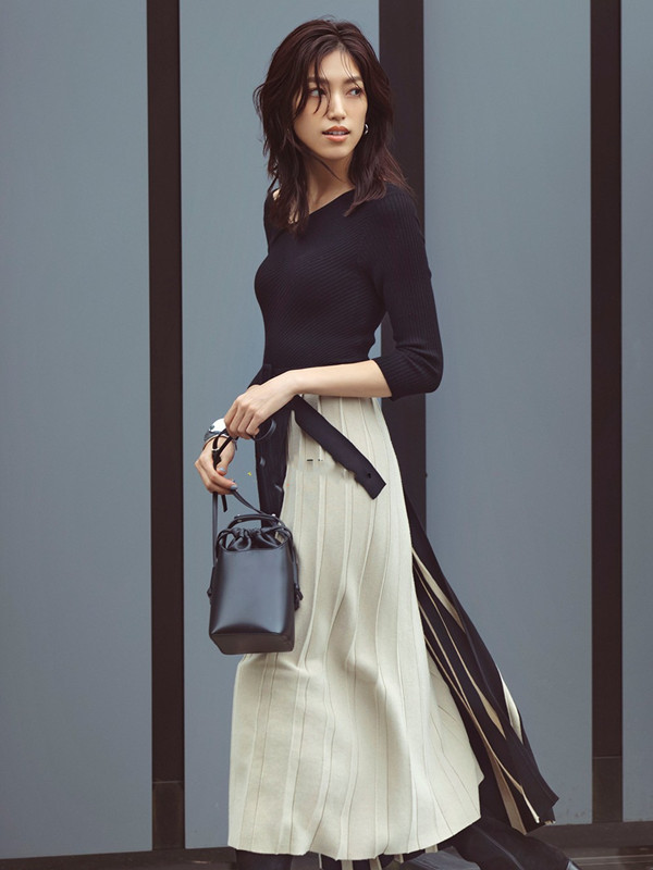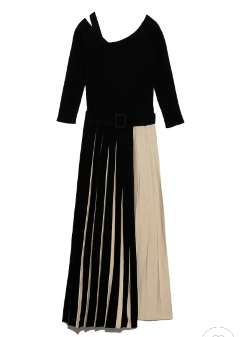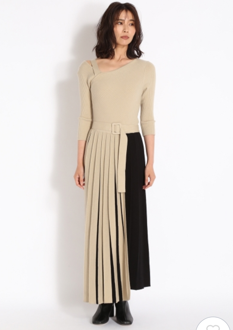アシメトリーなプリーツスカートをバイカラーの立体的な仕立てにすることで、さらに華やぎが増したモードなニットワンピースです。