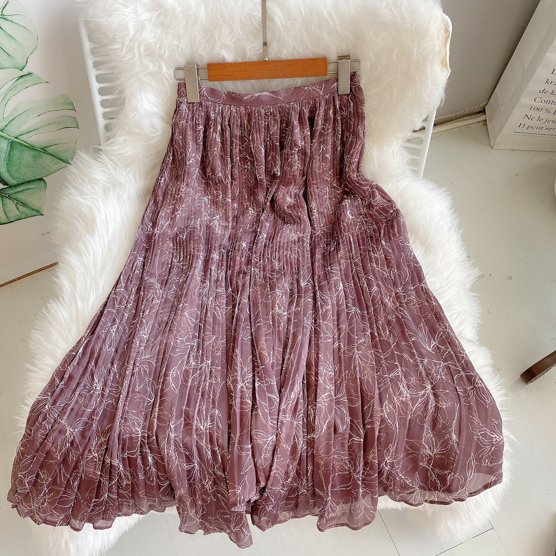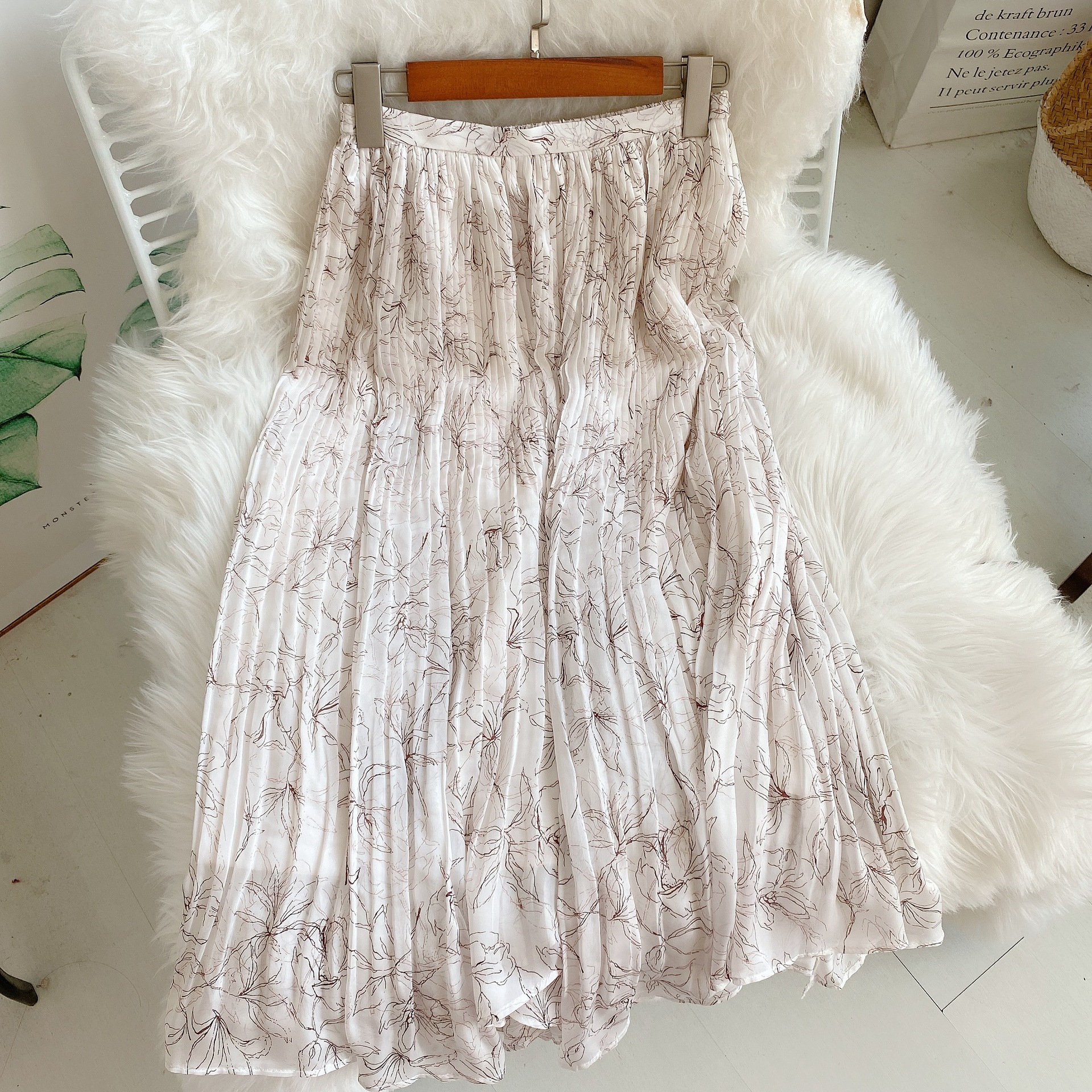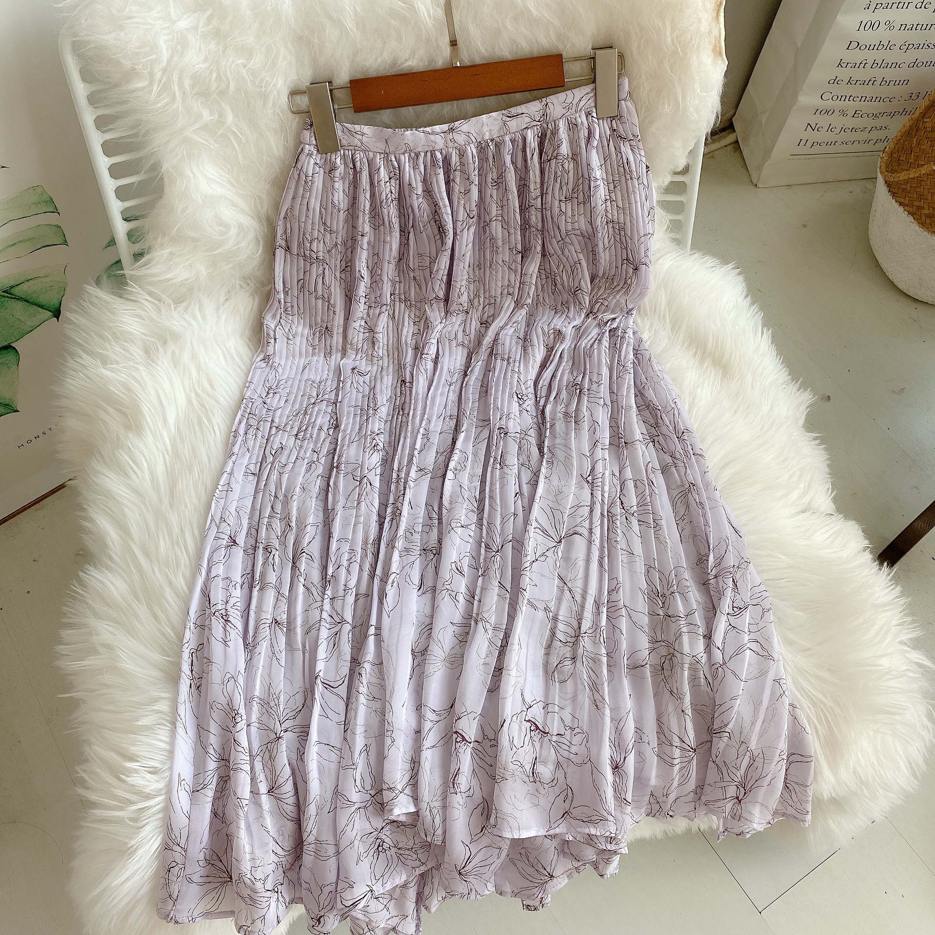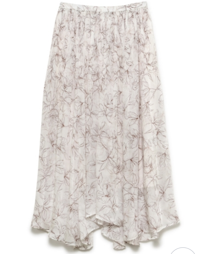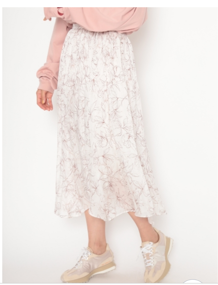 手書き風の花柄がキャッチーなプリントスカート。 プリーツとアシンメトリーの裾がアクセントに引き立つ、女性らしさのあるデザインです。 コンパクトなトップはもちろん、ゆったりとしたルーズニットとの相性もよく、コーディネートの幅が広がります。 素材 表地・裏地:ポリエステル100% サイズ表記 総丈 ウエスト(ゴムあり) ヒップ F 70/85cm 64-82cm 96cm