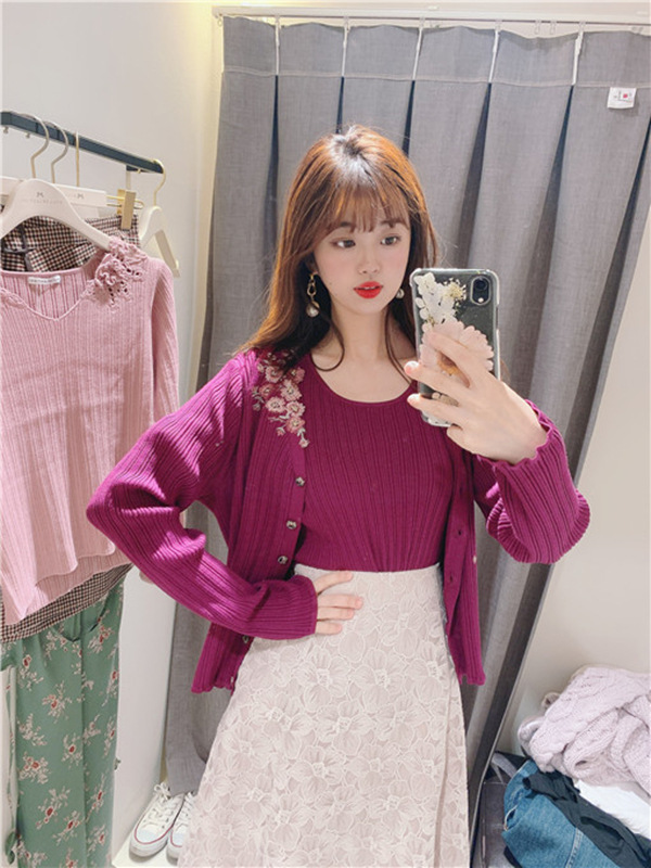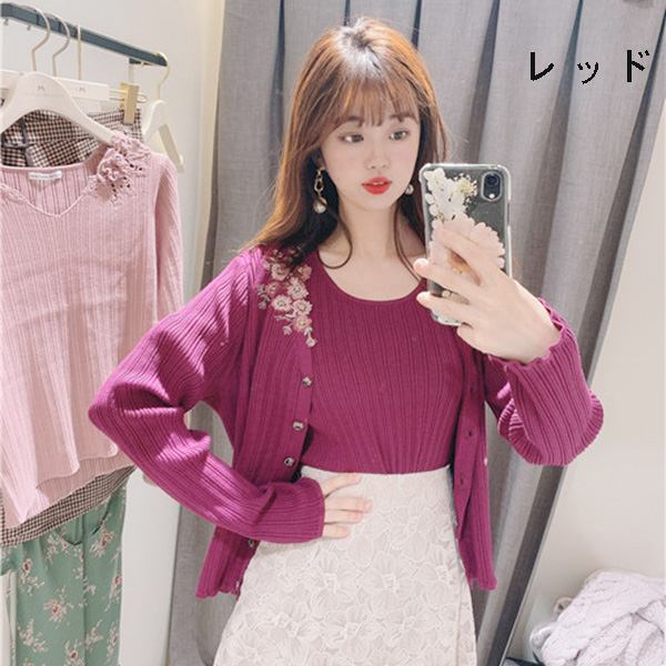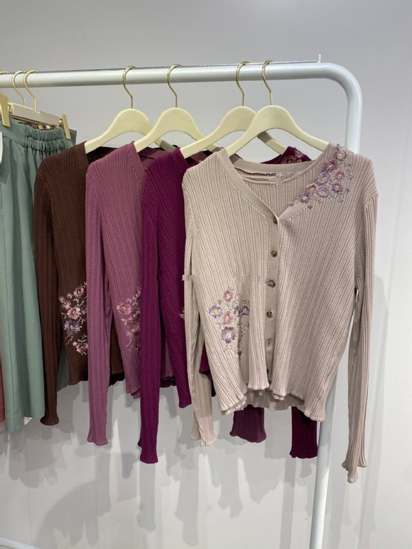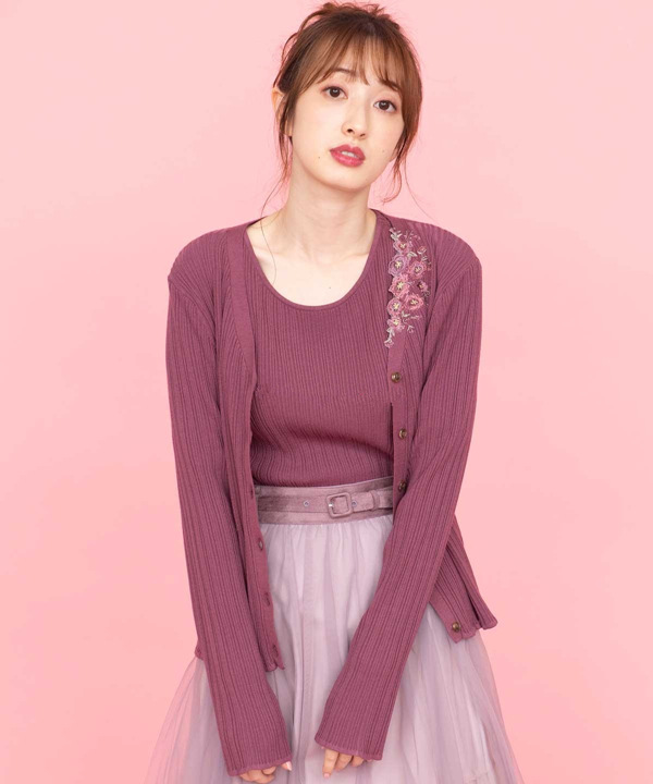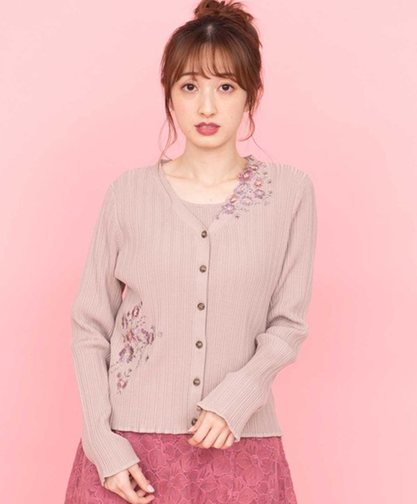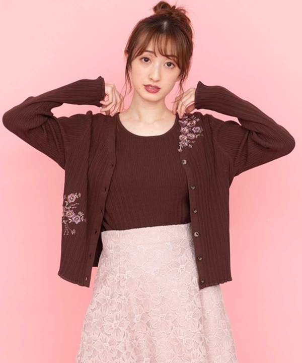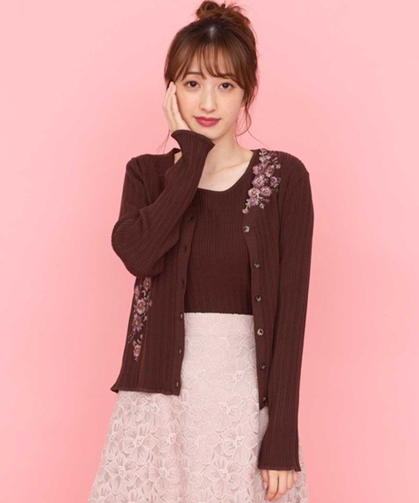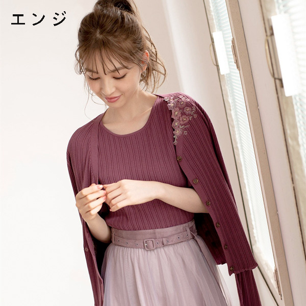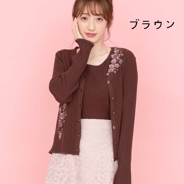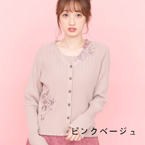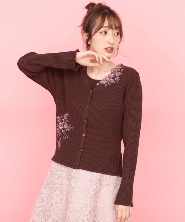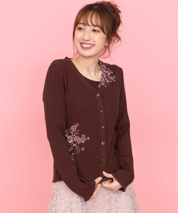 カーディガンにアシンメトリーにあしらわれた刺繍がポイントのツインニット。