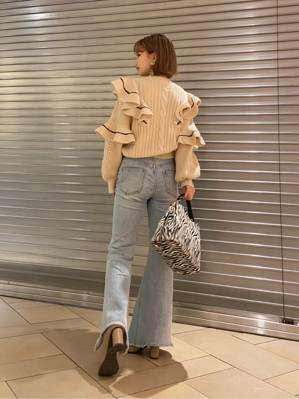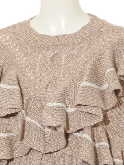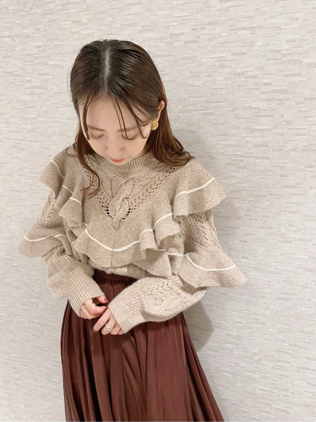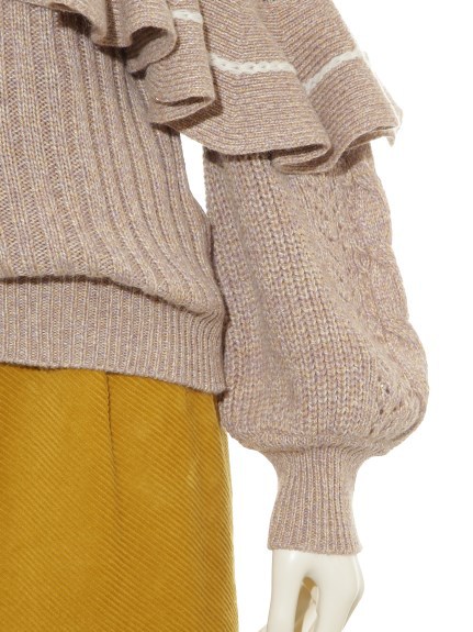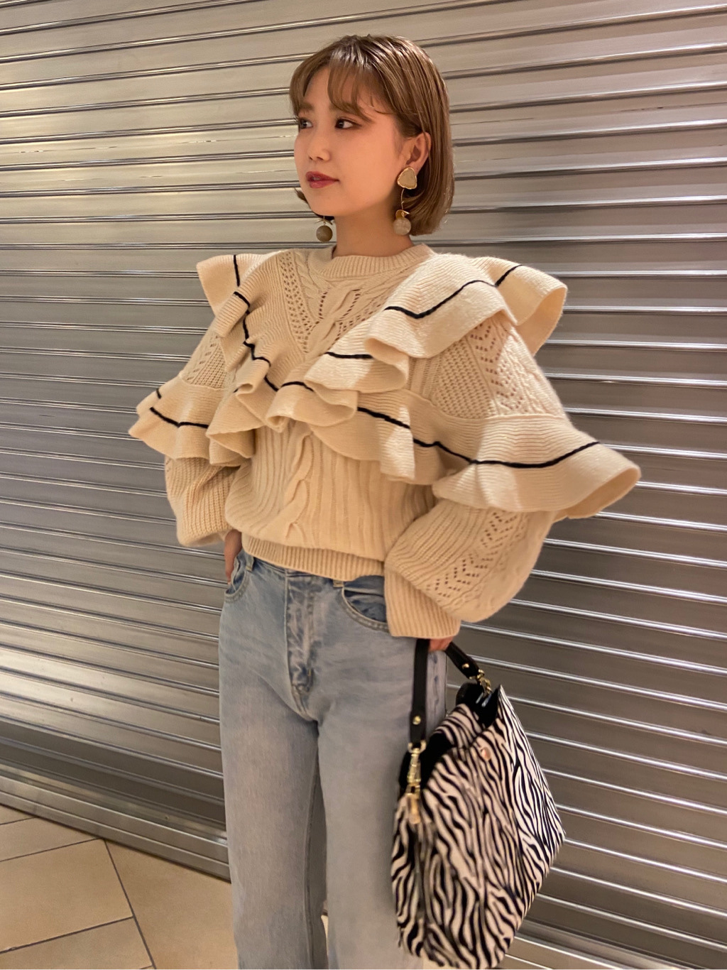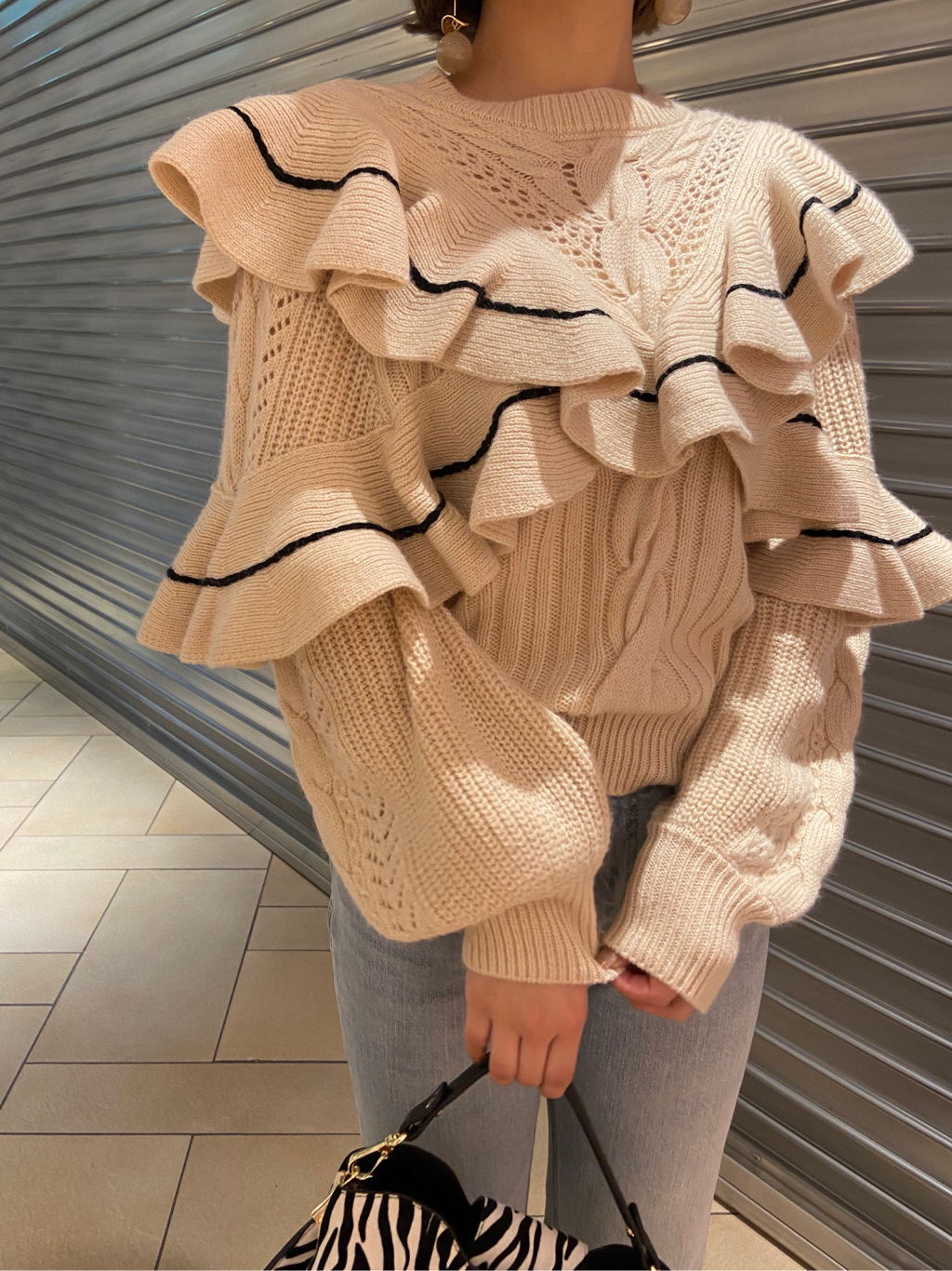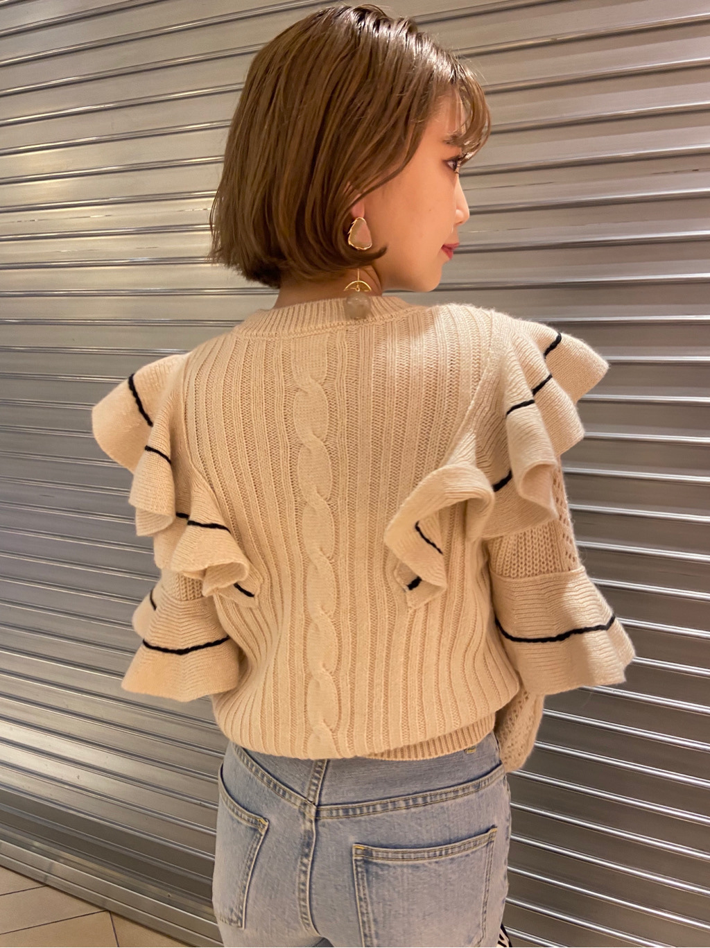 肩から袖に向かってボリュームのあるフリルをあしらったニットトップス。フリルの裾には配色を入れアクセントのあるデザインに仕上げています。OWHTにはブラック、PBEGにはホワイト、BLKにはブルーの配色です。身頃と袖中央のケーブル編みも程よいアクセントに。 素材:ナイロン、レーヨン、ポリエステル サイズ表記 総丈 裄丈 袖口 バスト F 50.5cm 77cm 8cm 80cm