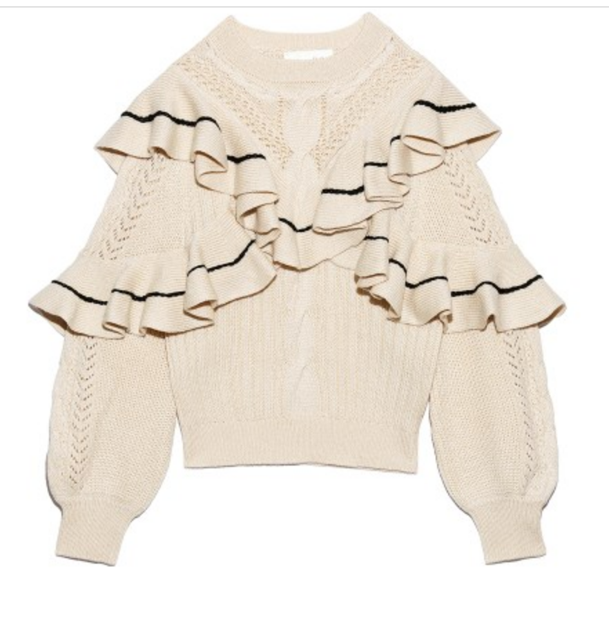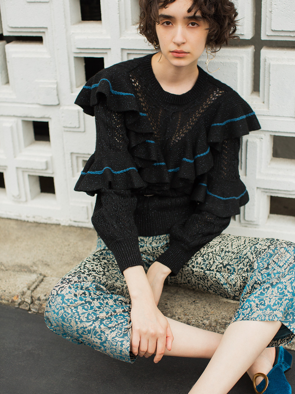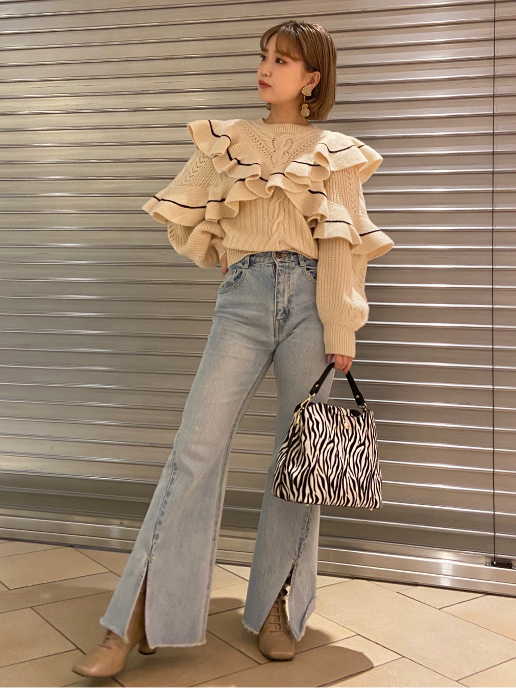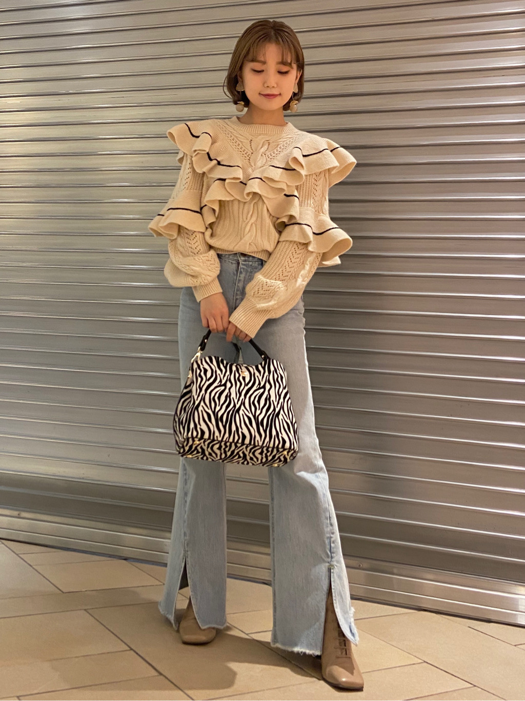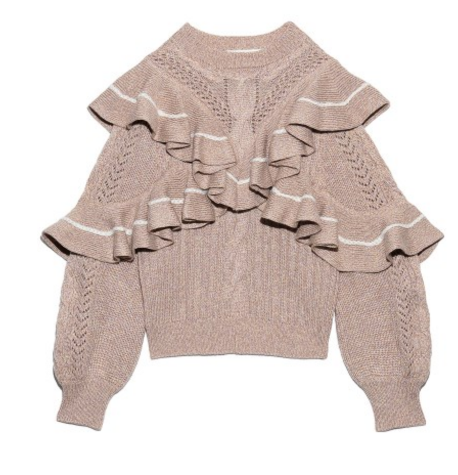肩から袖に向かってボリュームのあるフリルをあしらったニットトップス。フリルの裾には配色を入れアクセントのあるデザインに仕上げています。OWHTにはブラック、PBEGにはホワイト、BLKにはブルーの配色です。身頃と袖中央のケーブル編みも程よいアクセントに。 素材:ナイロン、レーヨン、ポリエステル サイズ表記 総丈 裄丈 袖口 バスト F 50.5cm 77cm 8cm 80cm