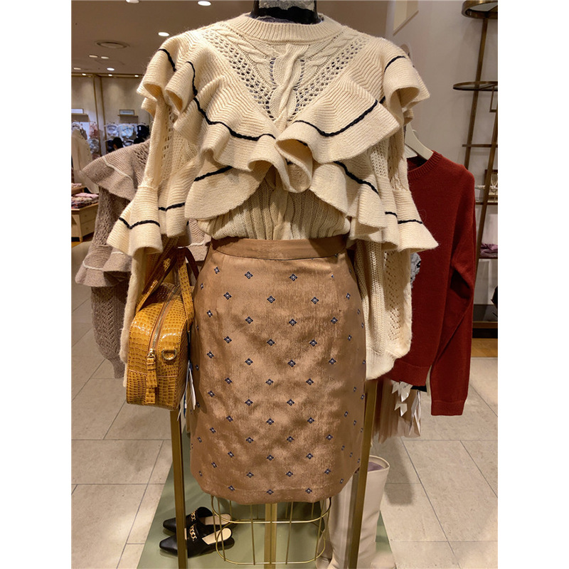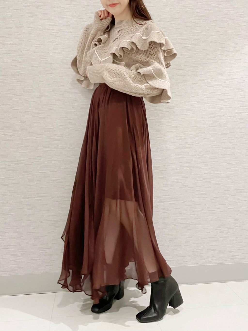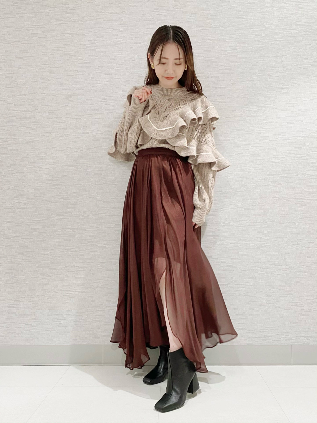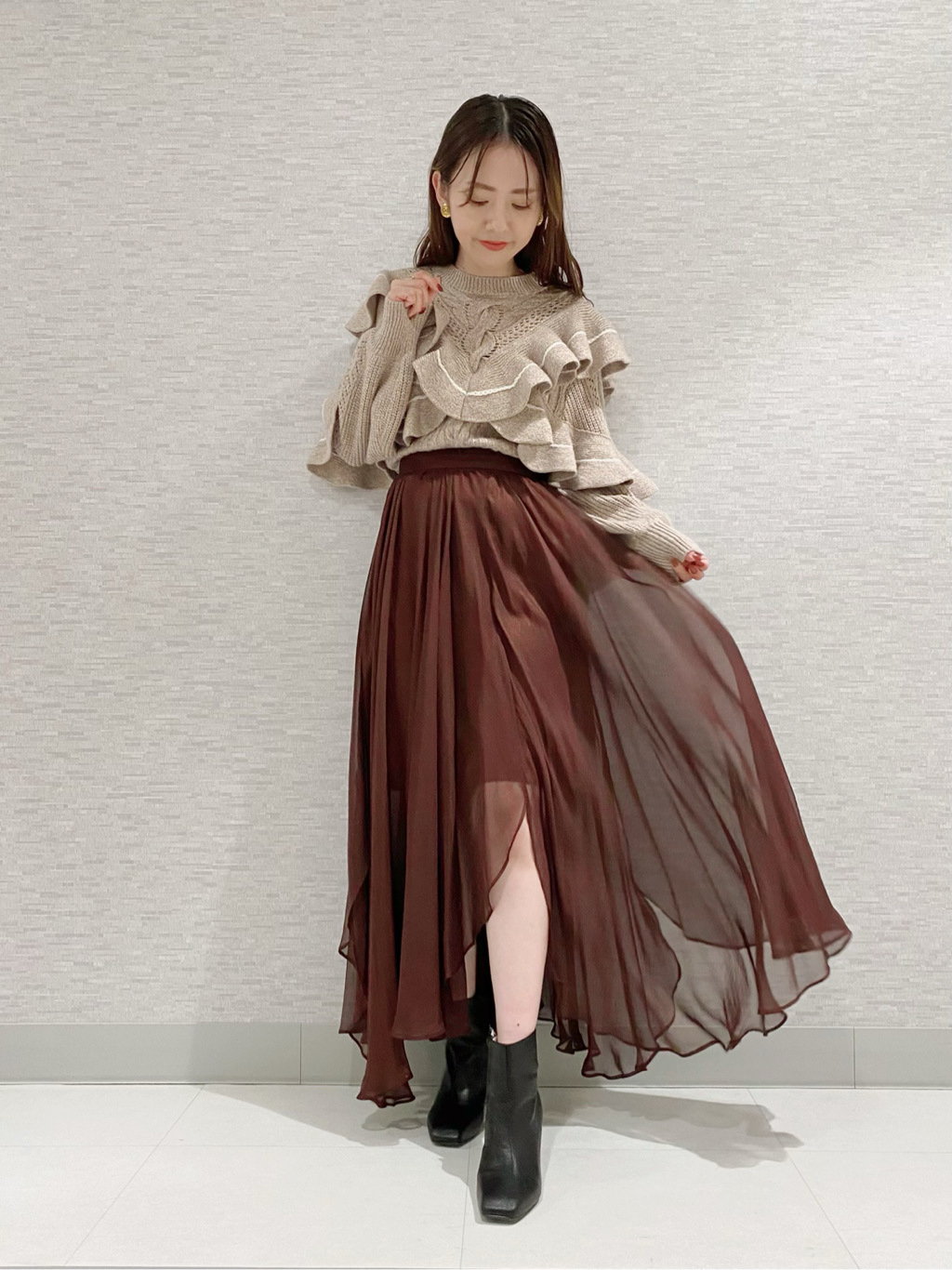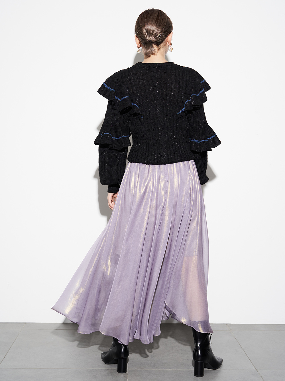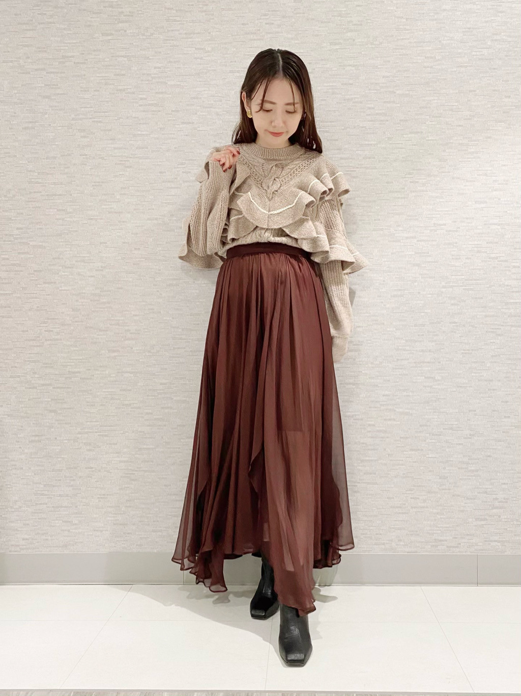 肩から袖に向かってボリュームのあるフリルをあしらったニットトップス。フリルの裾には配色を入れアクセントのあるデザインに仕上げています。OWHTにはブラック、PBEGにはホワイト、BLKにはブルーの配色です。身頃と袖中央のケーブル編みも程よいアクセントに。 素材:ナイロン、レーヨン、ポリエステル サイズ表記 総丈 裄丈 袖口 バスト F 50.5cm 77cm 8cm 80cm