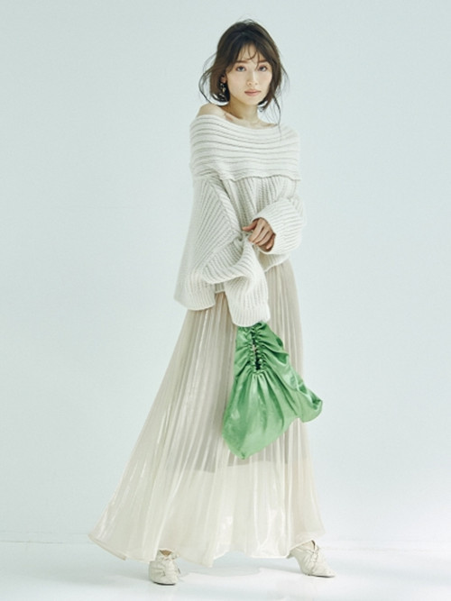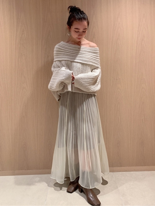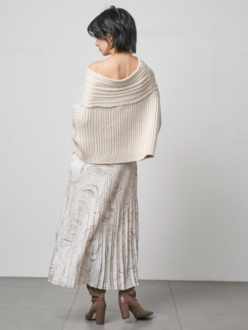 アシンメトリーのネックラインが特徴のケーブルニットは、毛糸の暖かみとエッジの効いたデザインをバランス良く表現した一枚。程良い肌見せが抜け感をもたらし、ゆったりとした身幅やドロップショルダーで女性らしさを強調しました。パーツに合わせて編み地を変化させ、シャープに魅せるランダムリブと細ケーブルで大人に似合うシックな装いを意識しています。短めの丈感はパンツにもスカートにも合わせやすく、「SNIDEL」らしいフェミニンさでコーディネートを彩ります。