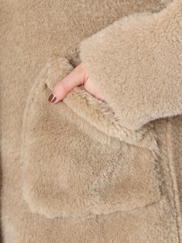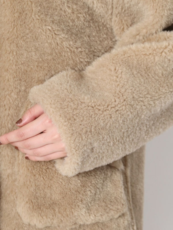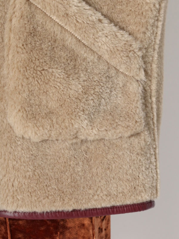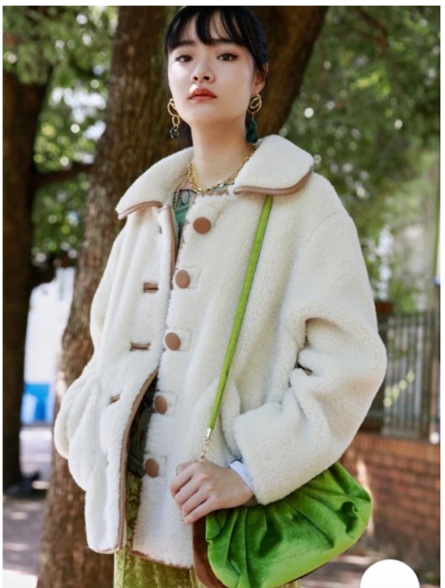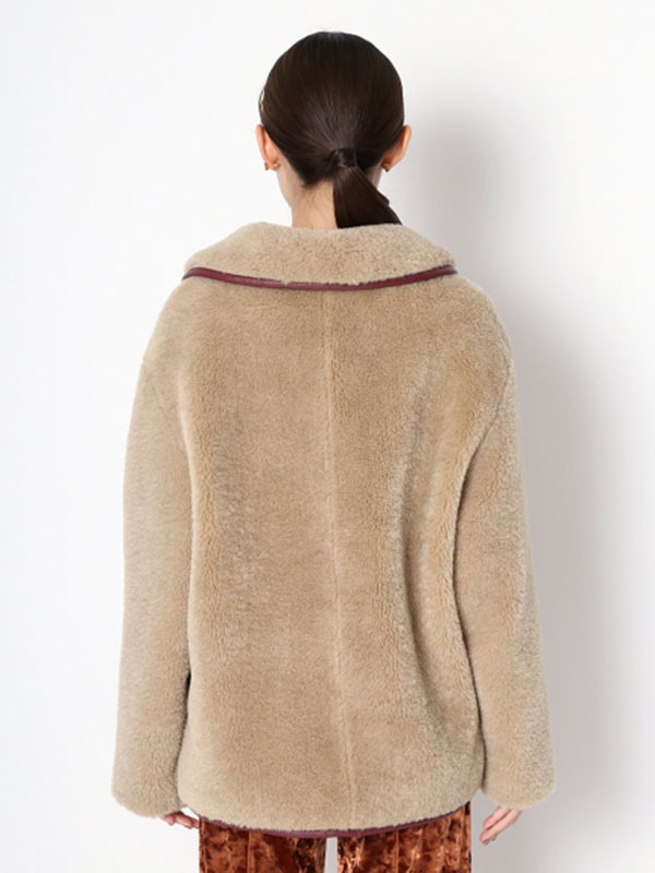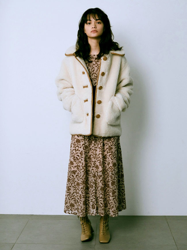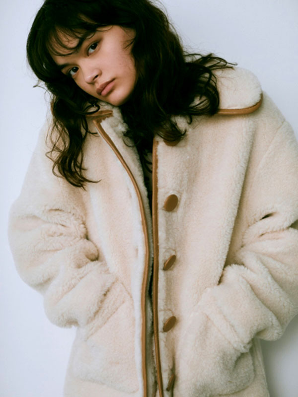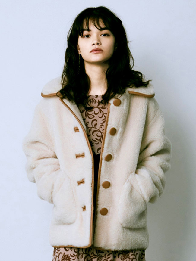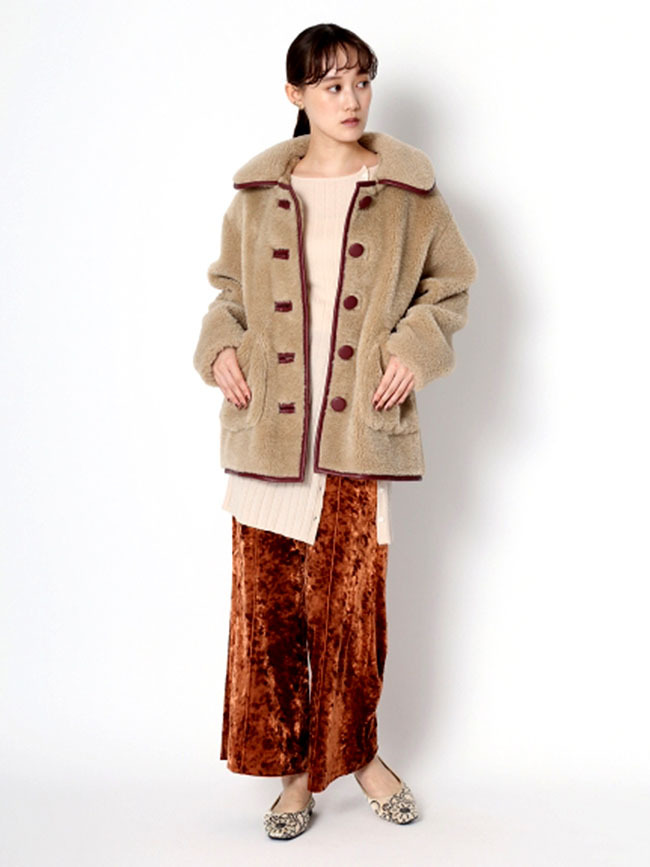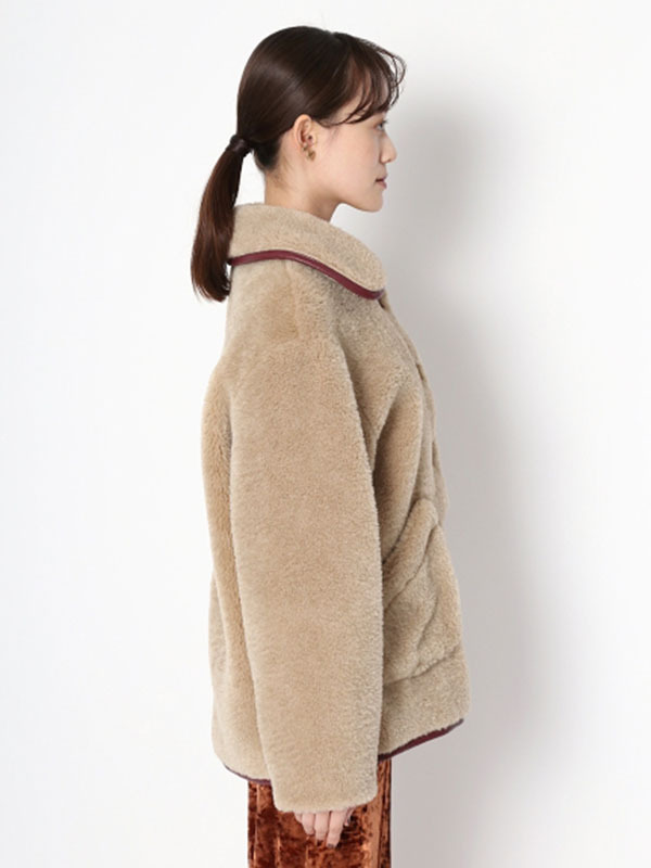 フェイクレザーのパイピング使いで、ヴィンテージライクに表現したボアコート。ふんわりと女性らしいボアの魅力を活かしつつ、配色デザインで少しクールな印象をプラスしました。 贅沢なボリュームに大きめにつけたポケットで寒い日もおしゃれに防寒できます。ミドル丈なのでバランスがとりやすく、ワンピースやパンツなどいろいろなアイテムに合わせやすい丈感で仕上げました。