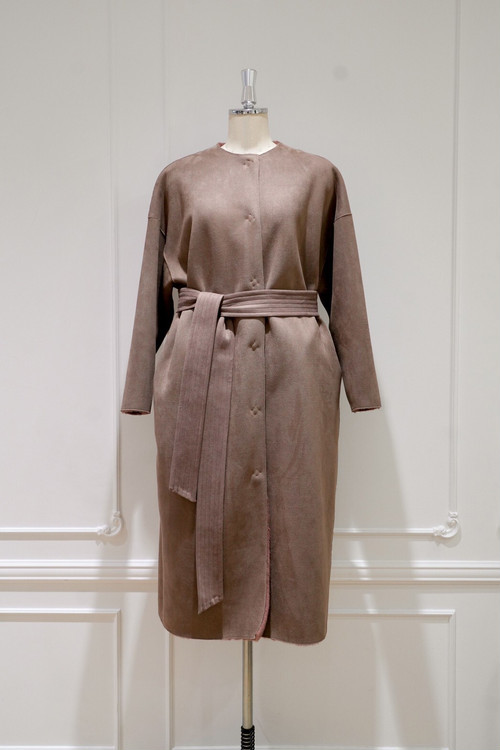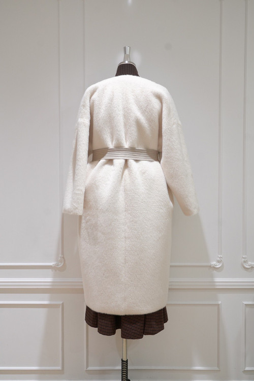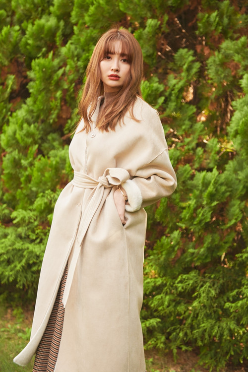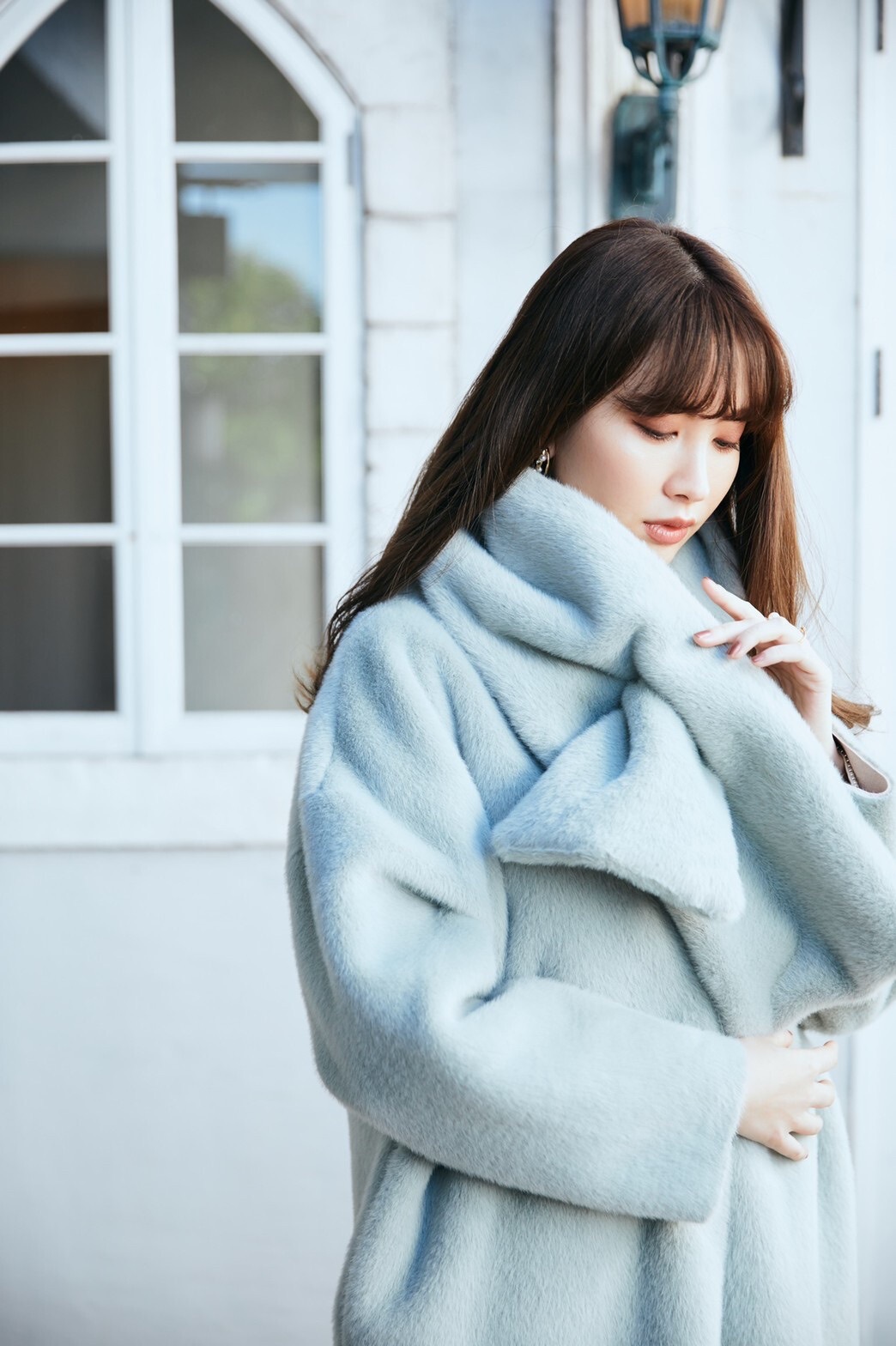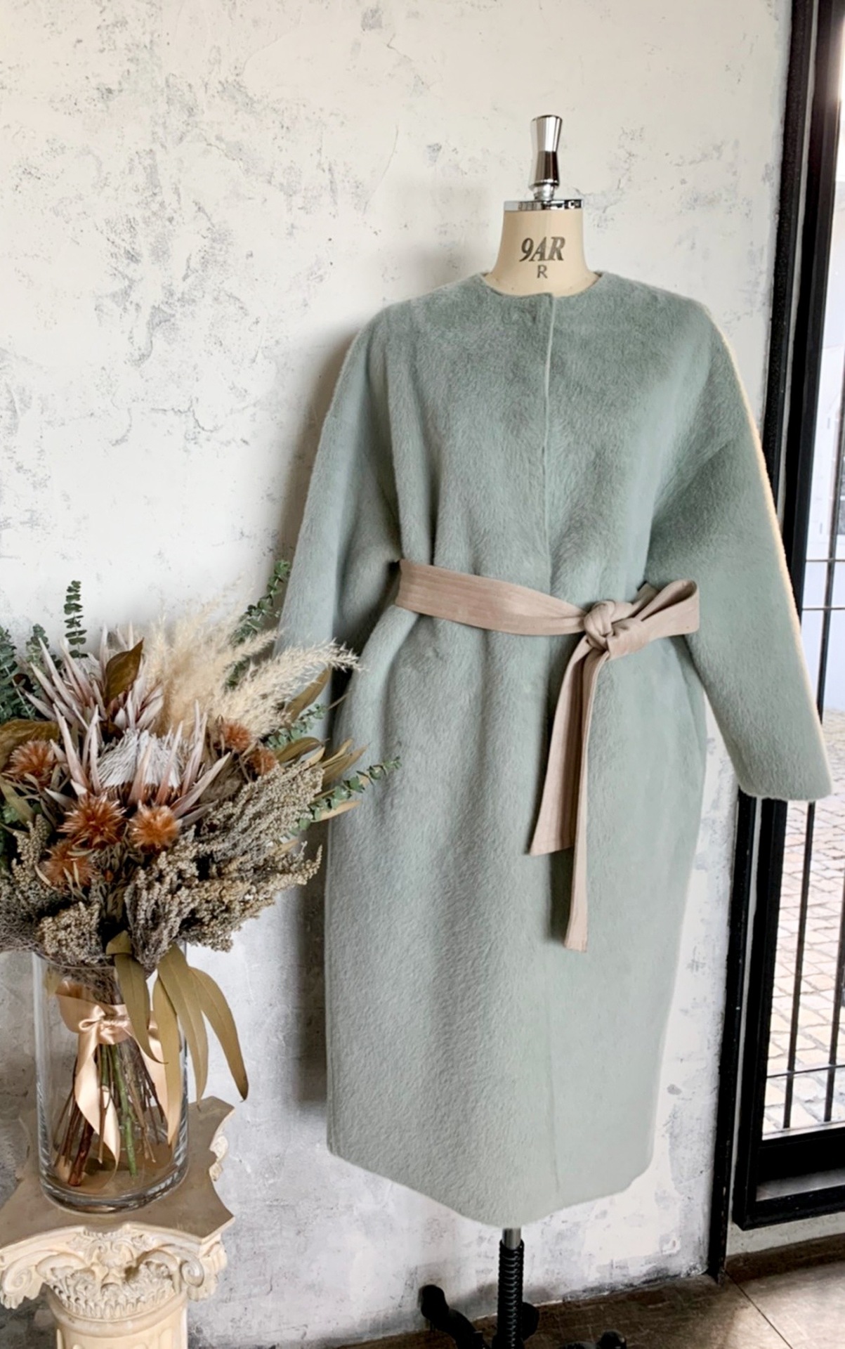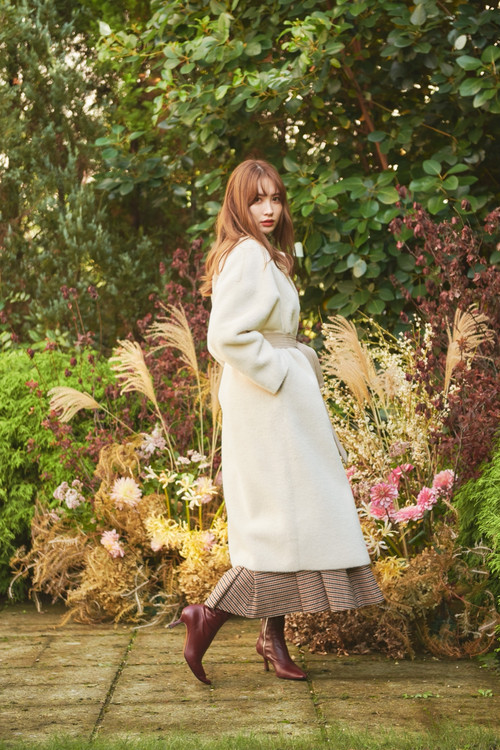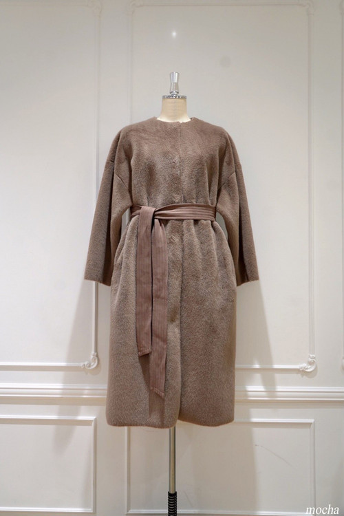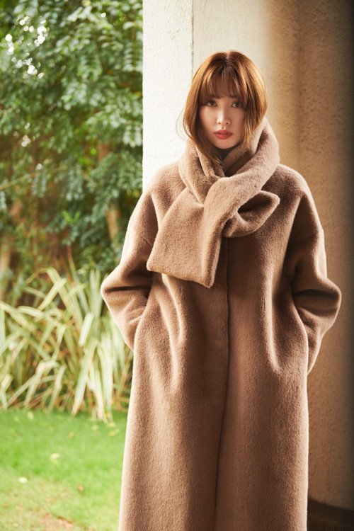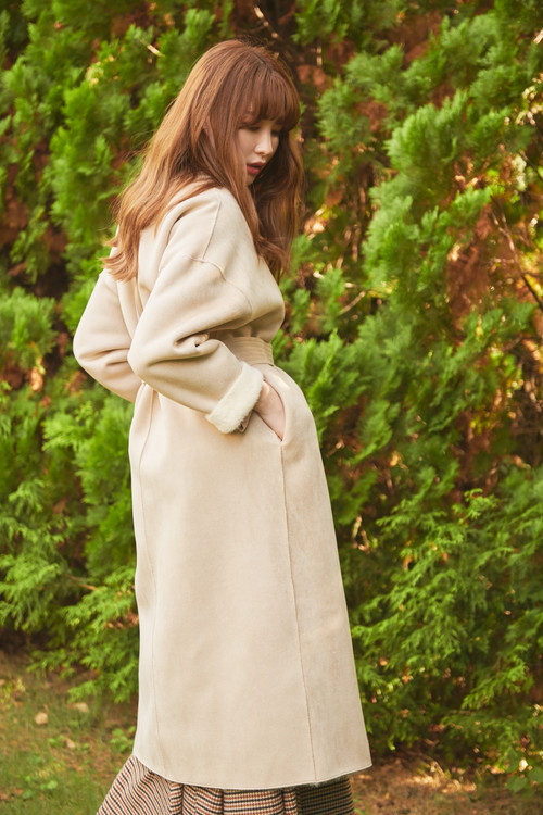 美しいシームレスのはぎは、どちらの面を表にしても綺麗にお召しいただけるリバーシブル。袖を折り返し、表情の違いを楽しんでいただくのもおすすめです。フェミニンな雰囲気を演出してくれる同素材のティペットと、ステッチを施したスウェード調のベルトをセットにし何通りもの着こなしができる今シーズンの”IT”アウターです。