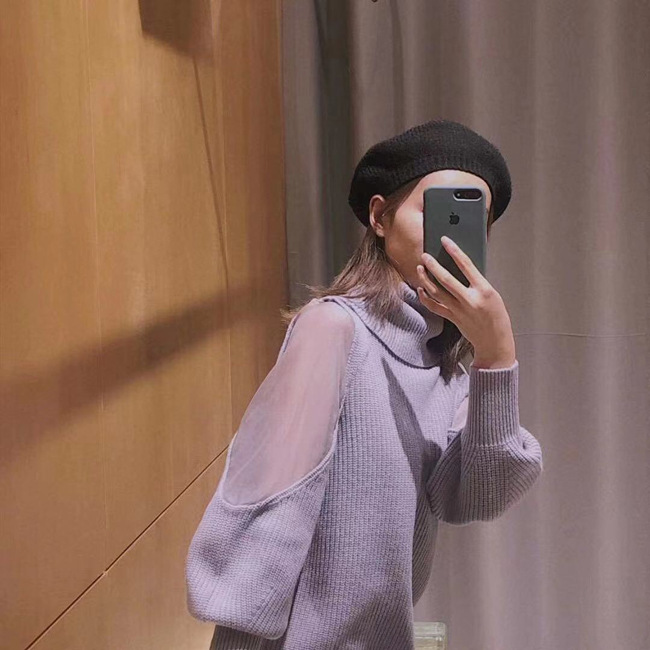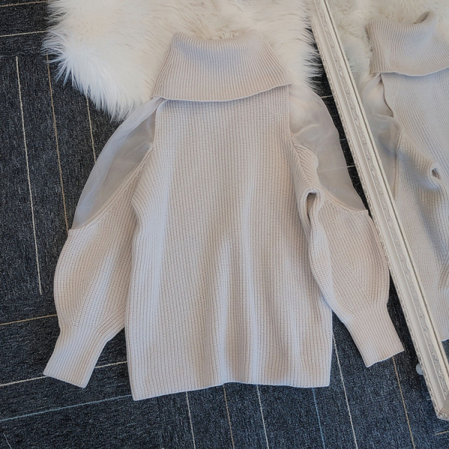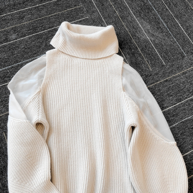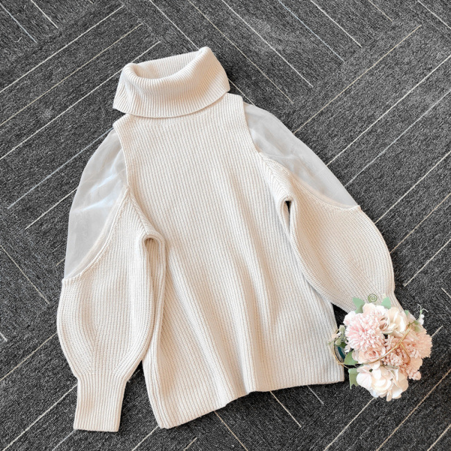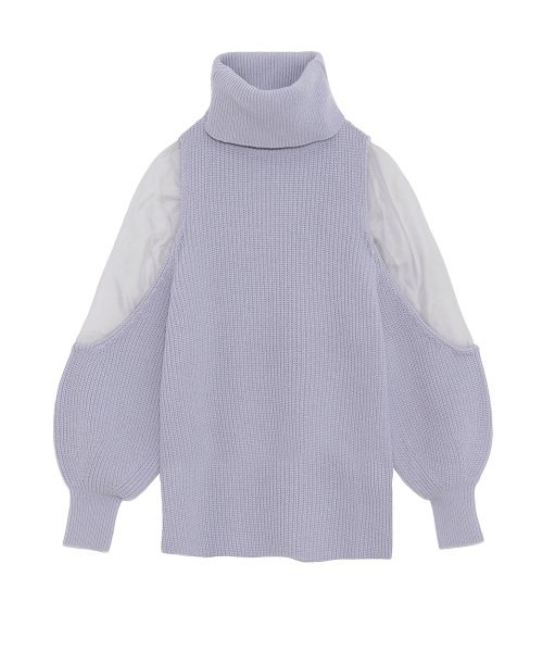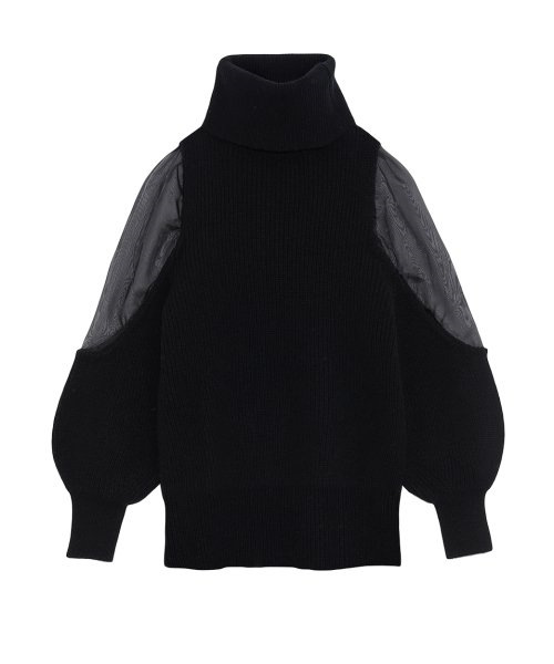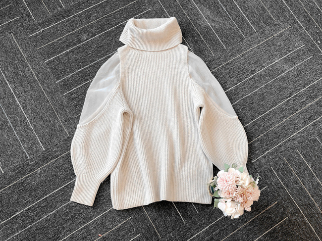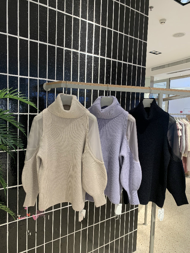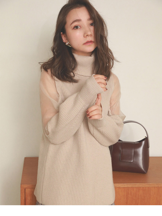 暖かなウール糸のニットに、透け感のあるオーガンジーをドッキングしました。アイボリー、パープル、ブラックの3色展開です。