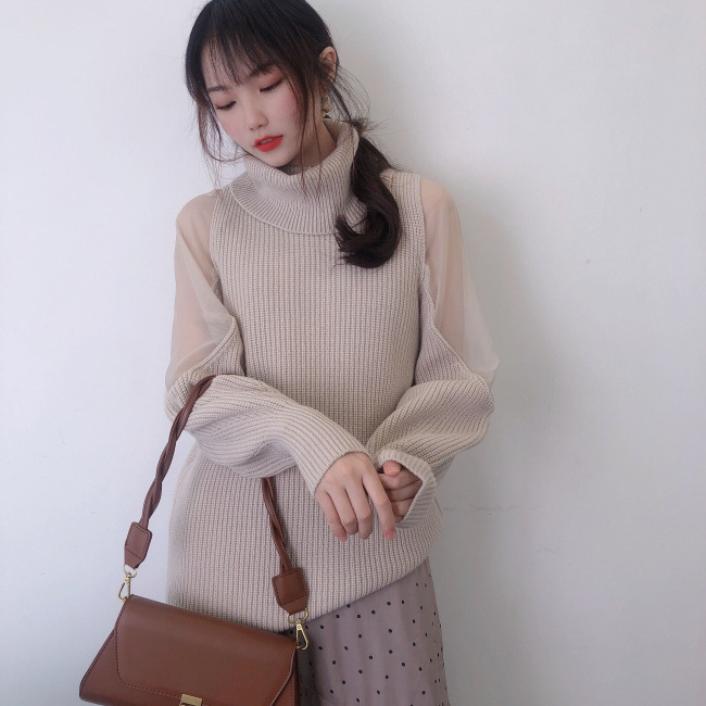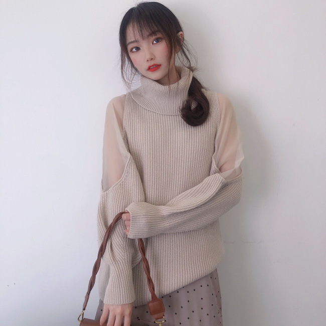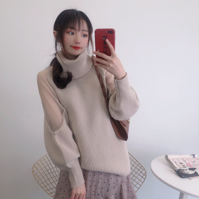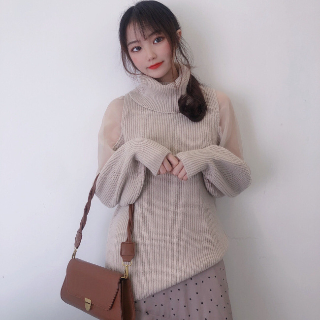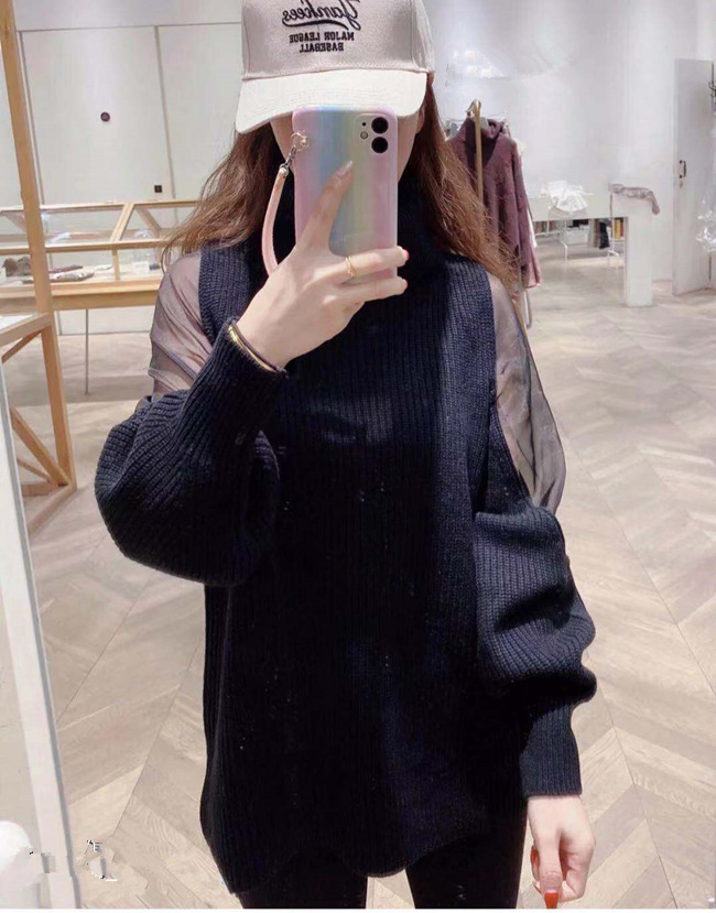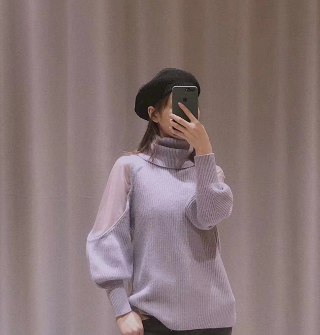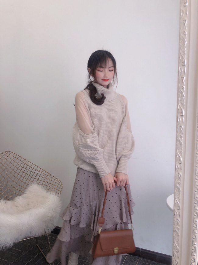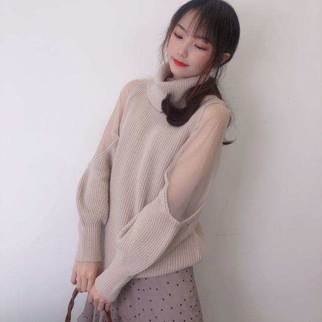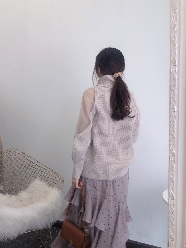 暖かなウール糸のニットに、透け感のあるオーガンジーをドッキングしました。アイボリー、パープル、ブラックの3色展開です。