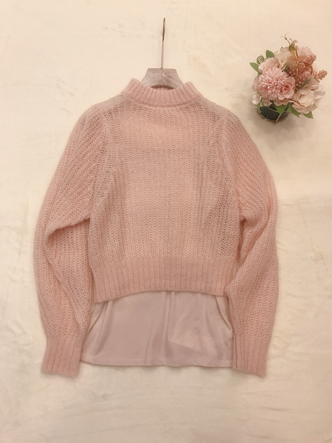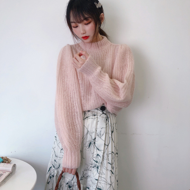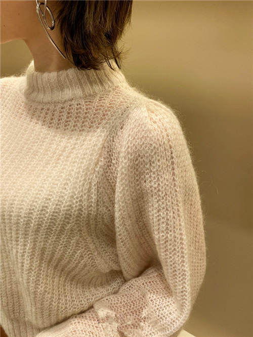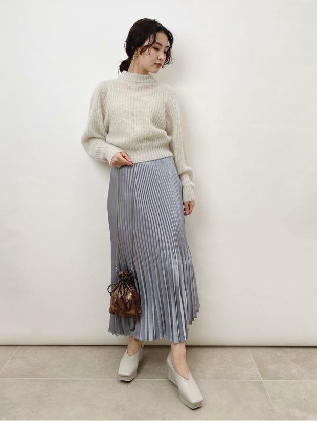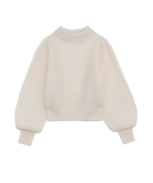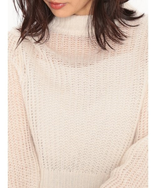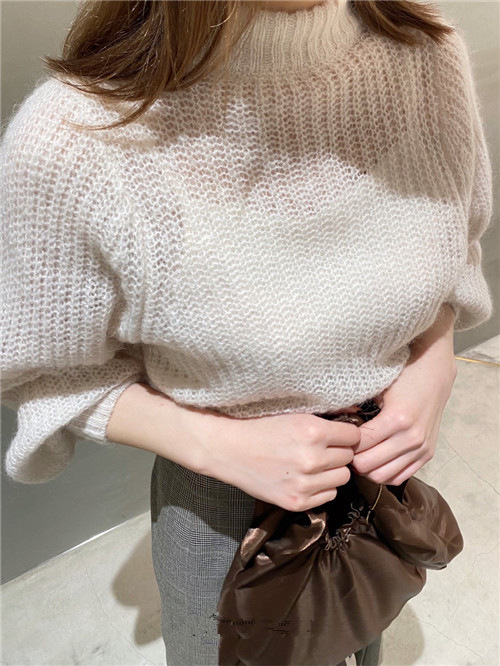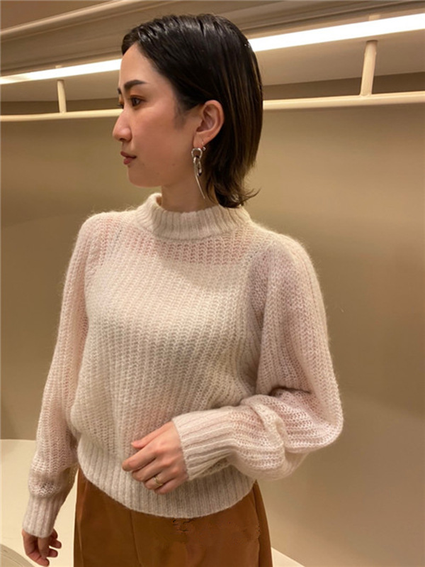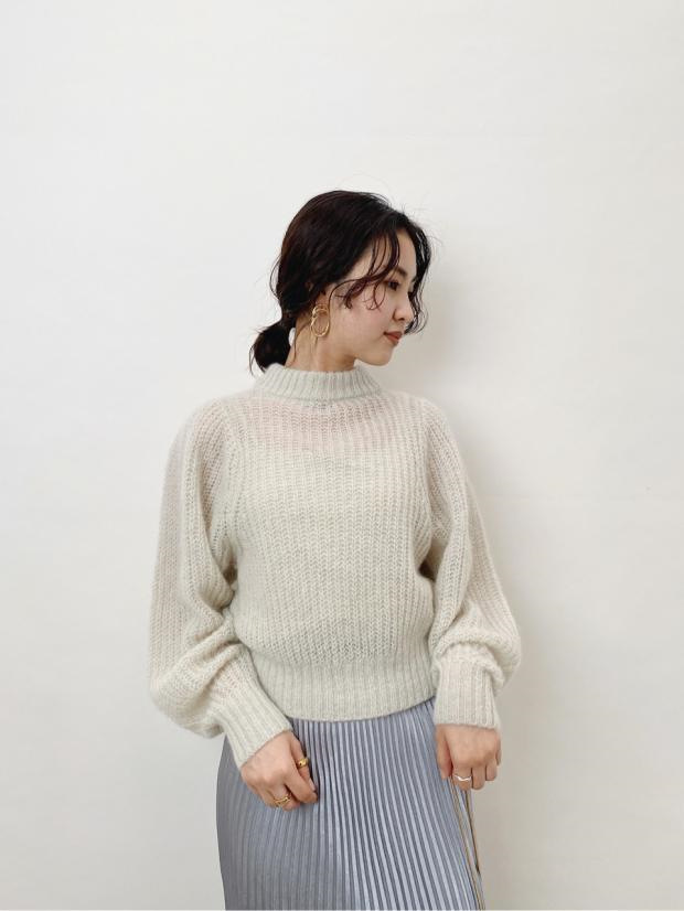 ローゲージのざっくり感とモヘアのふわふわな質感を掛け合わせた、華やかな透け感が魅力のニット。モックネックで品の良さをキープしつつ、広めのアームホールとボリュームスリーブで愛らしさを演出。しっかりと詰まった太い裾リブがウエストカーブにフィットし、IN/OUTどちらも綺麗に映える美しいシルエットを実現しました。ハイウエストボトムスと相性の良い丈で、ナロースカート(品番SWFS205078)とのコーディネートがおすすめ。インナーキャミソールがセットになっています。