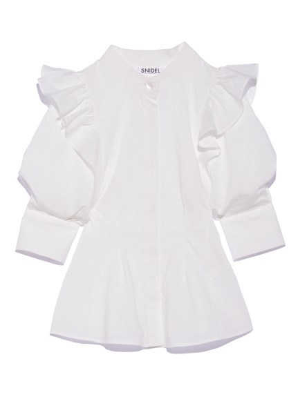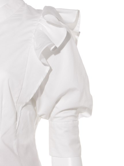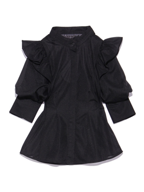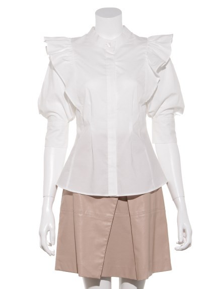 華やかながらどこかモードな印象のブラウス。フリルは肩部分はギャザーでしっかりボリュームをだしつつ、身頃に向かってすっきりとしているので甘くなりすぎない印象に。