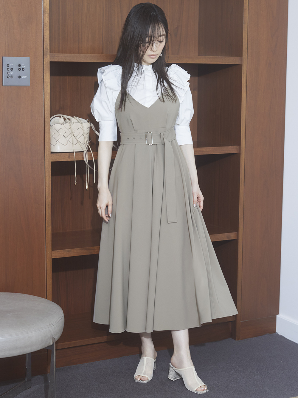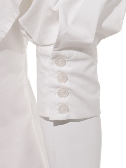 スタンドカラーも相まって、トレンドのクラシカルな雰囲気に。華やかなディテールが引き立つように、比翼仕立てでボタンを隠してミニマル仕上げたのもポイントです。