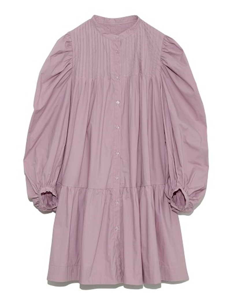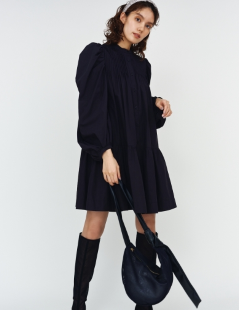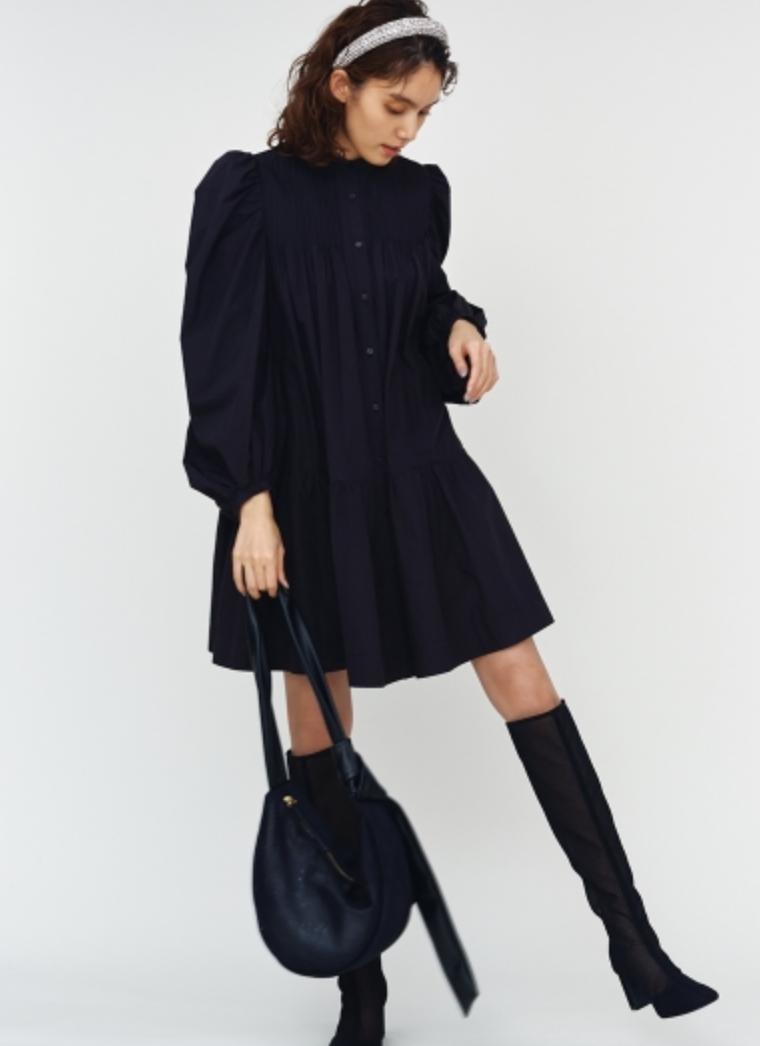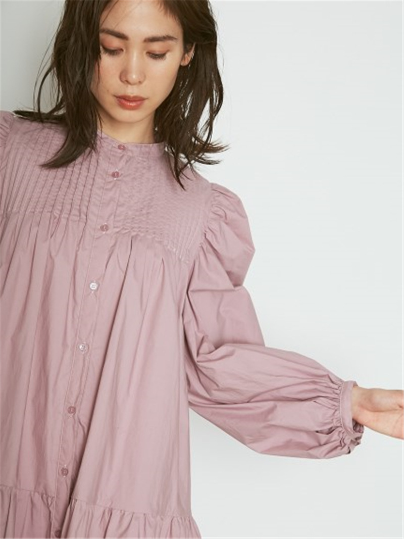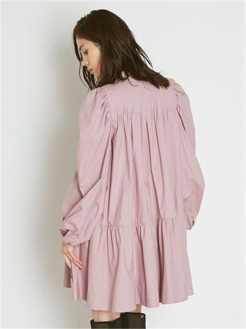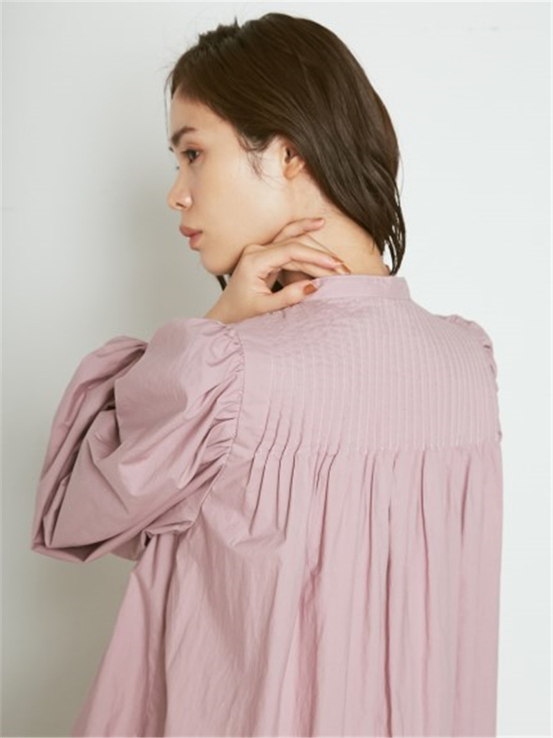 ギャザーを寄せたボリュームスリーブやフレア切り替えが、トレンド感と華やかさを助長。前後にたっぷり施したピンタックも相まって、モードな甘さが漂う一枚です。