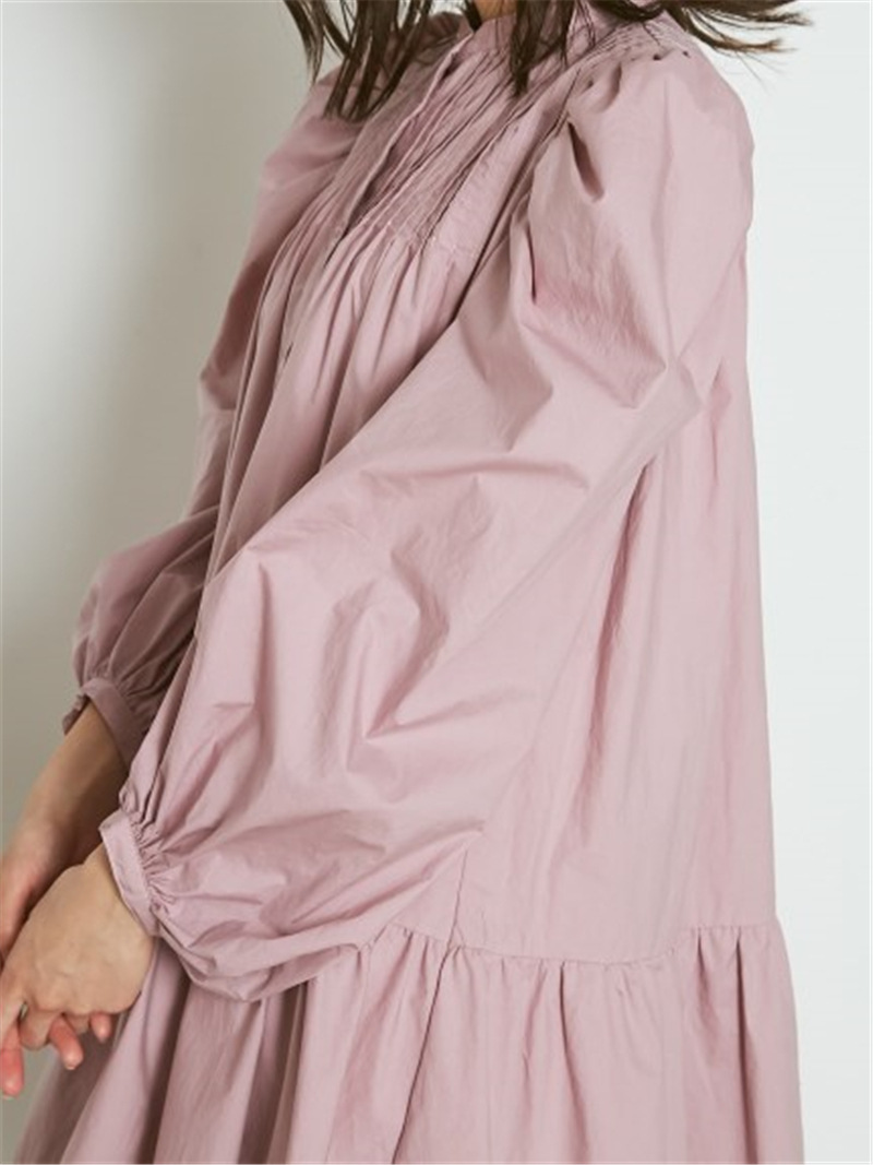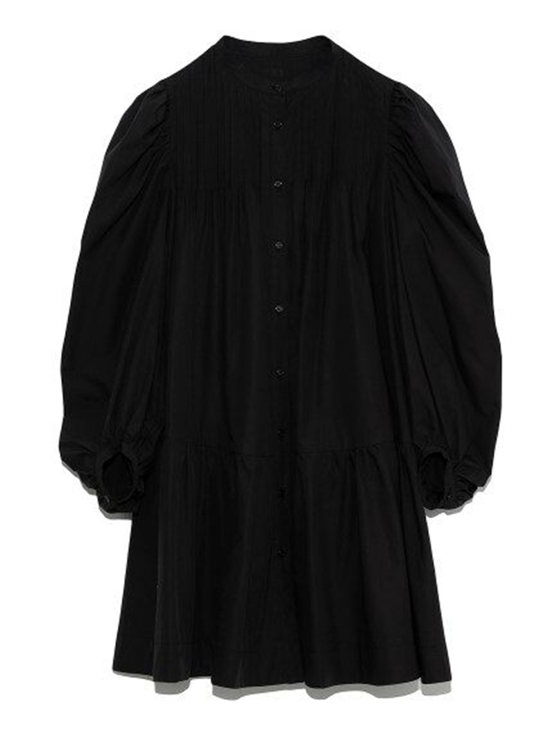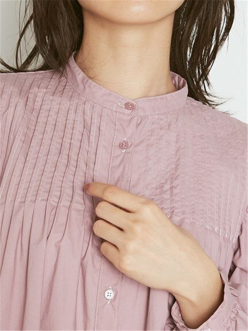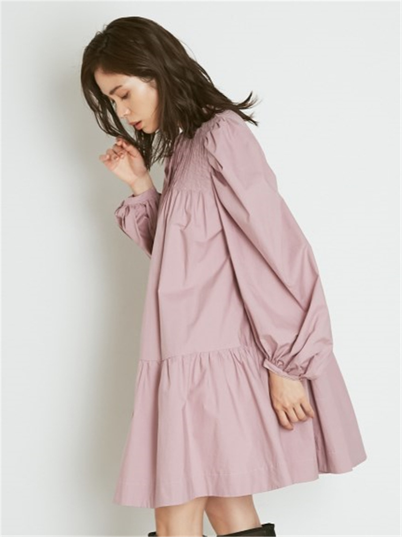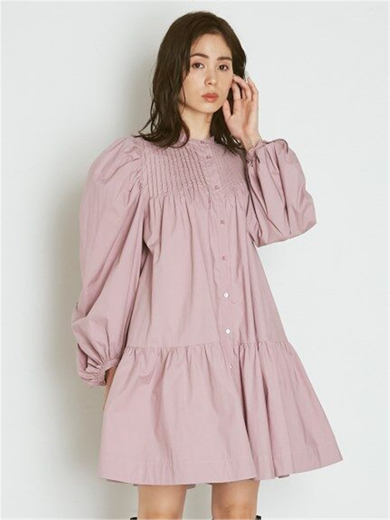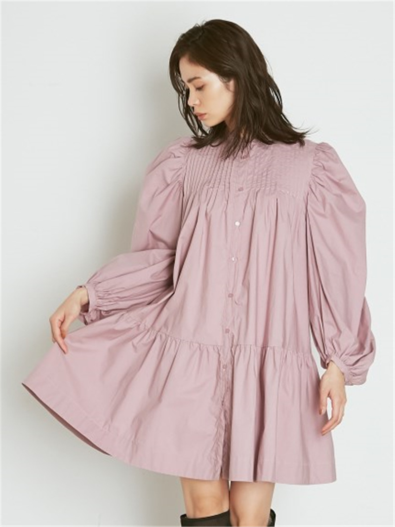 ギャザーを寄せたボリュームスリーブやフレア切り替えが、トレンド感と華やかさを助長。前後にたっぷり施したピンタックも相まって、モードな甘さが漂う一枚です。