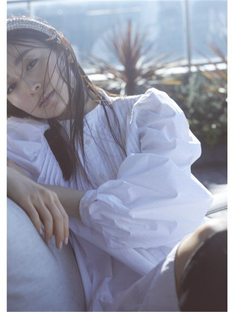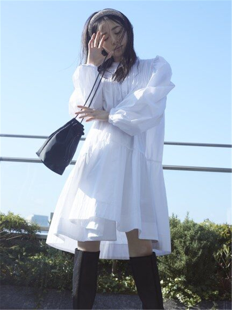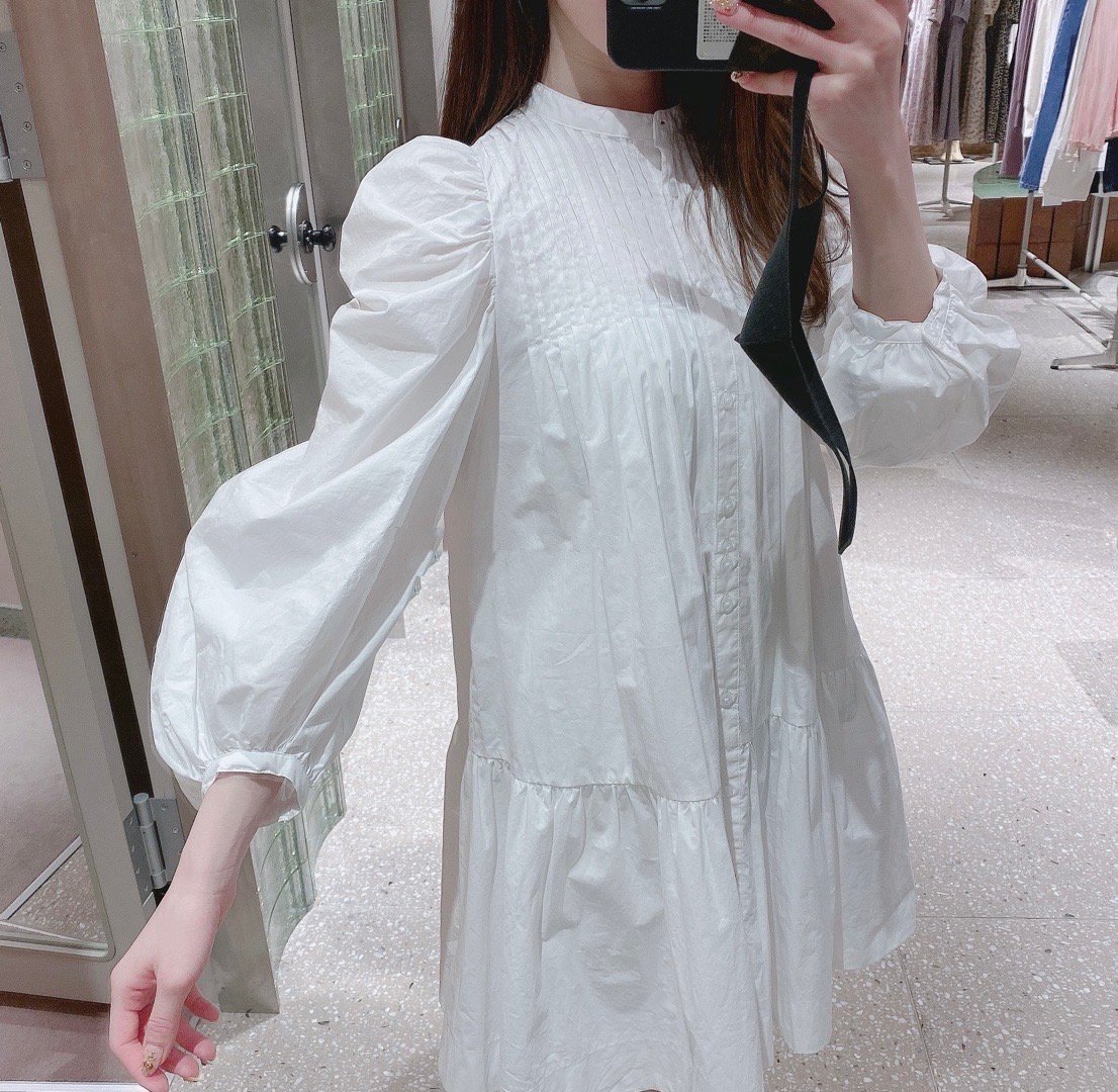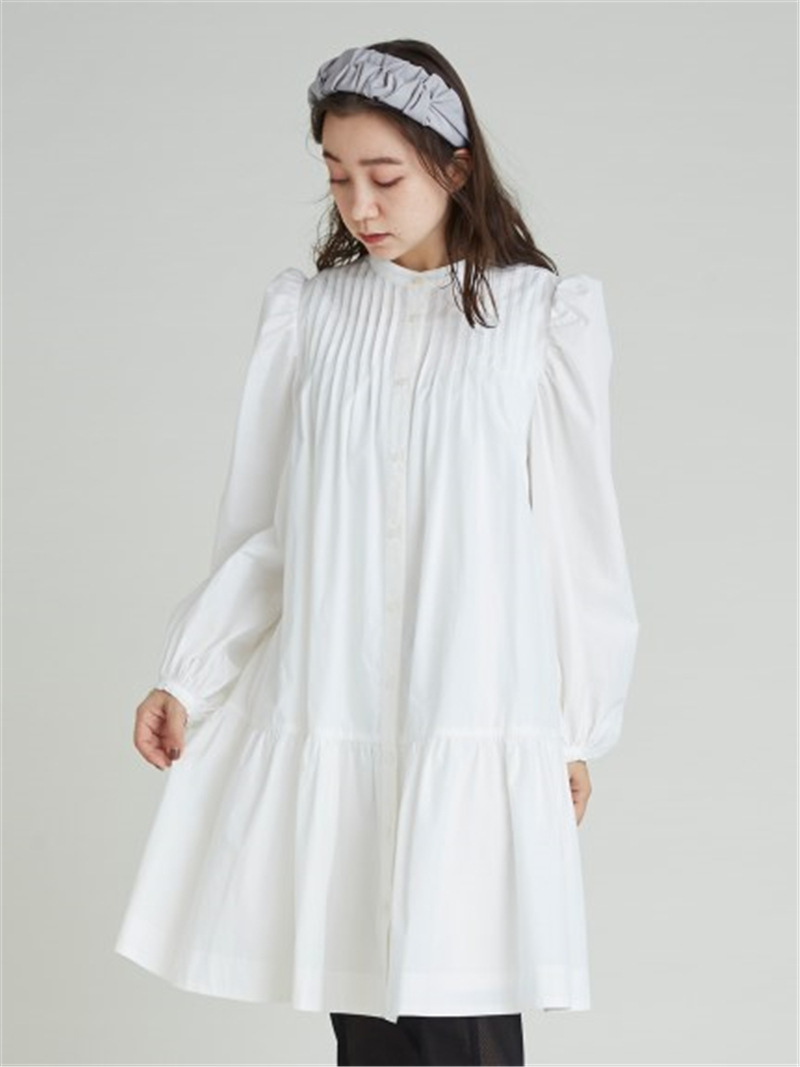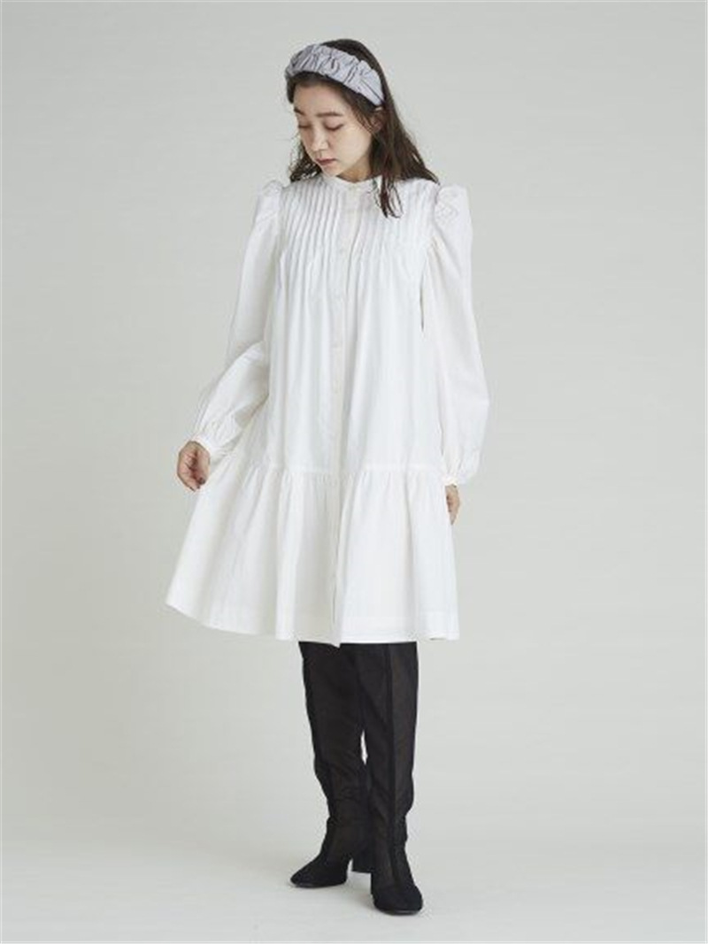 ギャザーを寄せたボリュームスリーブやフレア切り替えが、トレンド感と華やかさを助長。前後にたっぷり施したピンタックも相まって、モードな甘さが漂う一枚です。