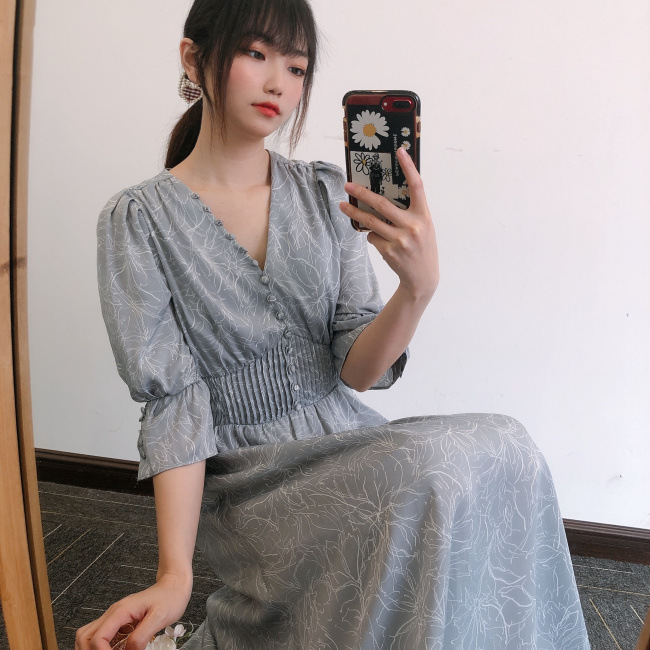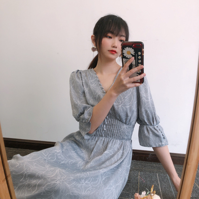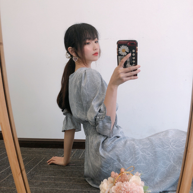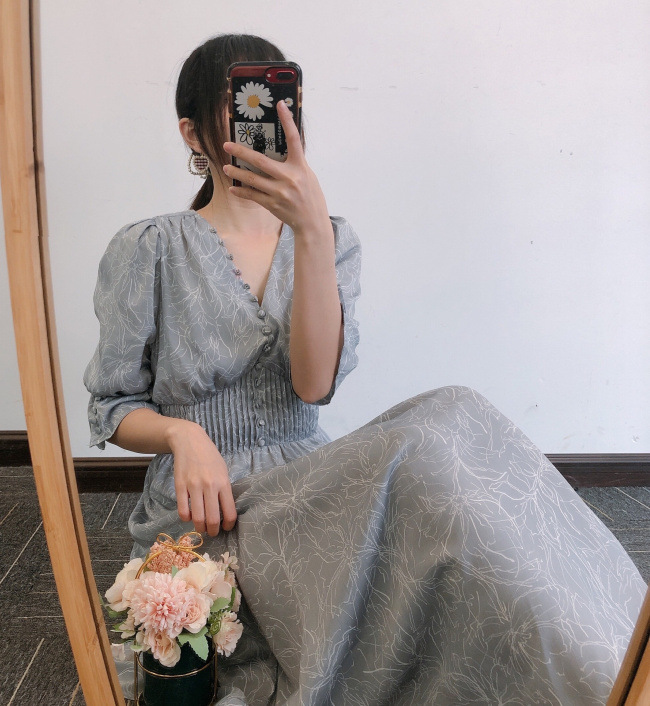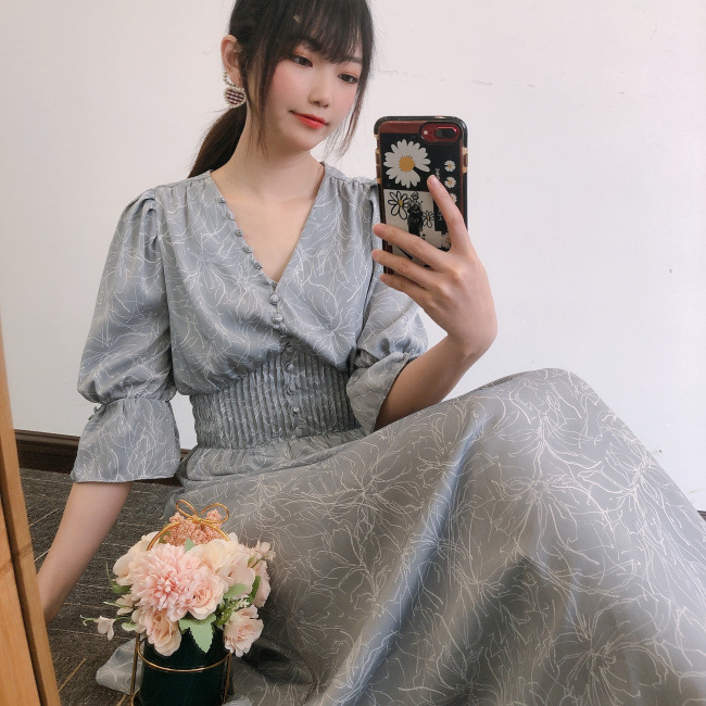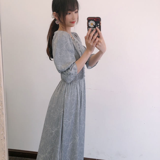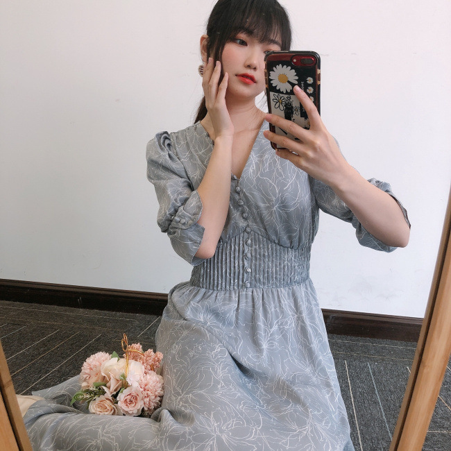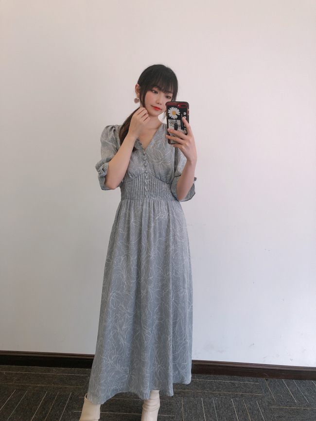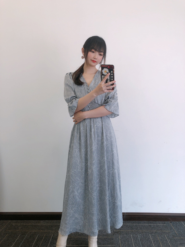 ラインフラワーウエストギャザーワンピース