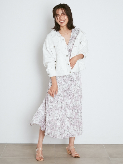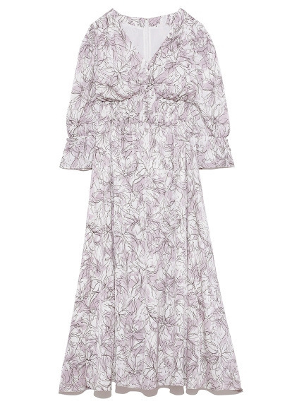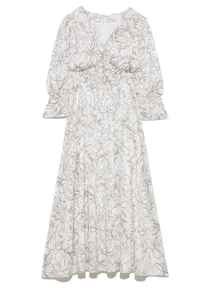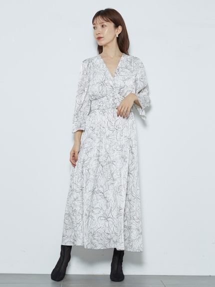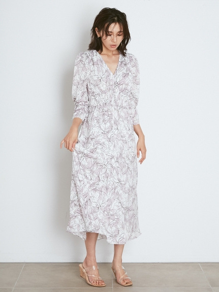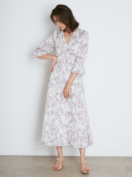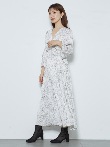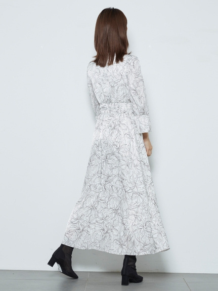 SNIDELで近年人気の線画を用いた花柄ワンピース。繊細なプリントが、大人な甘さを引き出します。今シーズンは、長めのカフスをアクセントにした袖コンシャスデザインで、どこかクラシカルに。ウエストに部分にシャーリングゴムを入れることで、女性らしいフィット&フレアなシルエットも実現しました。