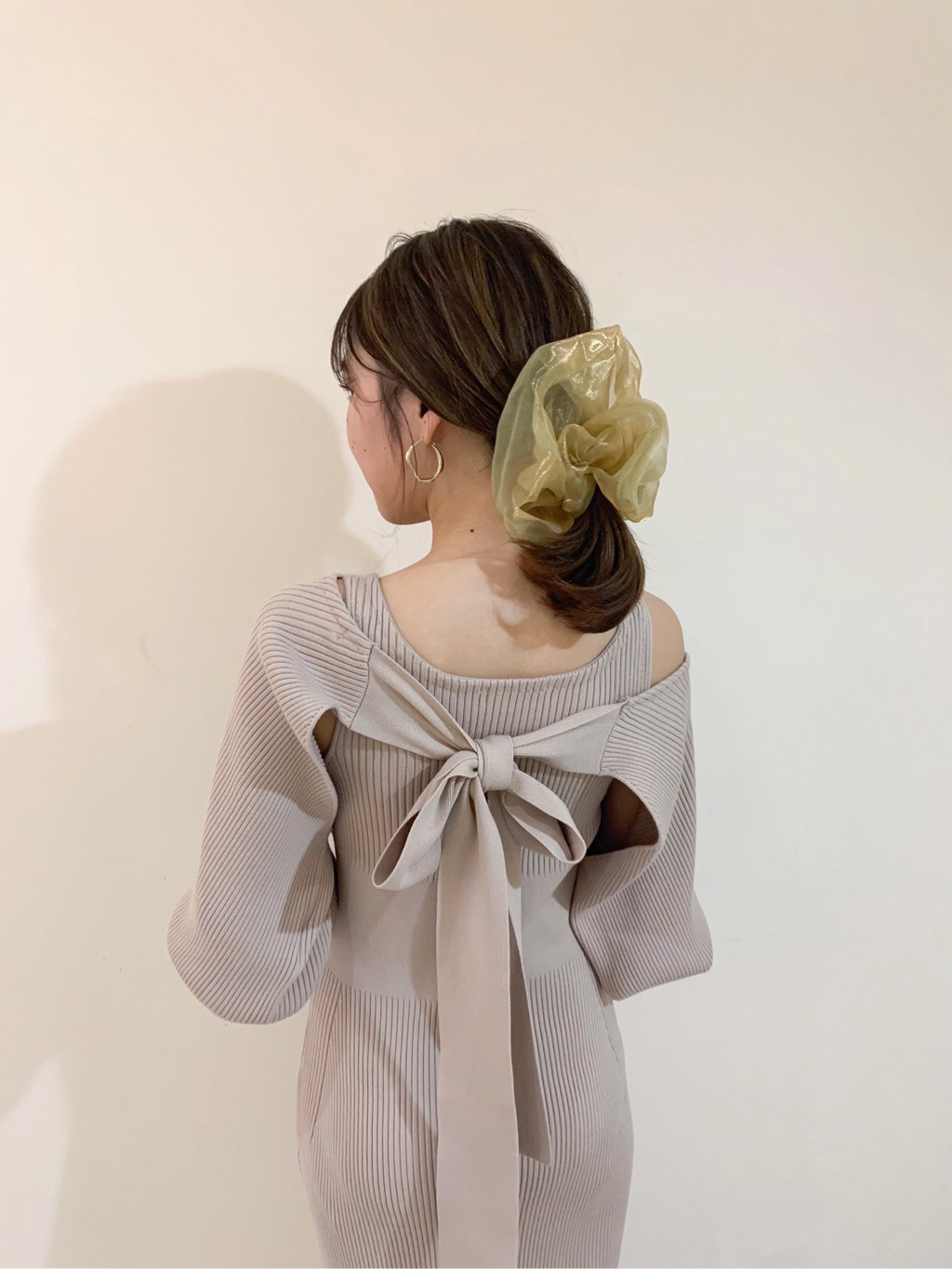 バックスタイルにリボンが付いており、後ろ姿を華やかに彩ります。