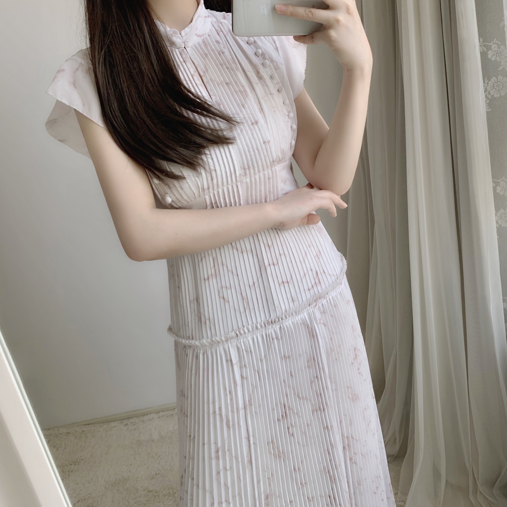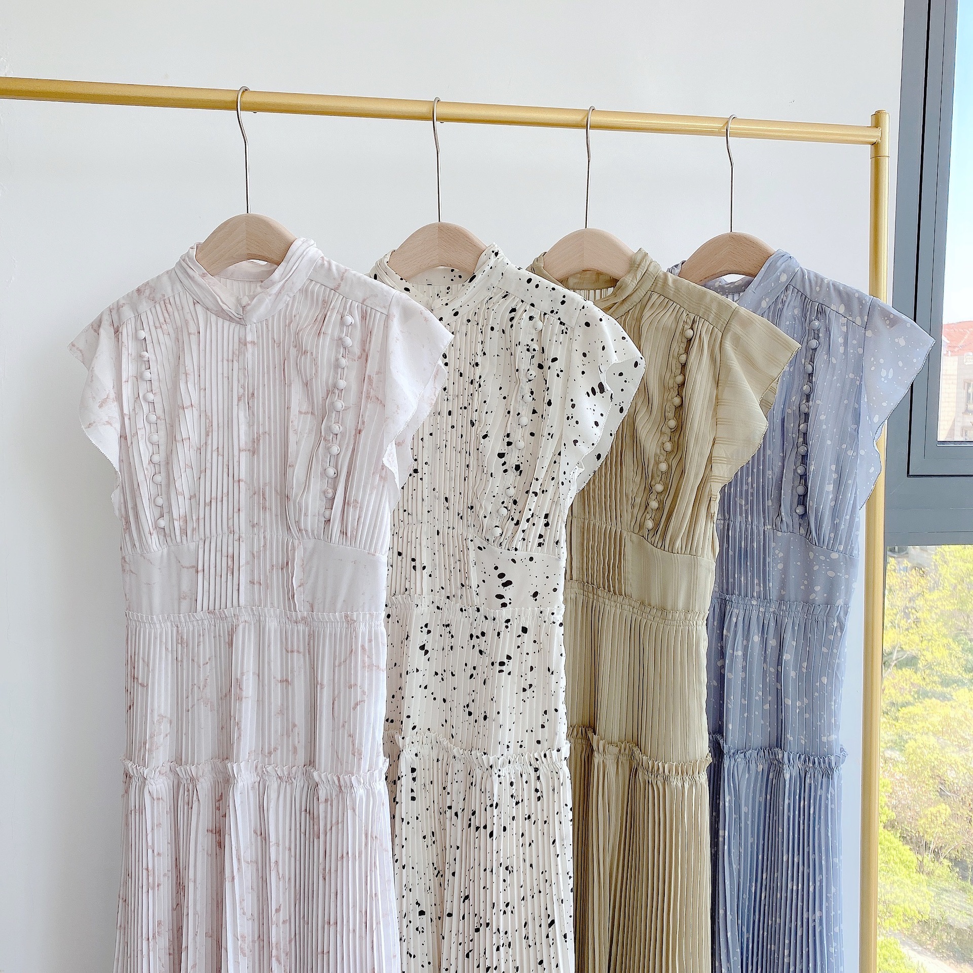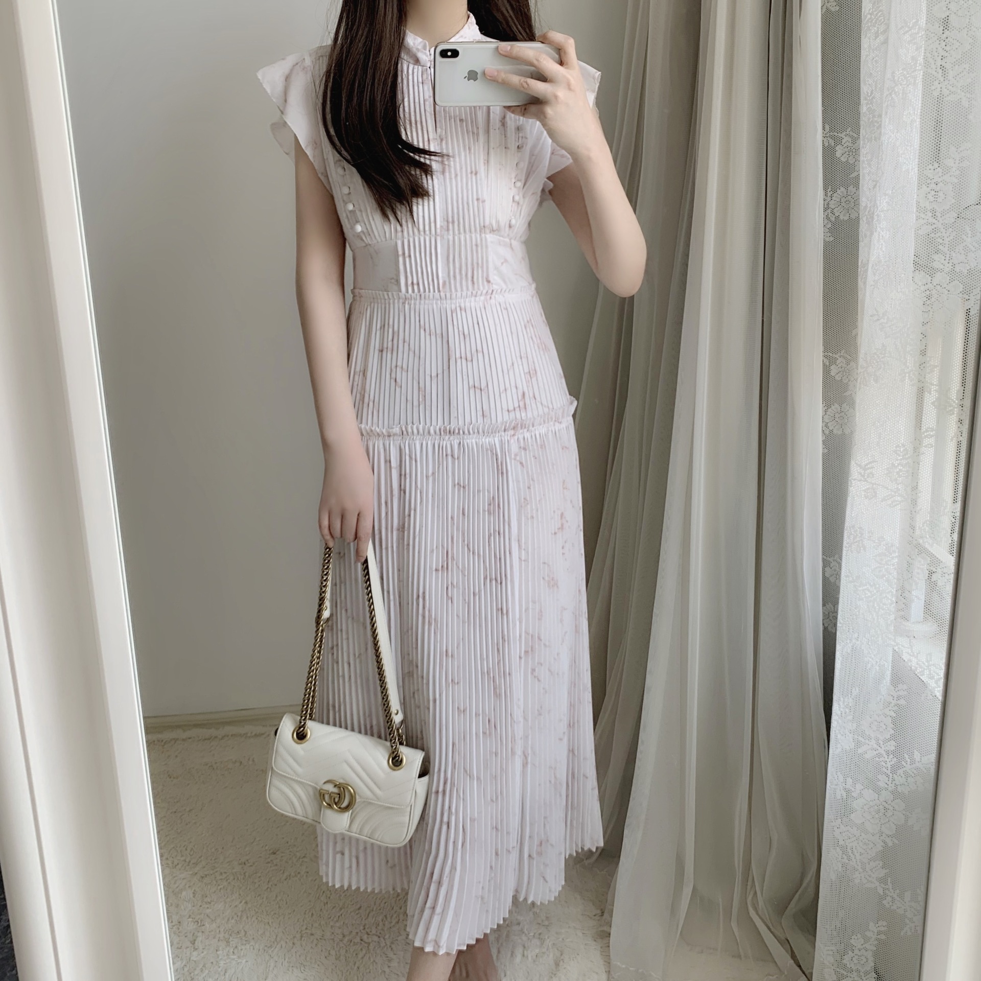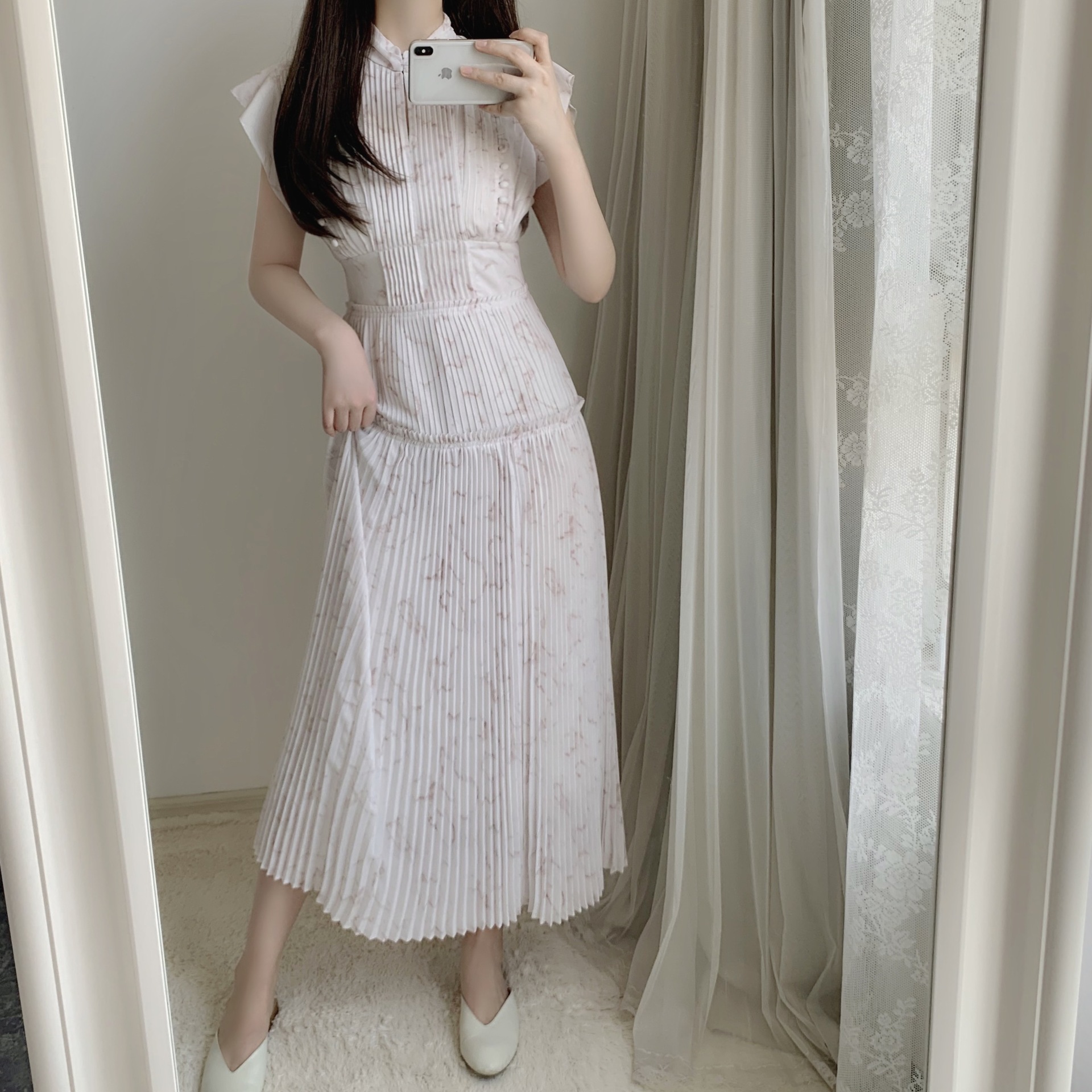 【新鮮なフェミニティを醸すストーン柄プリーツワンピース】