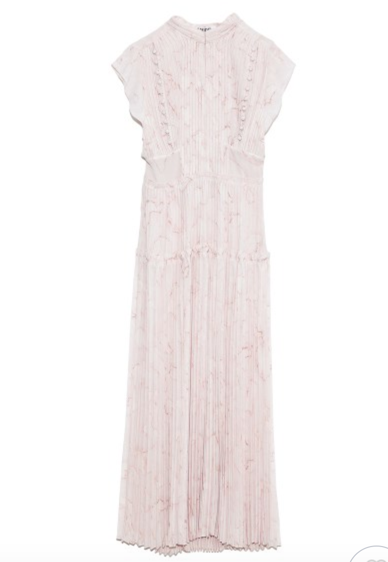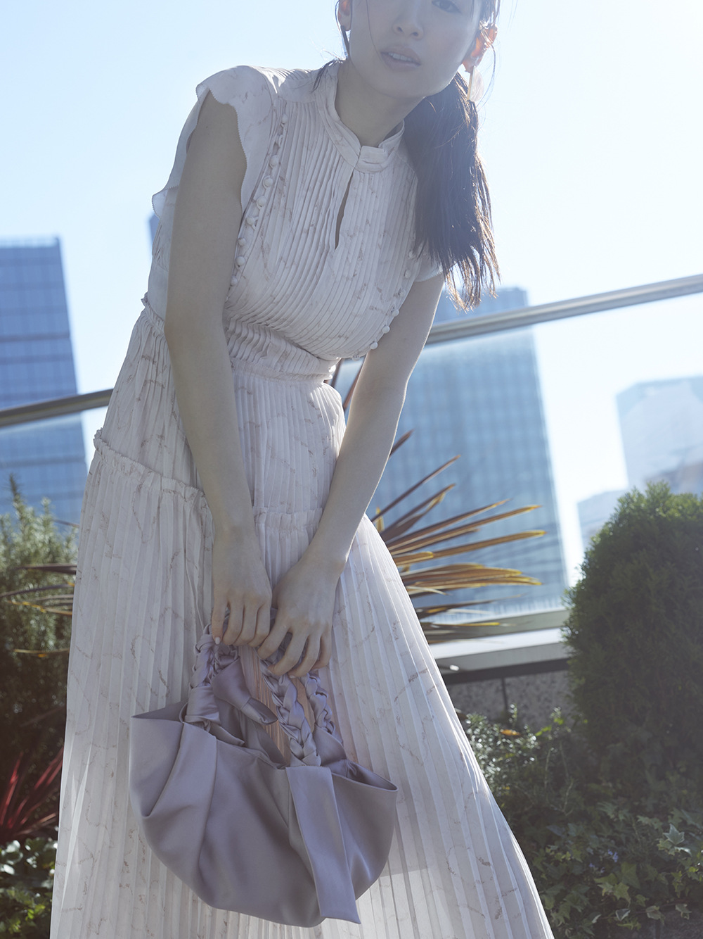 繊細なタッチで描かれたストーンモチーフをパネルに分けて、大胆にプリントしました。優美に映えるプリーツや、バックスタイルのレースアップがセンシュアルなムードを引き立てます。