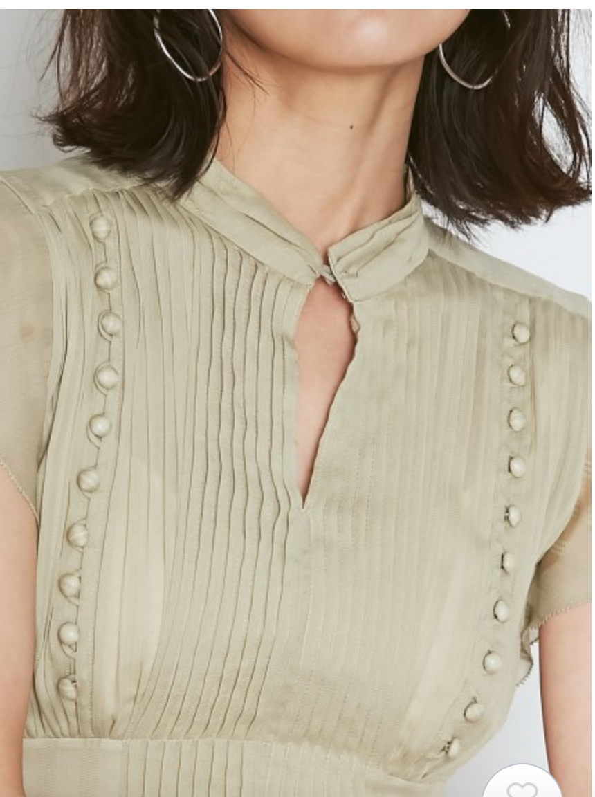 スタンドカラーで上品に見せつつ、デコルテの肌見せでさりげない色気も加味。フリル仕様になったスイートなフレンチスリーブには、二の腕カバー効果も期待できます。