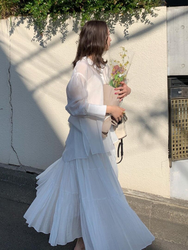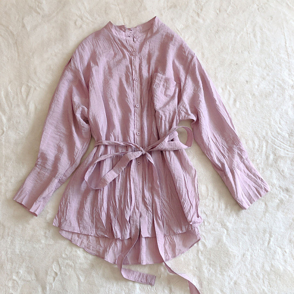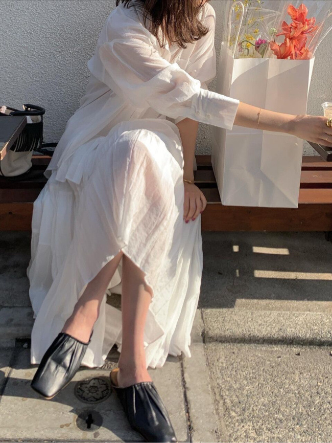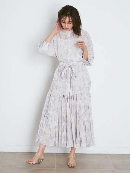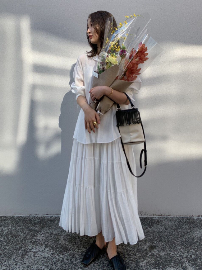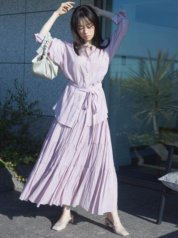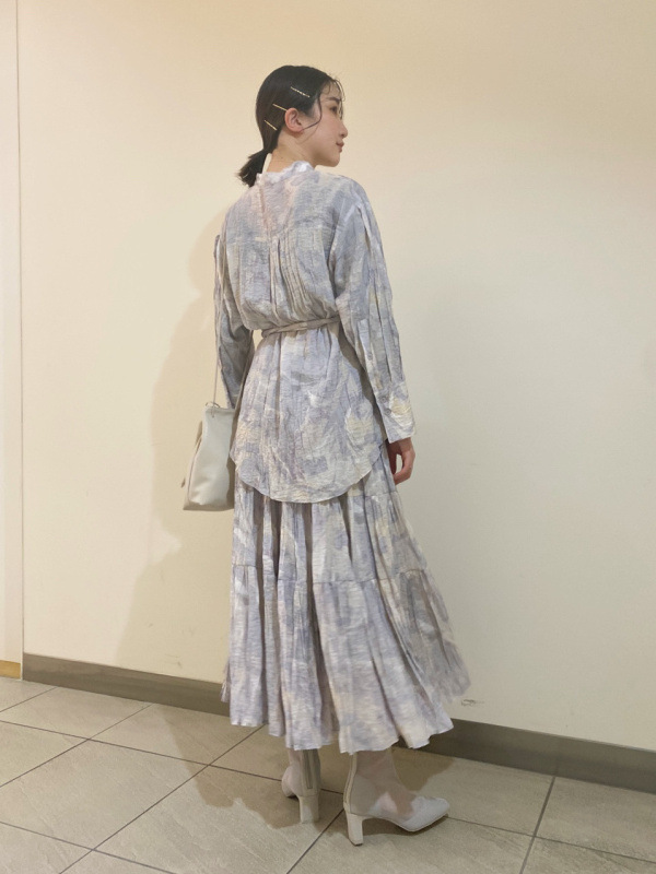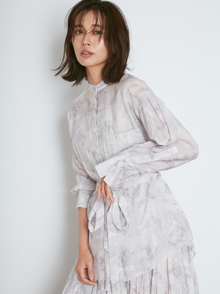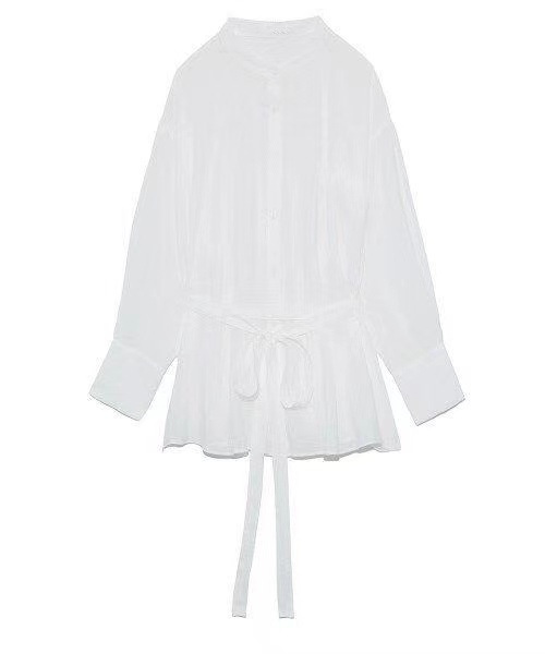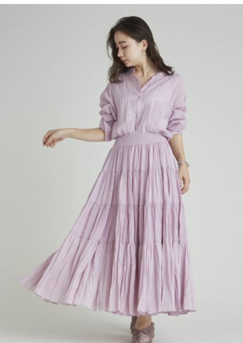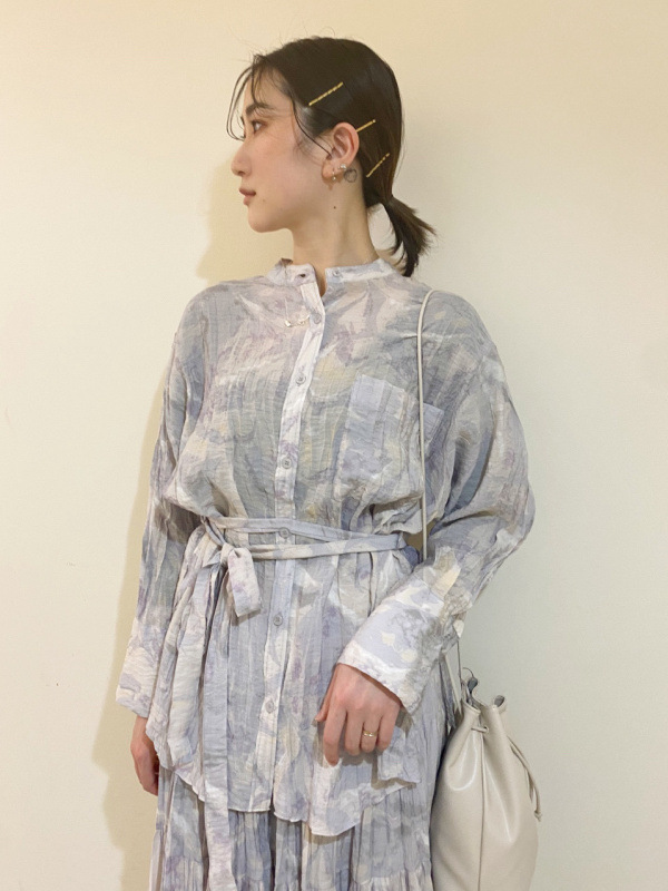 端正なスタンドカラーシャツを、クシュっとした質感のシアー素材と、長め丈でこなれたイメージに変換しました。ボトムアウトで着用しつつ、共布リボンでウエストマークをする肩肘張らない着こなしが気分です。サイドスリットが入っているので、リズムも生まれて◎。ゆったりとした着心地のオーバーサイズなので、共布リボンを外して羽織りとして活用することも。シアーボリュームティアードスカート(品番SWFS211133)とのセットアップでのコーディネートもおすすめです。