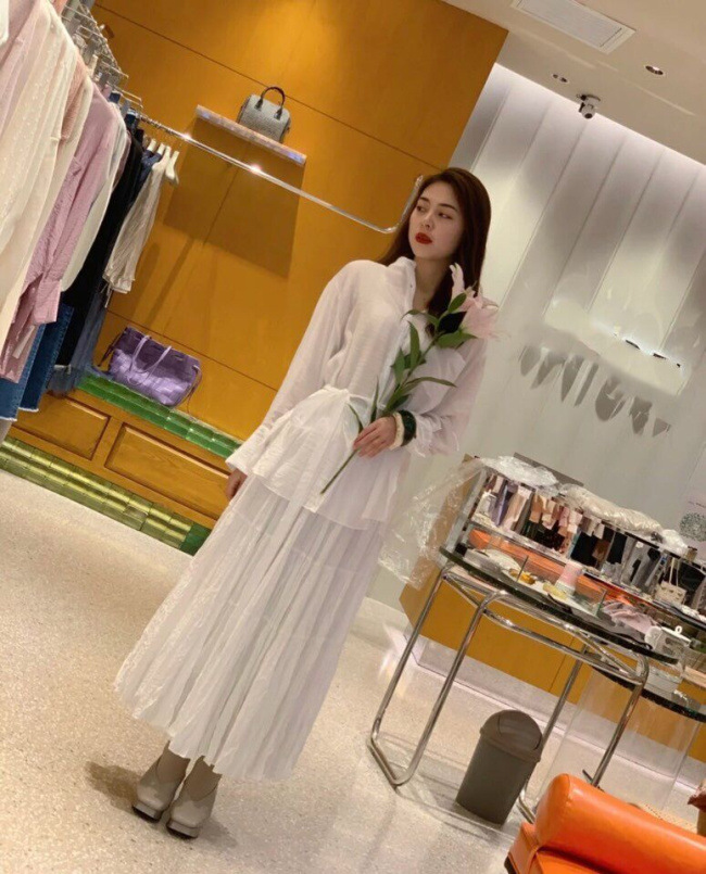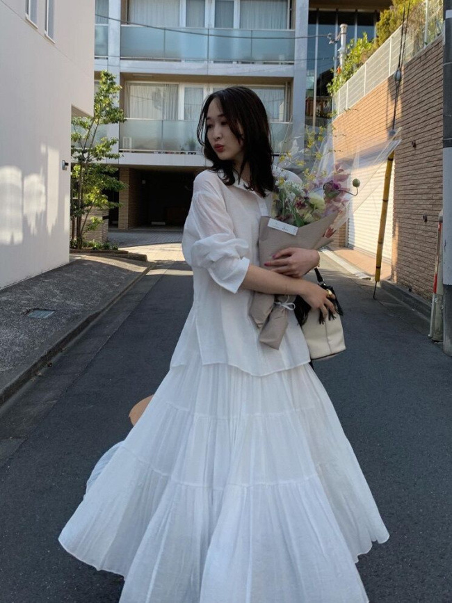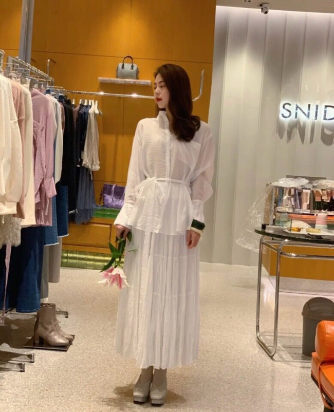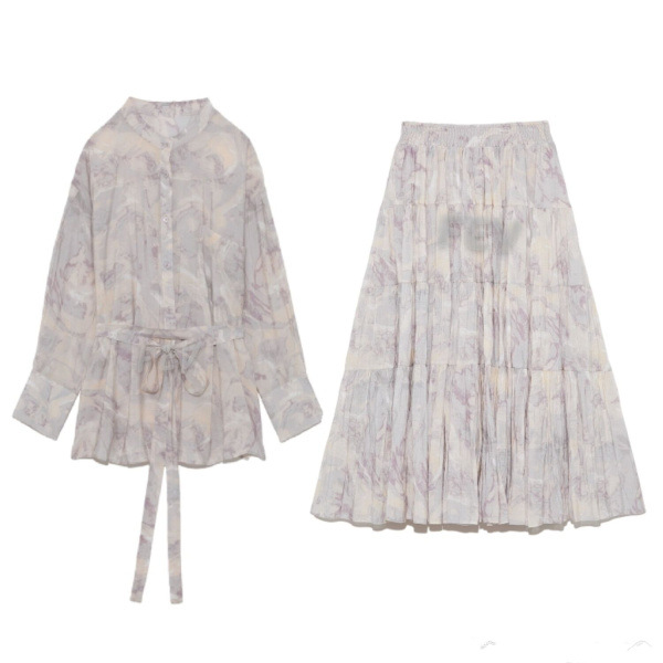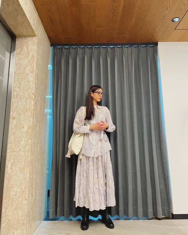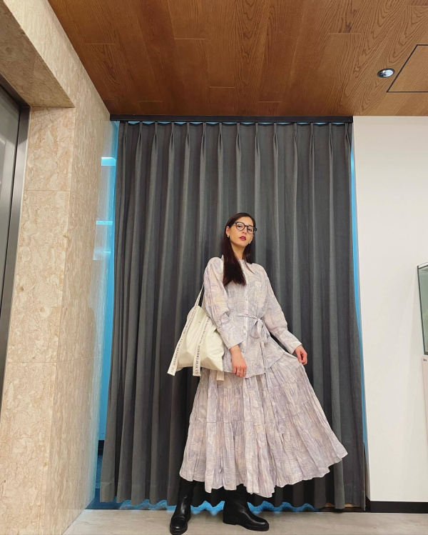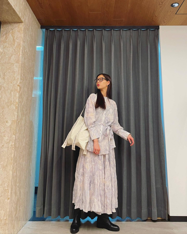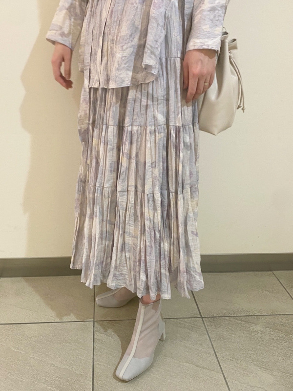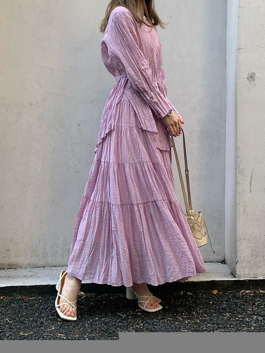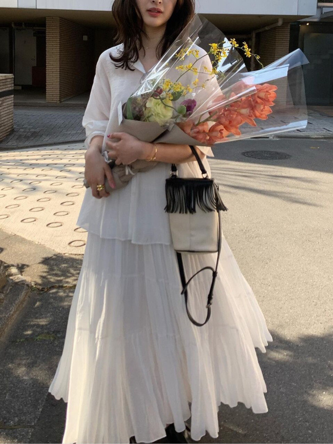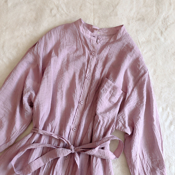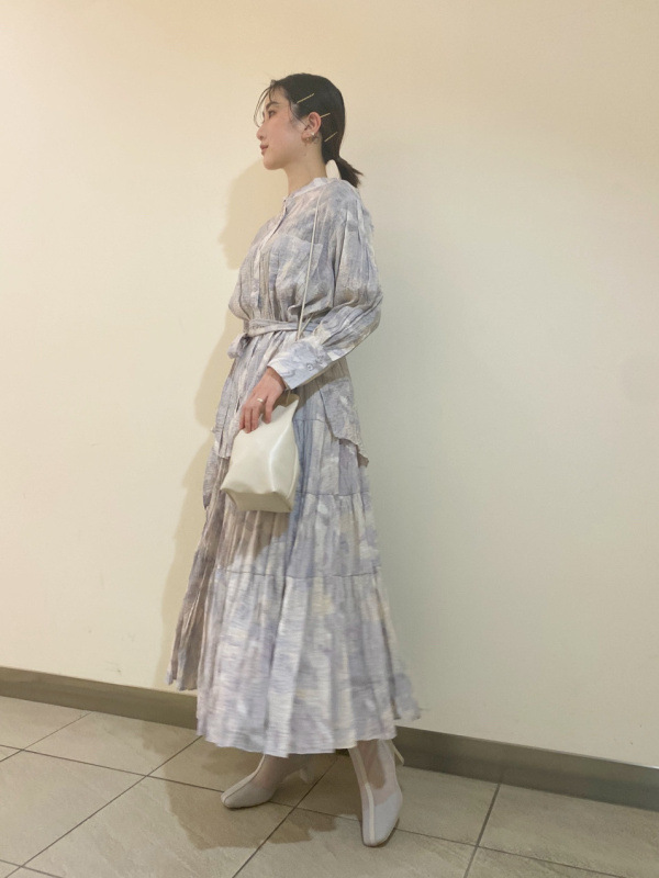 端正なスタンドカラーシャツを、クシュっとした質感のシアー素材と、長め丈でこなれたイメージに変換しました。ボトムアウトで着用しつつ、共布リボンでウエストマークをする肩肘張らない着こなしが気分です。サイドスリットが入っているので、リズムも生まれて◎。ゆったりとした着心地のオーバーサイズなので、共布リボンを外して羽織りとして活用することも。シアーボリュームティアードスカート(品番SWFS211133)とのセットアップでのコーディネートもおすすめです。