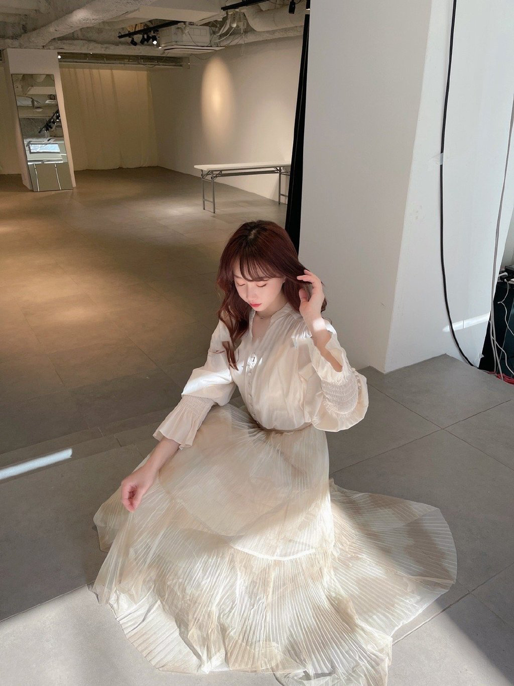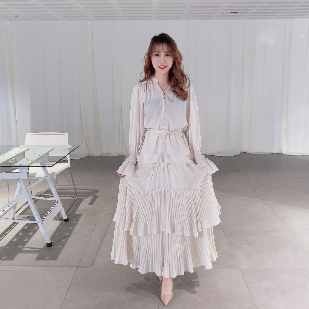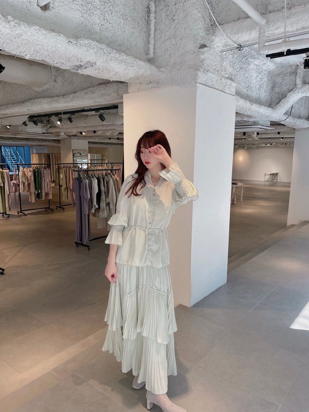 袖のシャーリングやフロントのボタン使いも、着映えをアシスト。スラックスなどを合わせると、きれいめリラクシーな装いが完成。同シリーズのスカート(品番SWFS211127)とのセットアップ着用もおすすめです。