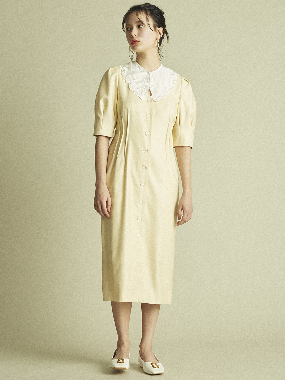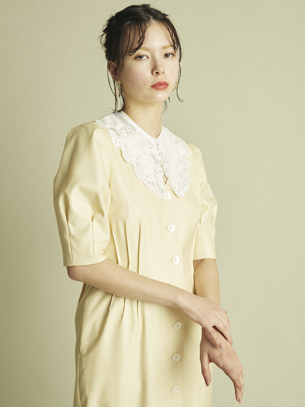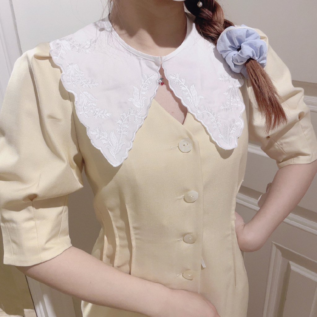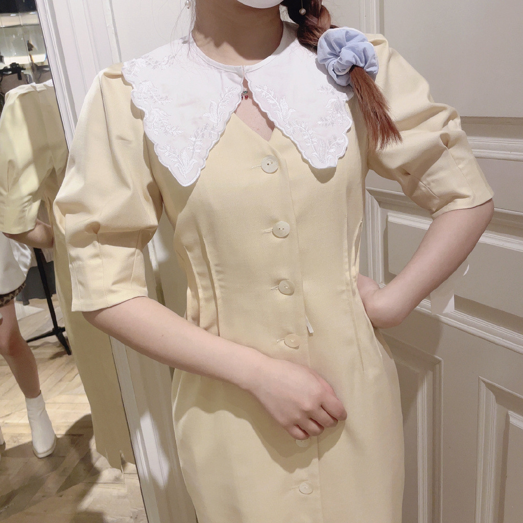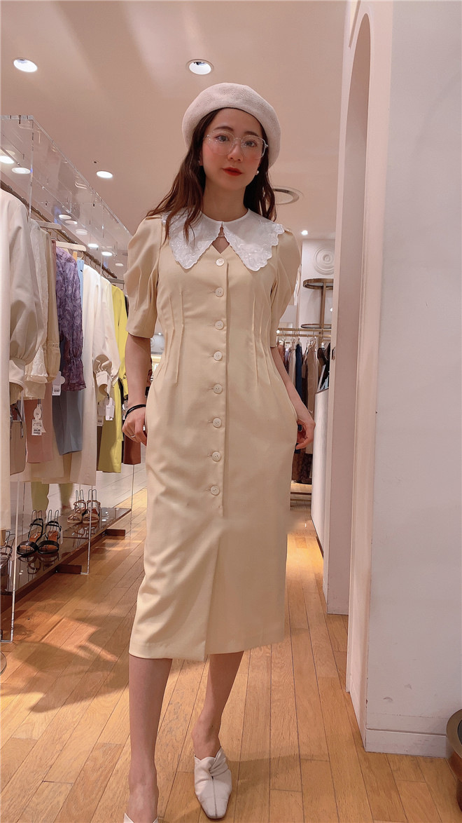 Lily Brown定番のフロントボタンワンピースが今季も登場しました。大きめのコットンつけ襟をセットし、トレンド感とガーリームードたっぷりに。襟を外すとシンプルなVネックになっており、異なるふたつの表情で楽しめます。つけ襟は単品使いも可能なので、お手持ちのニットやカットソーに合わせても◎。お好みのフィット感で着ていただけるように、サイズは2展開ご用意し、バックウエストをゴム仕様にしました。