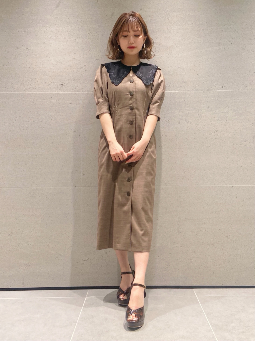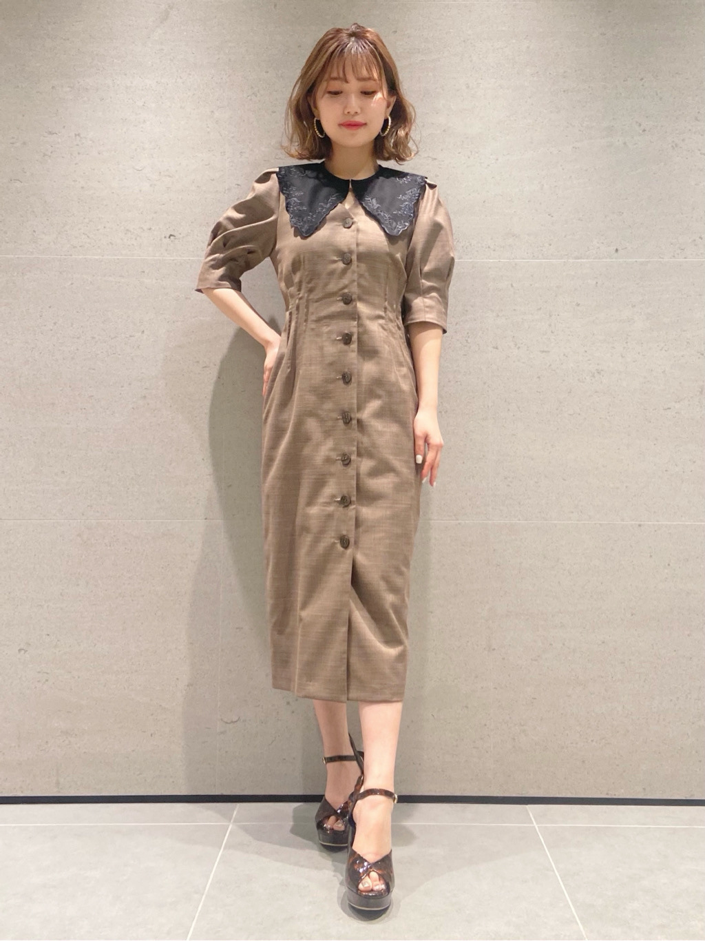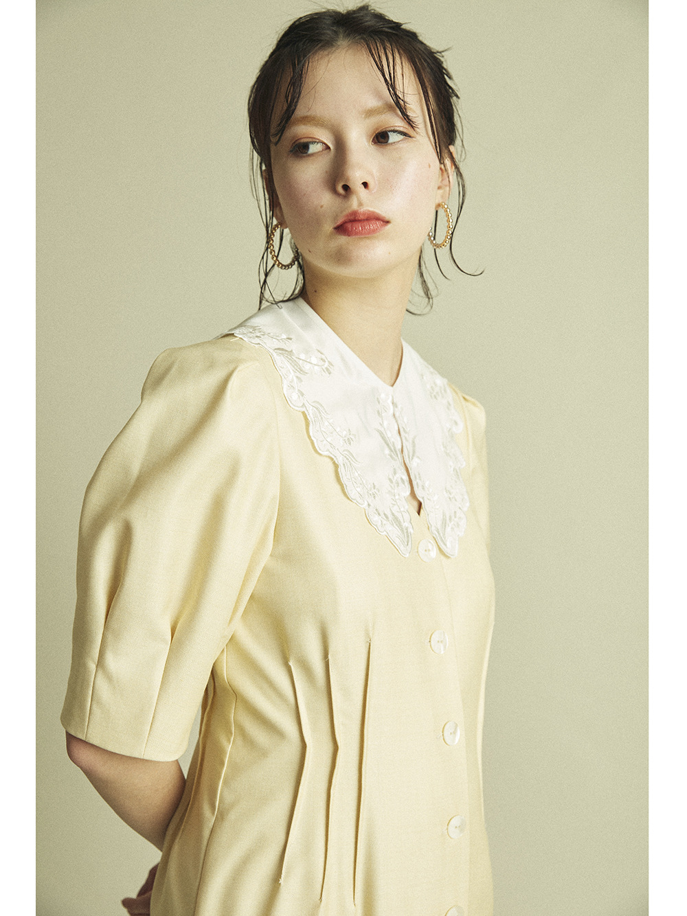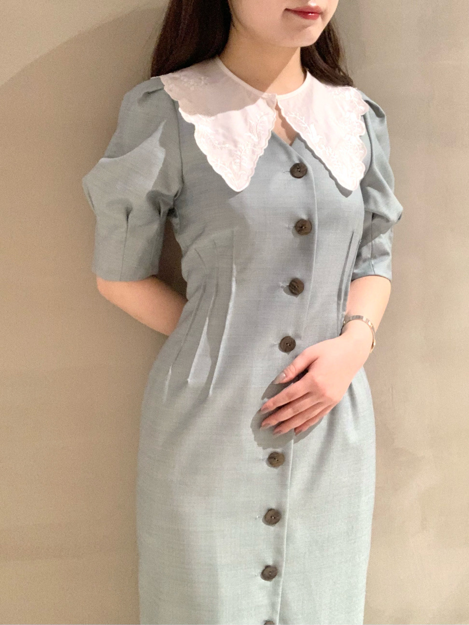 Lily Brown定番のフロントボタンワンピースが今季も登場しました。大きめのコットンつけ襟をセットし、トレンド感とガーリームードたっぷりに。襟を外すとシンプルなVネックになっており、異なるふたつの表情で楽しめます。つけ襟は単品使いも可能なので、お手持ちのニットやカットソーに合わせても◎。お好みのフィット感で着ていただけるように、サイズは2展開ご用意し、バックウエストをゴム仕様にしました。