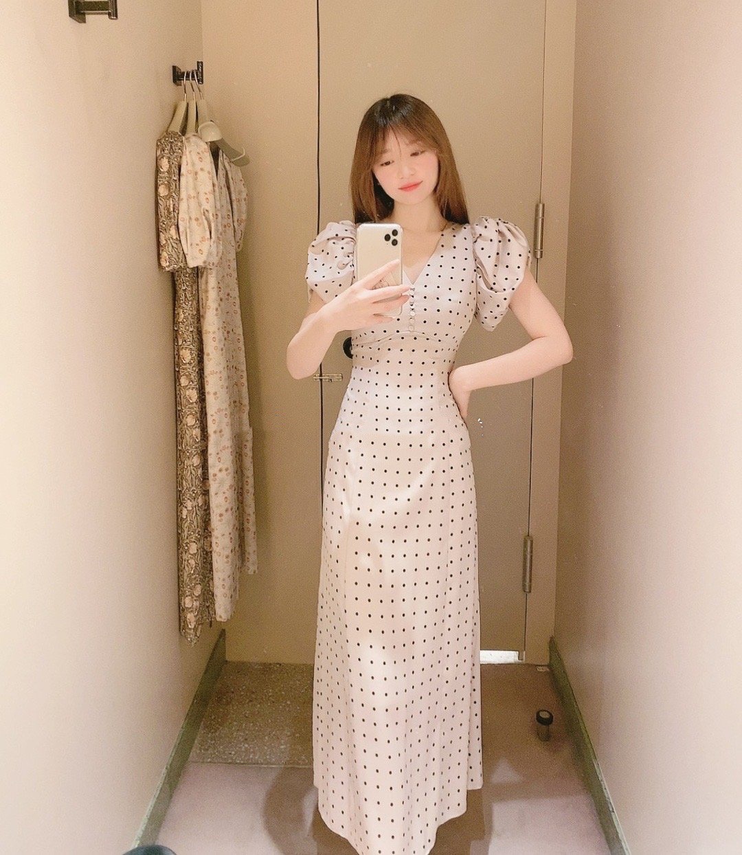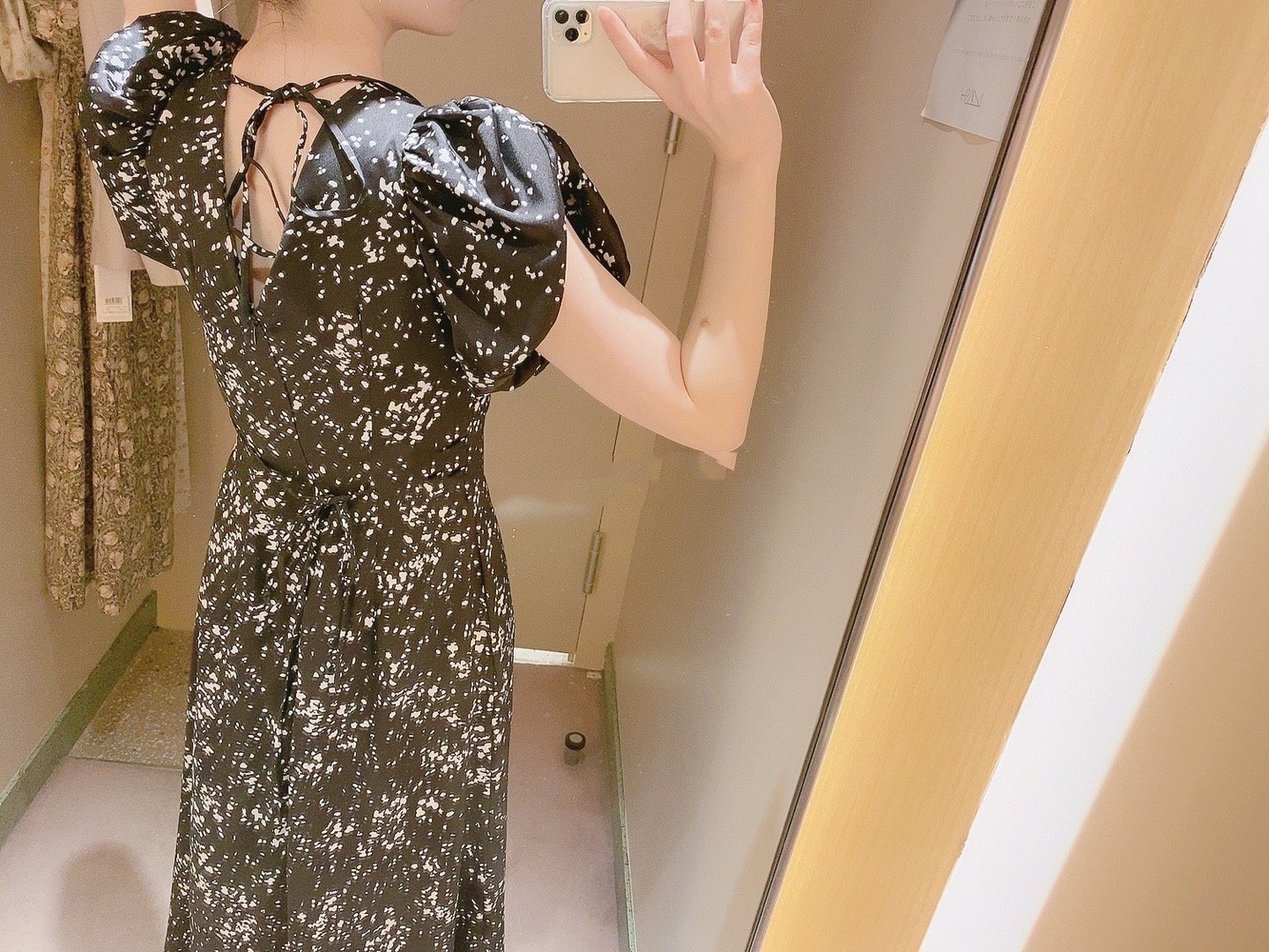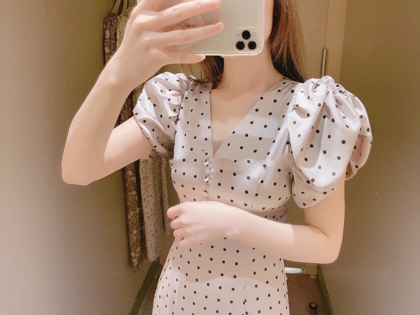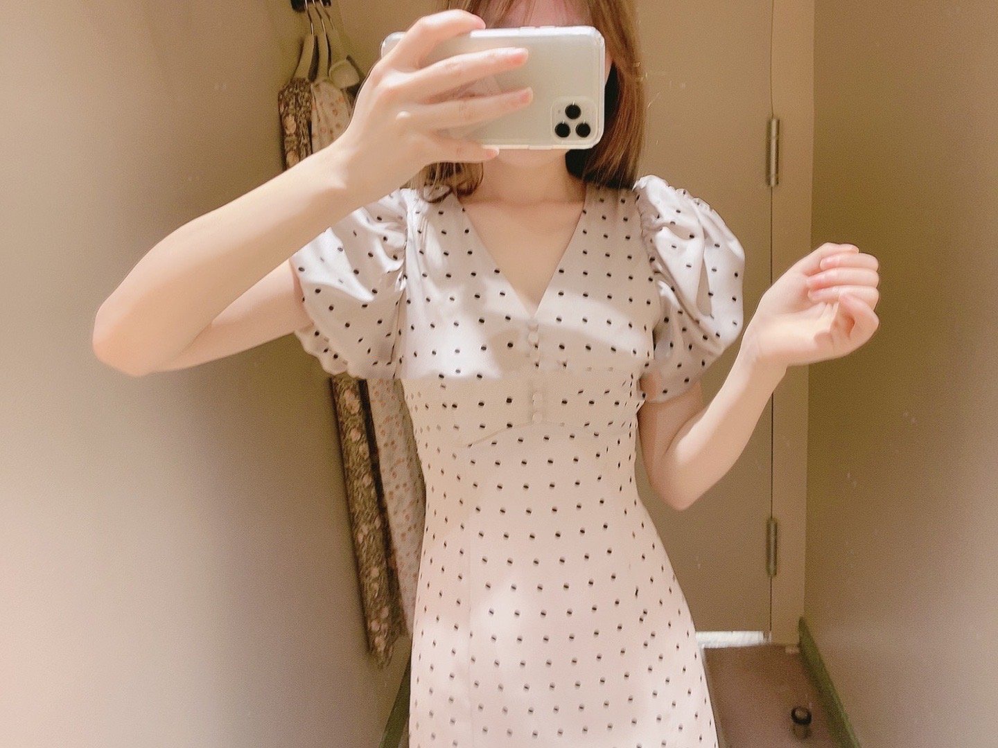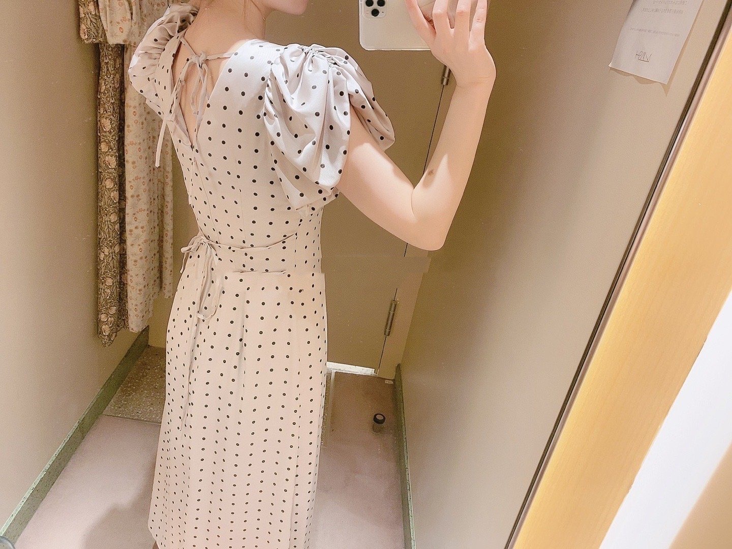 Sustainaギャザーパフスリーブドットワンピース